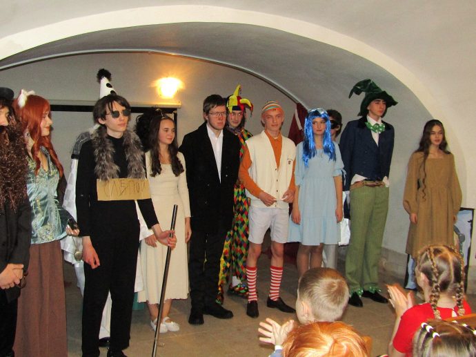 Артисты театральной студии добровольческого центра представили зрителям постановку по мотивам сказки «Золотой ключик». Однако, за знакомым сюжетом скрывался глубокий смысл: юные актеры искали ответ на извечный вопрос о смысле человеческого бытия и делились со зрителями сокровенным знанием о том, где же находится ключ от райских дверей.