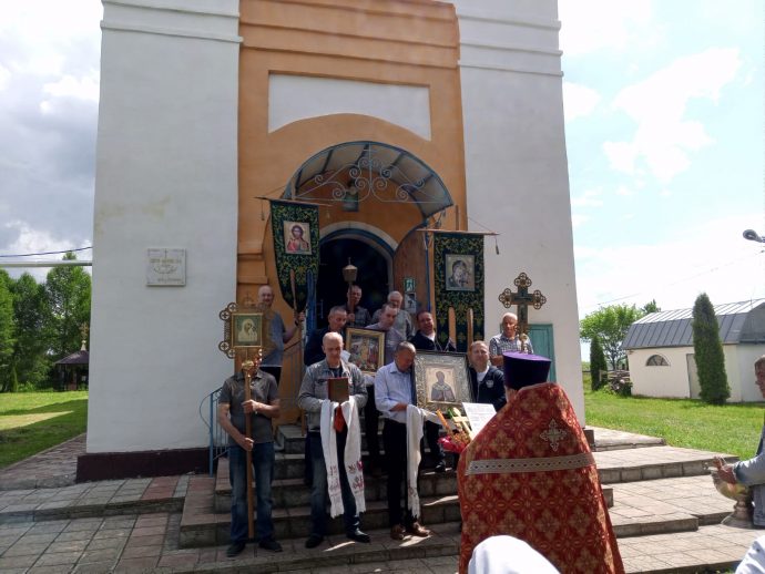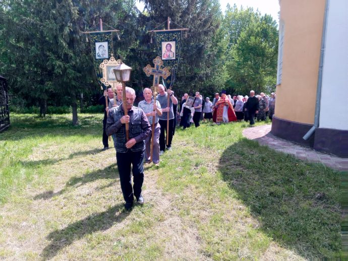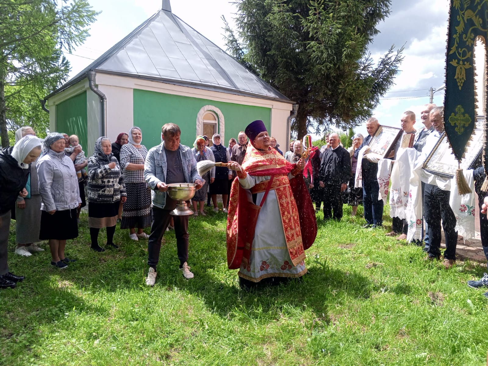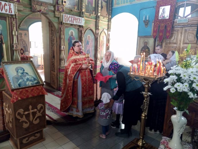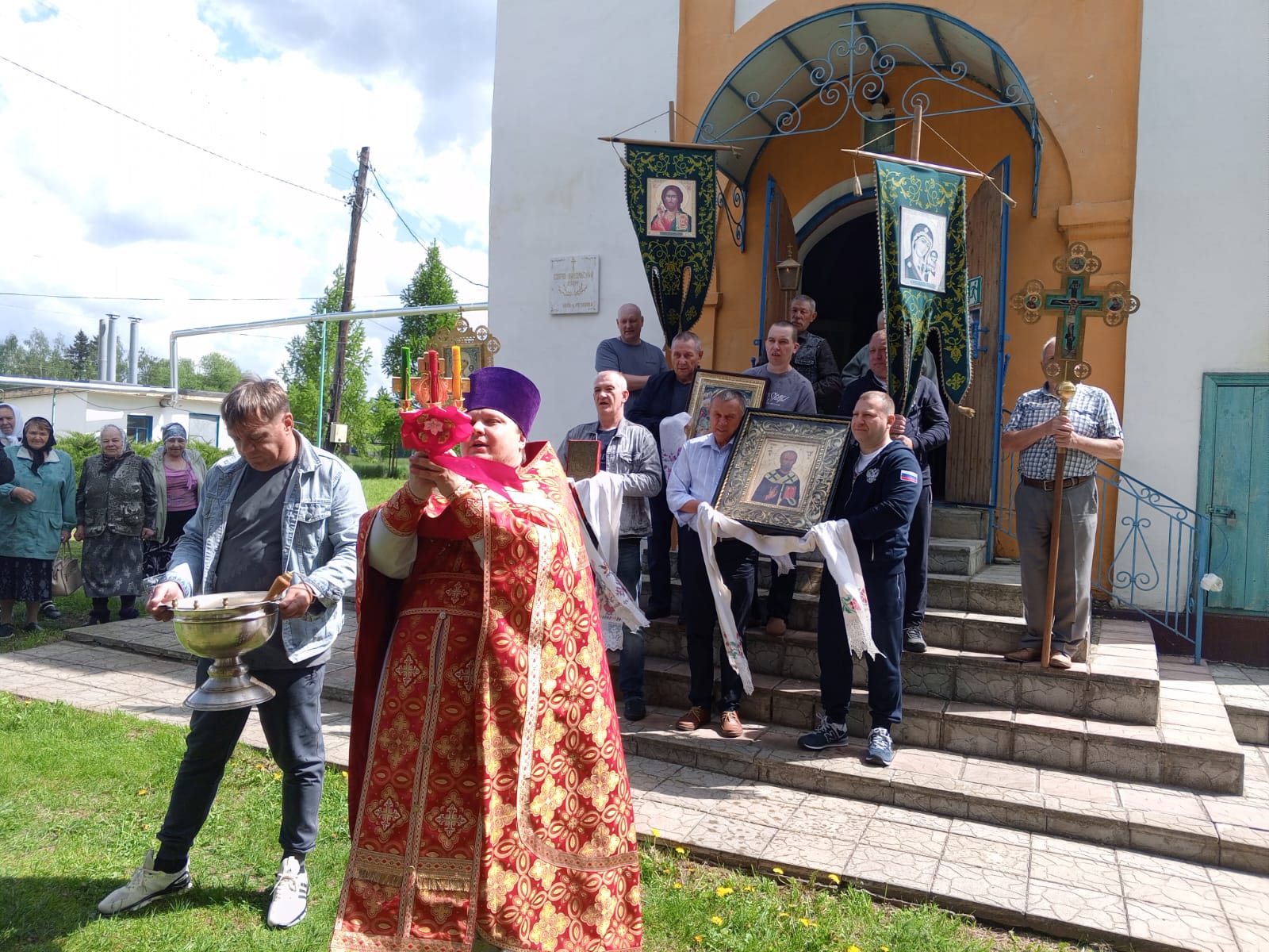 По завершении Литургии отец Павел с клиром и прихожанами с пением тропарей Пасхи и Николаю Чудотворцу прошли крестным ходом вокруг храма, после чего священник окропил всех святой водой.