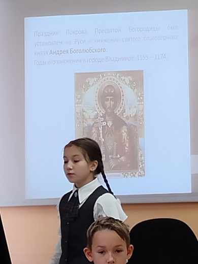 В процессе презентации, представленной Матрёной Завражиной об истории великого праздника Покрова Пресвятой Богородицы, дети узнали о чудесном явлении, произошедшем в Константинополе, когда во время осады города Матерь Божия простерла Свой омофор (покров) над верующими, спасая их от врагов. После этого чуда враг отступил, и город был спасен от разорения. На Руси праздник Покрова Пресвятой Богородицы был установлен князем Андреем Боголюбским и стал важным церковным и народным торжеством.