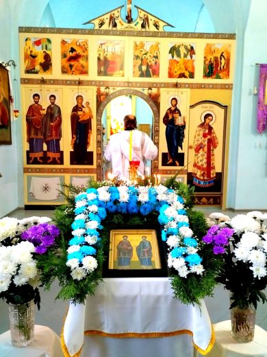 После Литургии состоялся праздничный крестный ход вокруг храма. Участники шествия, неся иконы и хоругви, воздавали хвалу святым бессребреникам и просили их молитвенного заступничества.
