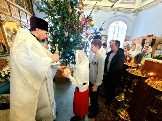 Настоятель Казанского храма иерей Димитрий Броновицкий обратился к ученикам воскресной школы со словами поздравления. Священник поблагодарил детей за стройное благолепное пение и усердие, с которым они готовились к праздничным мероприятиям в честь рождения Богомладенца.