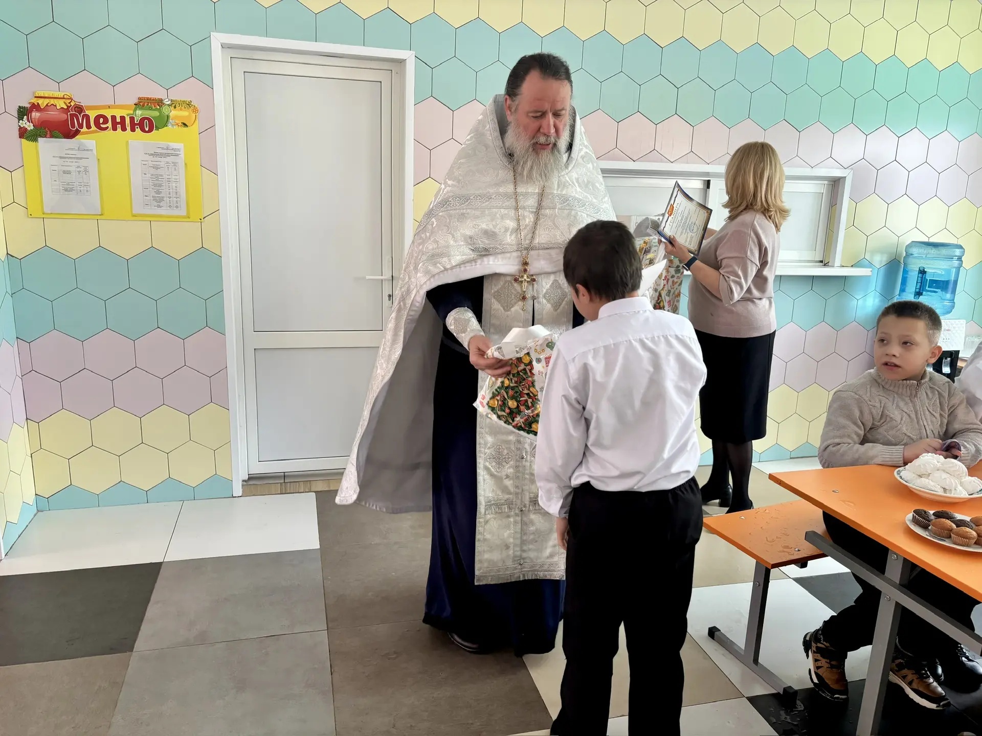 Батюшка поблагодарил детей и вручил грамоты и подарки за участие в конкурсе «Красота Божьего мира». Учащиеся надомного обучения также получили сладкие презенты.
