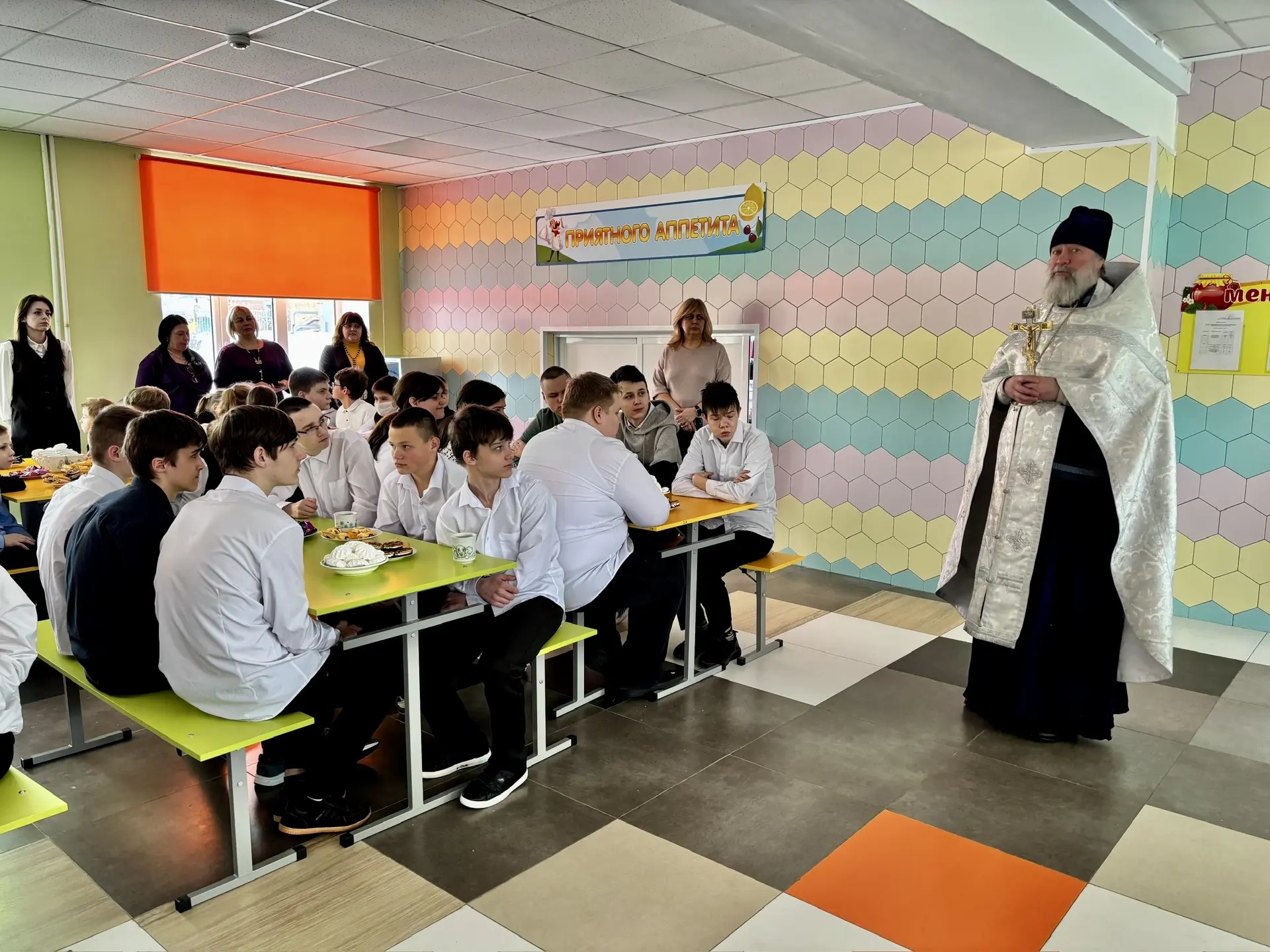 Протоиерей Анатолий Колонтаев поздравил весь преподавательский состав, работников и учащихся с праздниками Рождества и Крещения Господня. По доброй традиции отец Анатолий пришел к детям со сладким угощением. В тёплой дружественной обстановке священник пообщался с детьми и преподавателями.