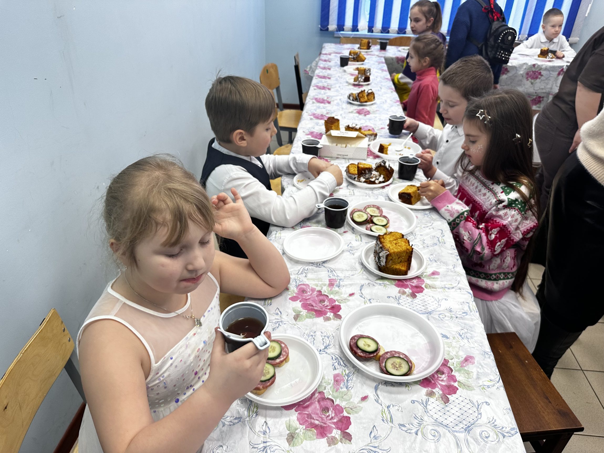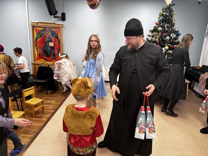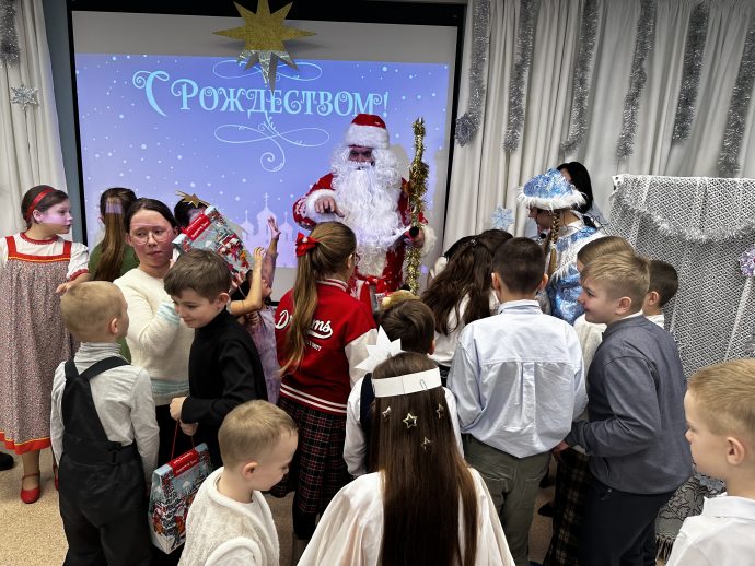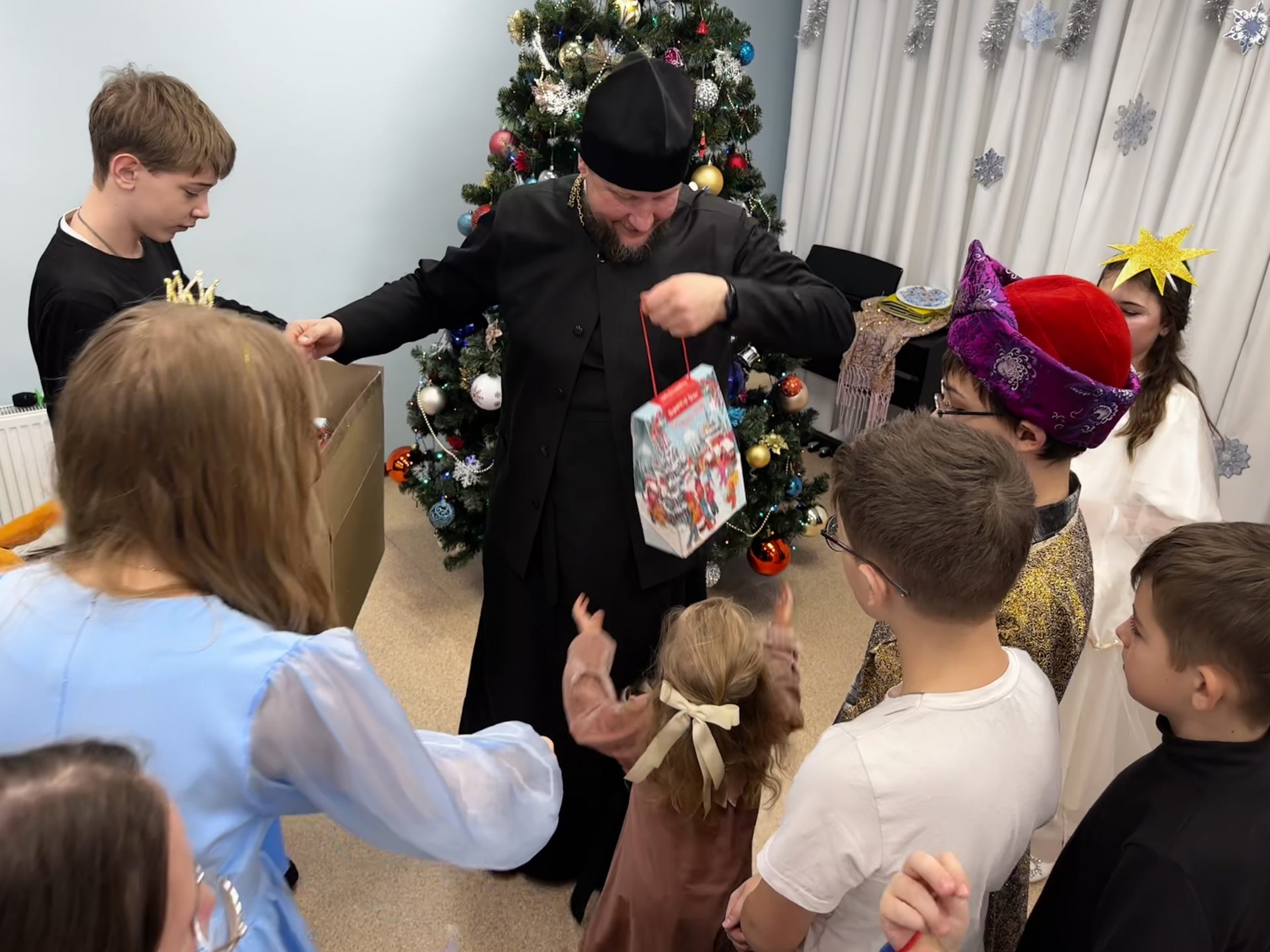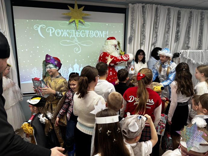 По завершение концерта всем детям были вручены сладкие рождественские подарки, после чего состоялось общее чаепитие.