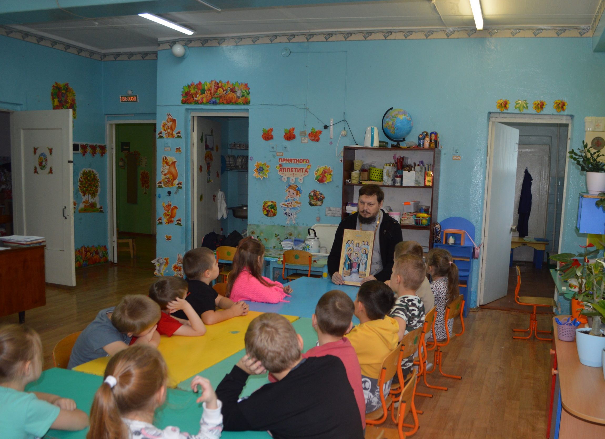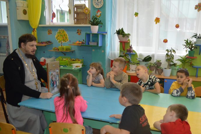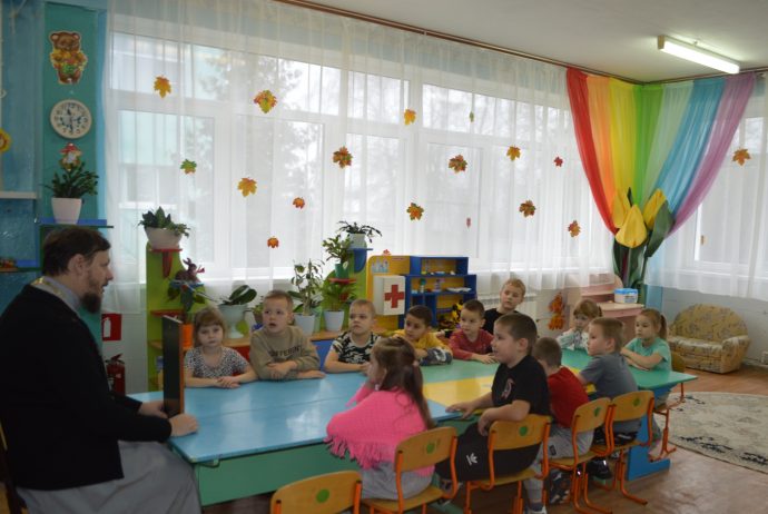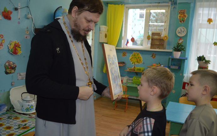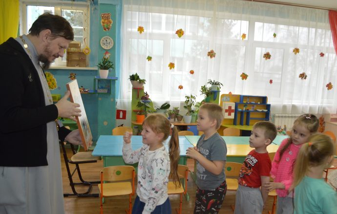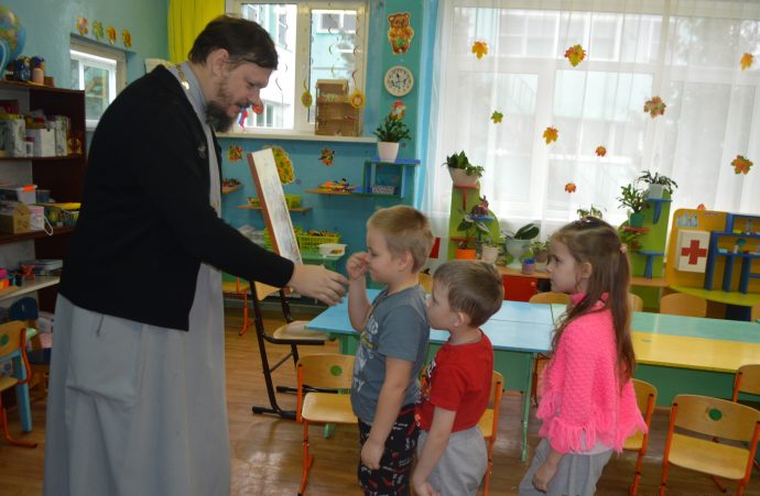 С самого начала своего служения в поселке Волово иерей Владимир Федак постоянно проводит беседы с воспитанниками детского сада, помогая ребятам больше узнавать о Боге, Божией Матери, Ангелах и святых угодниках Божиих.