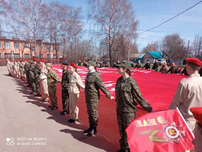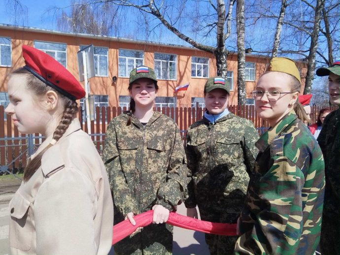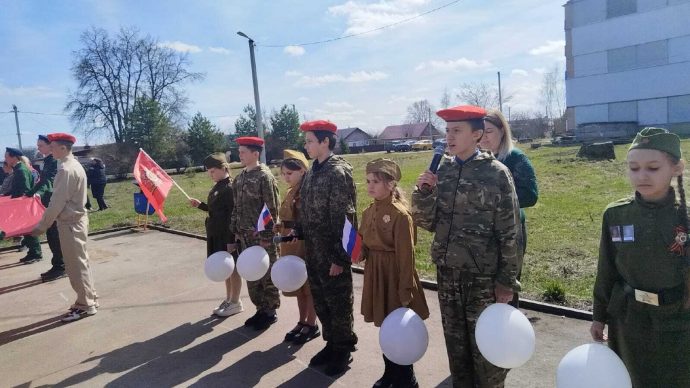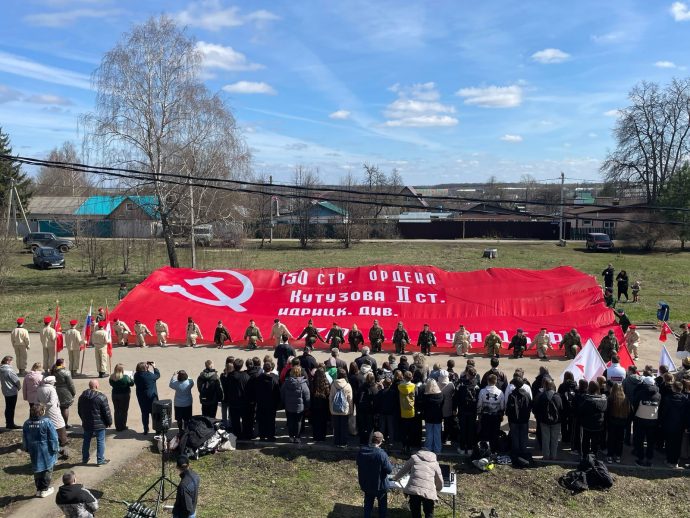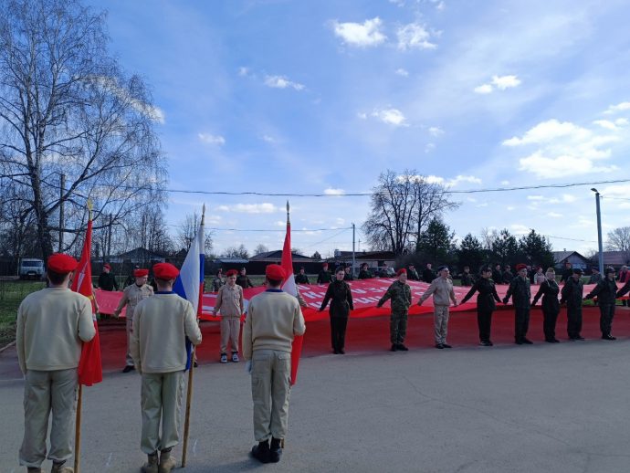 Затем активисты и волонтеры из школ Куркинского района развернули Знамя Победы, продемонстрировав свою преданность Родине и уважение к памяти участников войны.