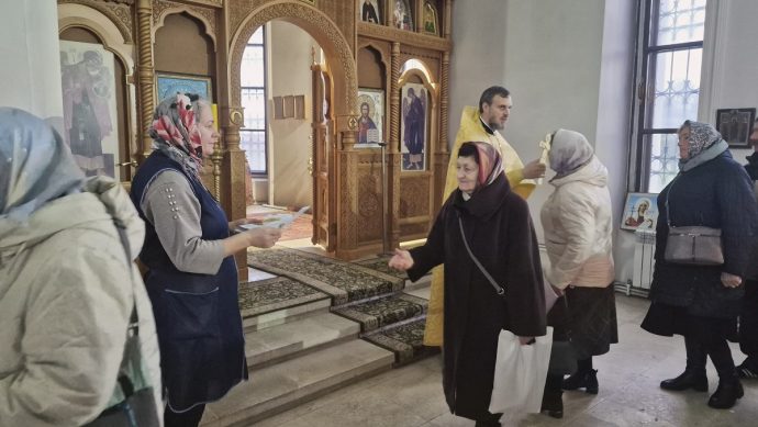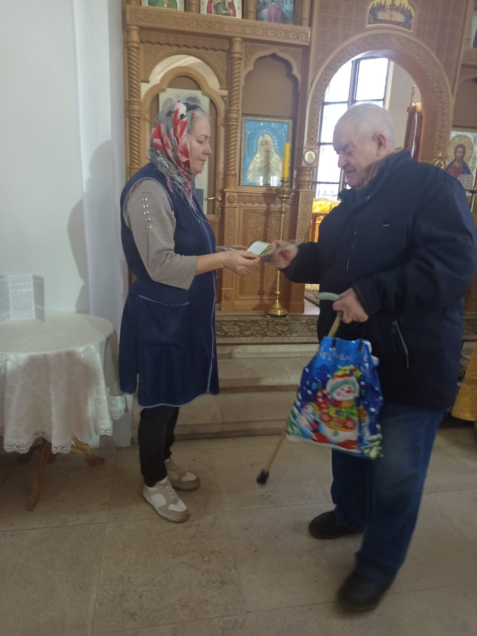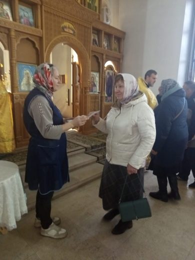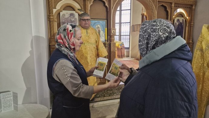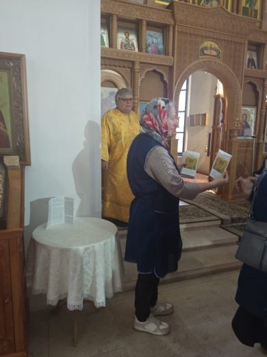 В Никольском соборе поселка Епифань по благословению настоятеля иерея Александра Звягина на праздник Собора Архистратига Михаила и прочих Небесных Сил бесплотных по окончании Божественной литургии работница храма Валентина Владимировна Ахмедова помогла настоятелю раздать листовки, содержащие сведения об истории и традициях праздника.