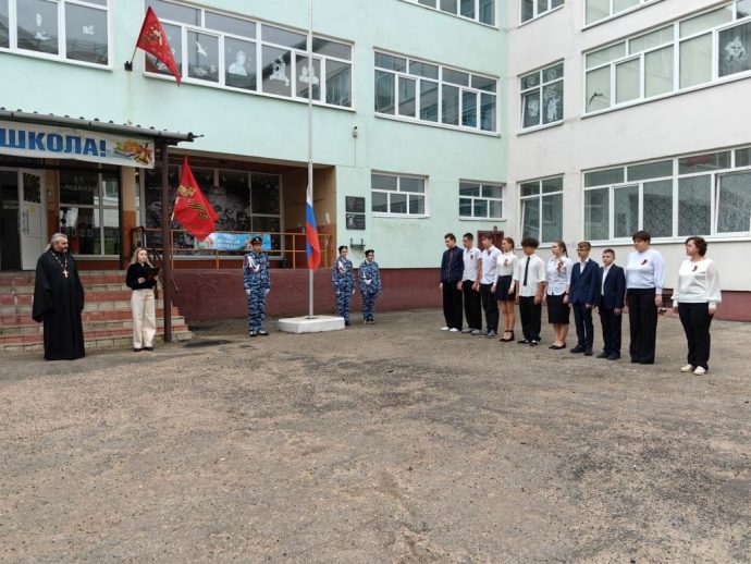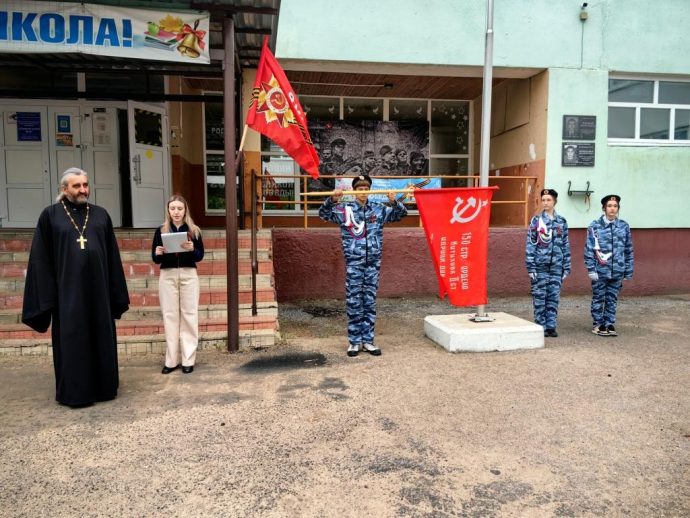 Приглашенный на урок настоятель храма святителя Луки Крымского поселка Восточный иерей Виталий Хлустиков предварительно посетил традиционную линейку, начавшуюся с торжественного выноса и представления Знамени Победы, а также исполнения Гимна Российской Федерации. Знамя Победы – символ героической истории России, важнейшая государственная реликвия страны.