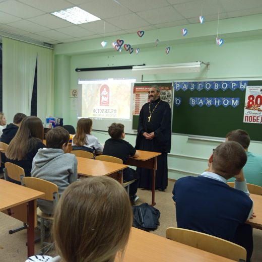 Затем отец Виталий и учитель родного языка Вера Тимофеева провели беседу с учащимися 6 б класса о значении Дня Победы, о важности помнить историю и передавать её следующим поколениям.