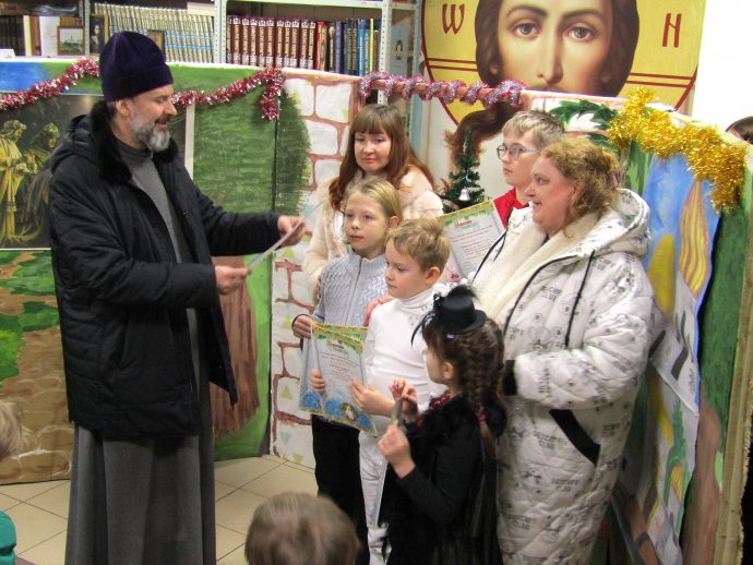 Настоятель Алексиевского храма протоиерей Олег Анохин поблагодарил участников международного конкурса-проекта «Наступает Рождество» и торжественно вручил им и руководителю семейного клуба «Радуга» Людмиле Ковтун заслуженные награды.