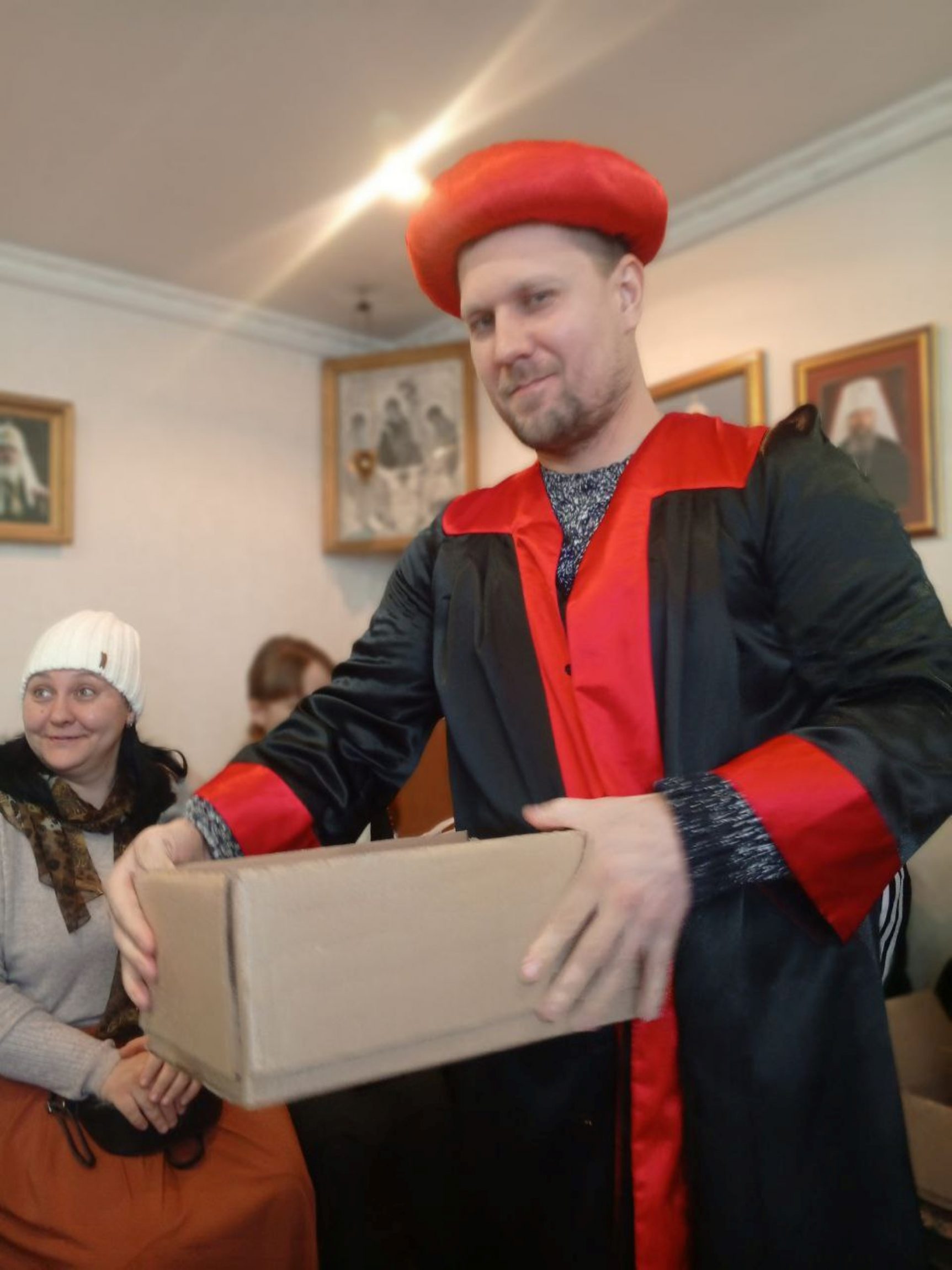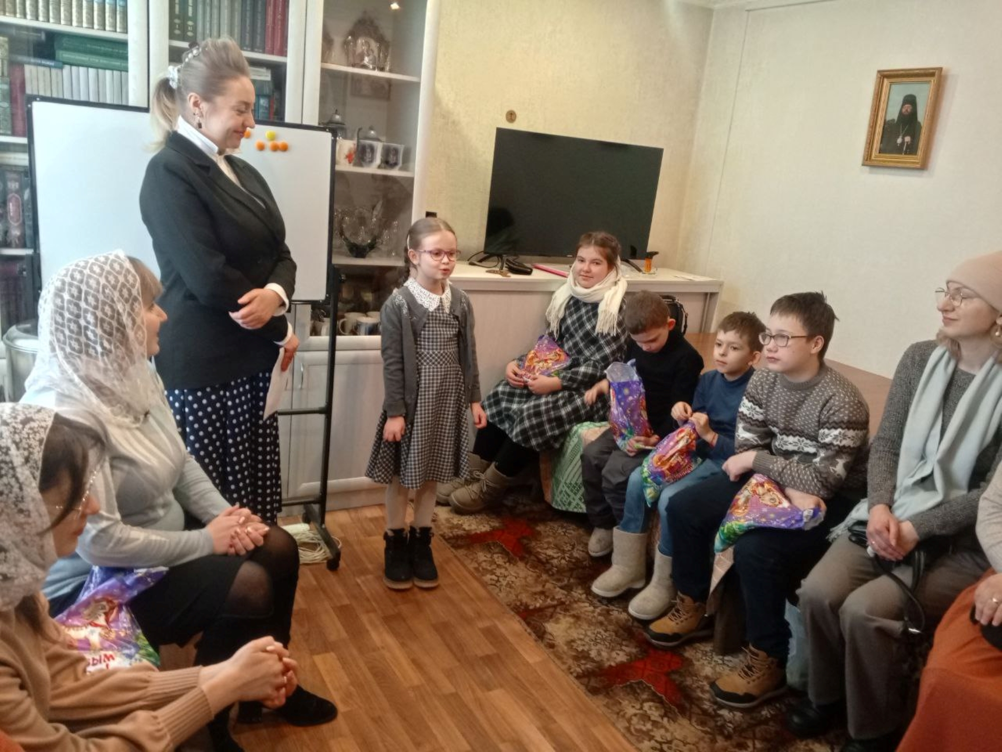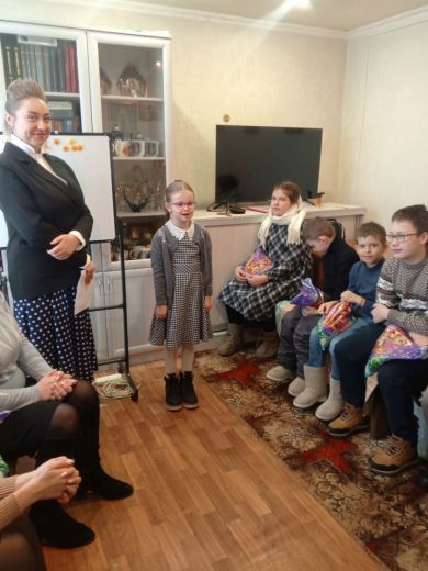 Затем детям были вручены рождественские подарки. А утренник продолжился играми и пением тропаря и кондака праздника Рождества Христова и рождественских колядок: «Щедрый вечер», «Эта ночь святая», «Торжествуйте, веселитесь» и других.