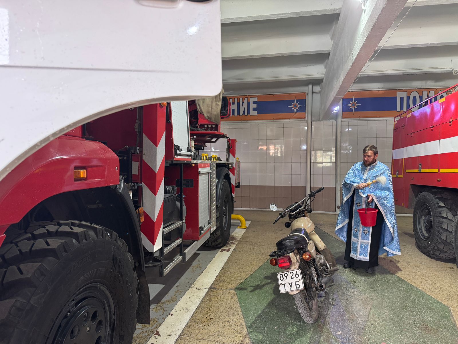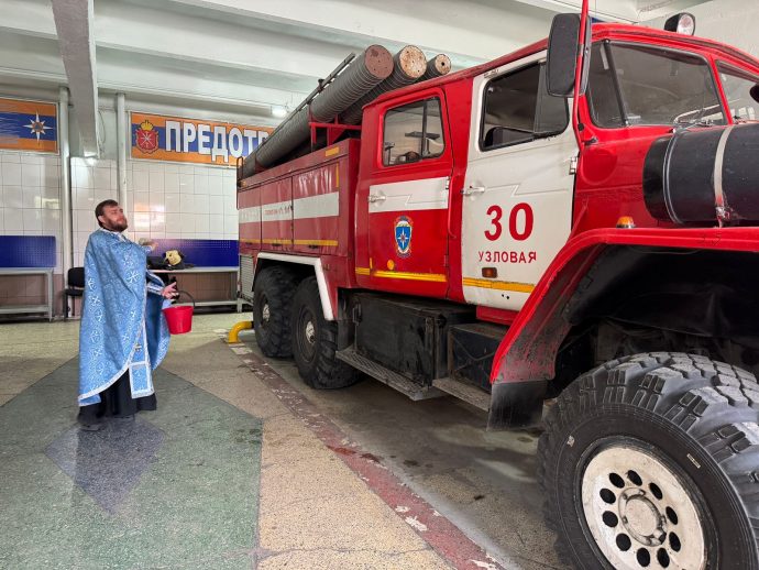 В этом году 30-ю пожарно-спасательную часть посетил настоятель храма блаженной Матроны Московской иерей Александр Гунба. Он совершил молебное пение Божией Матери, побеседовал с личным составом части и окропил святой водой пожарные автомобили, а также подготовленный узловскими спасателями для отправки в зону специальной военной операции, мотоцикл.