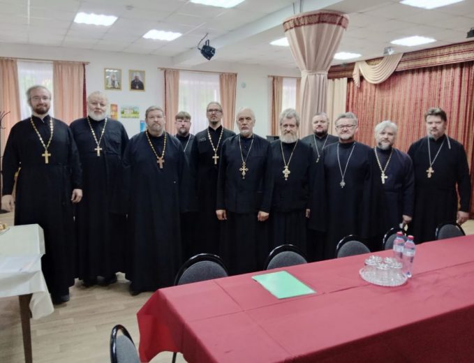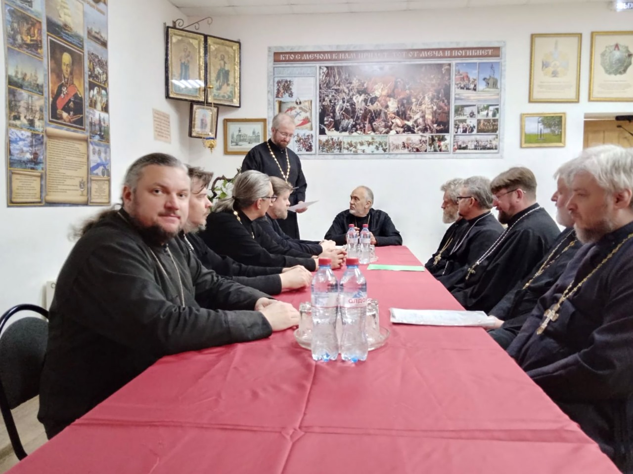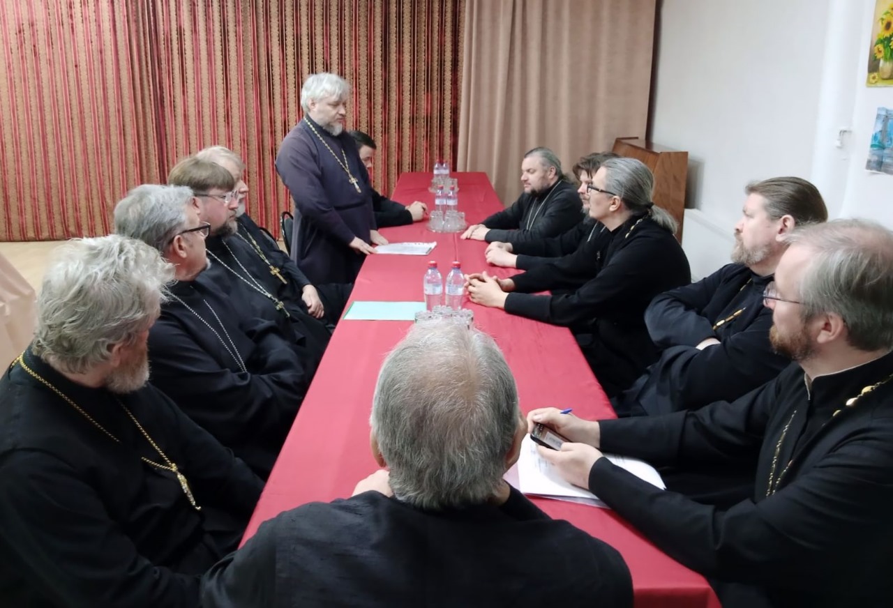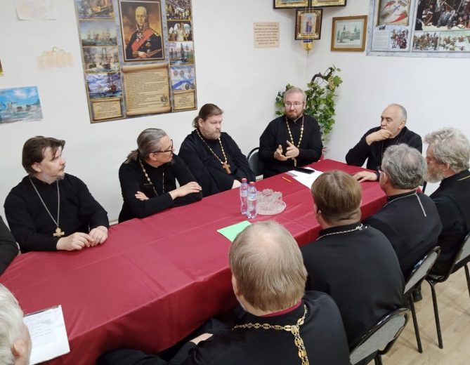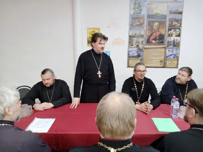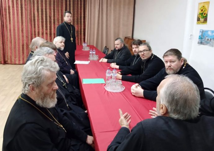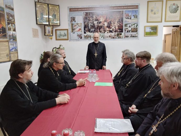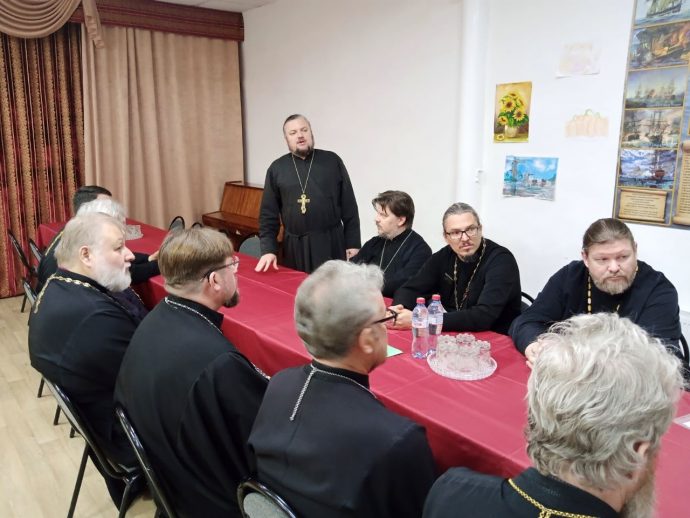 Затем иерей Антоний Фадеев, помощник благочинного, огласил текущую повестку дня, которая включала деятельность по окормлению руинированных и аварийных храмов, взаимодействие с профильными епархиальными отделами и некоторые организационные вопросы.