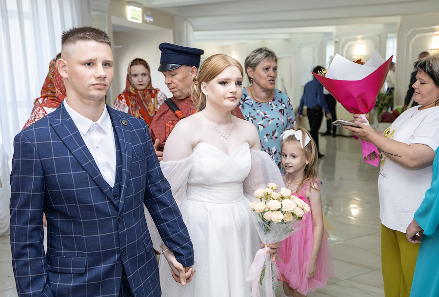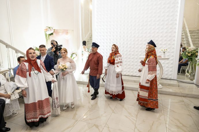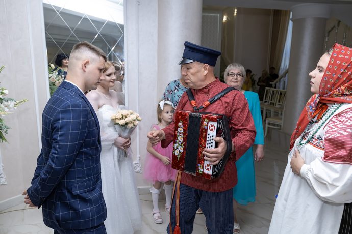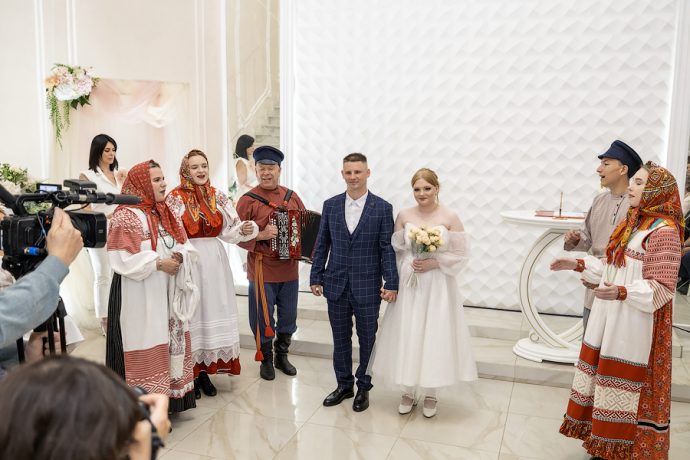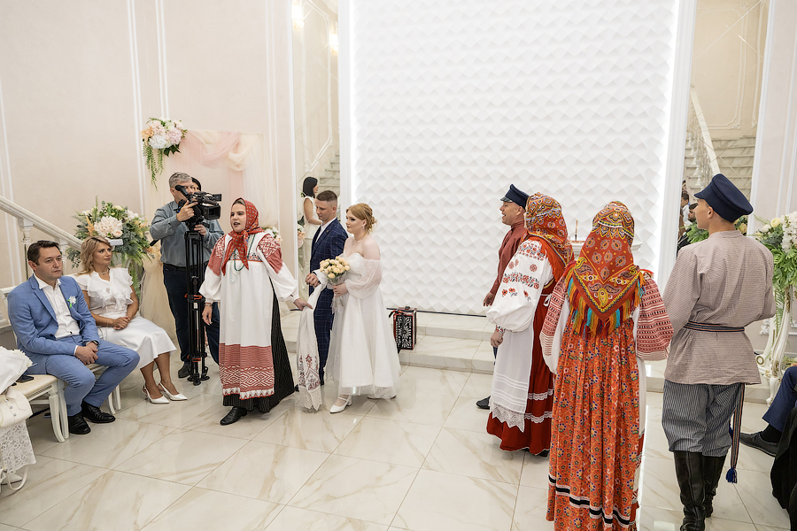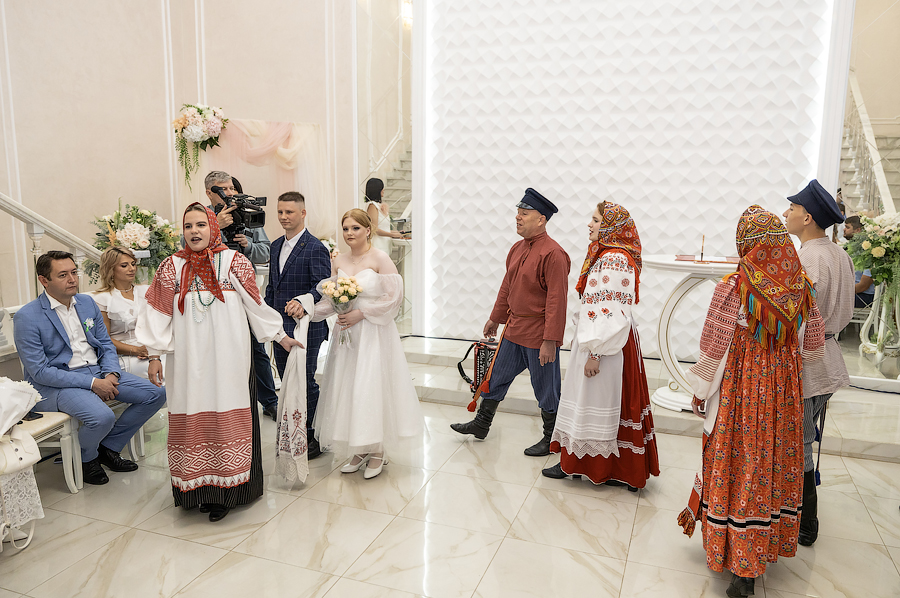 Затем в русских традициях семейного обряда под сопровождение народного фольклорного ансамбля «Спасская слобода» в счастливую жизнь вступили молодожены.