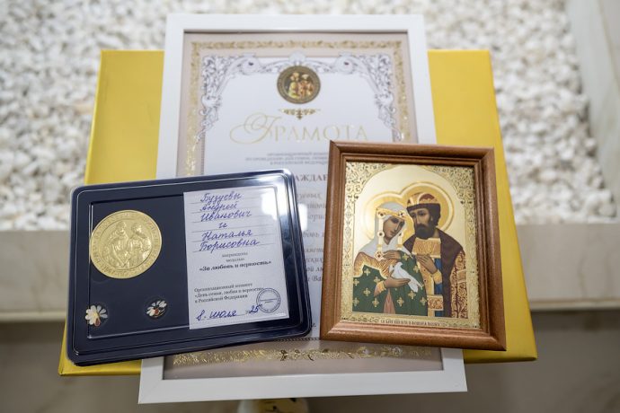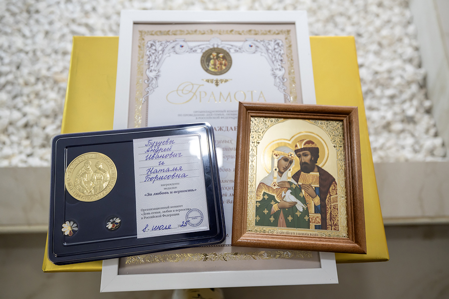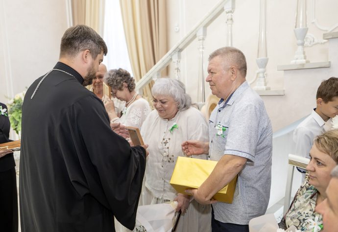 Клирик храма «Нечаянная Радость» иерей Ярослав Бреднев так же присоединился к поздравлениям. «Дорогие братья и сестры, – обратился батюшка к юбилярам, – позвольте от лица Новомосковского благочиния вседушевно поздравить вас с днем памяти святых благоверных князей Петра и Февронии и замечательным праздником Днем семьи, любви и верности. Святые являют нам высочайший пример любви друг к другу и к Богу, взаимоуважения». Отец Ярослав пожелал супружеским парам также быть ярчайшим примером для молодого поколения, давать пример православной благочестивой семьи. В благословение супружеству священник преподнес в дар юбилярам икону святых покровителей семьи – благоверных Петра и Февронии.