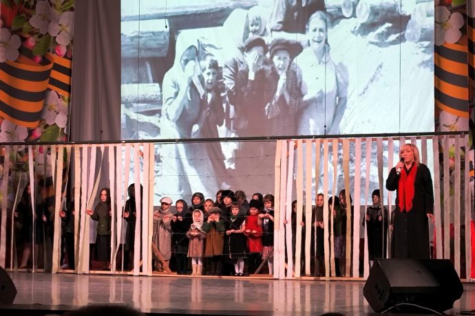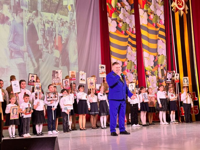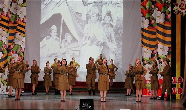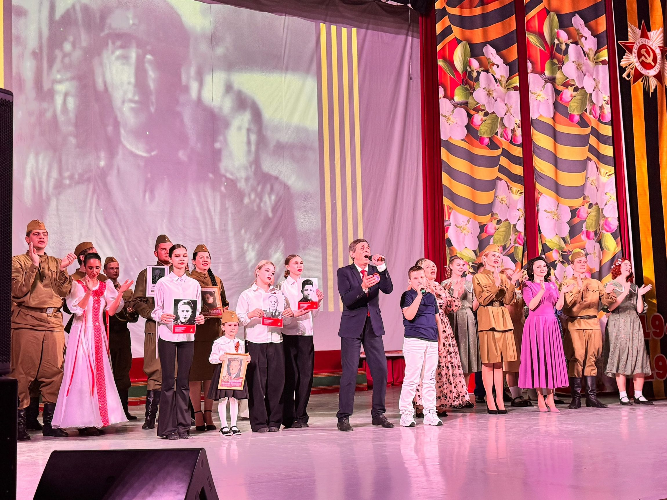 Затем выступили артисты Дома культуры. В начале прозвучала литературно-музыкальная композиция «Мы помним», построенная на истории войны и Победы. После выступления артистов на сцену вышли дети с портретами«Бессмертного полка».