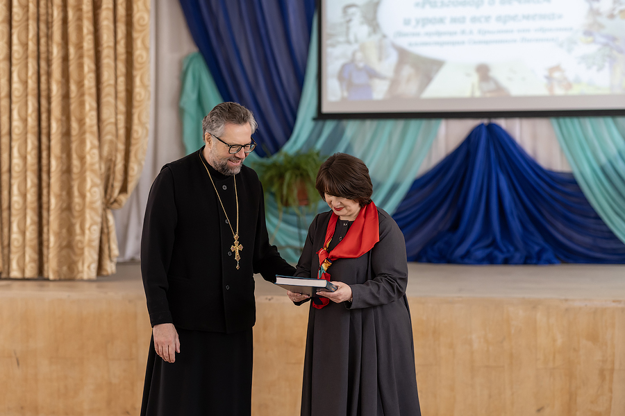 Светлана Шевякова, председатель Регионального отделения Союза православных женщин и директор школы №2, подвела итог: «Эта встреча проходит в рамках Дня православной книги и многие из вас знают, что первая книга на Руси была издана диаконом Иваном Федоровым. Это была православная книга «Апостол». Творчество Крылова тоже было для нас открытием: для многих из вас он стал обличителем пороков. Эта встреча посеяла в ваших душах добрые семена, которые когда-то взрастят хорошие плоды. Читайте самую мудрую книгу – Священное Писание. В ней вы найдете ответы на все вопросы».