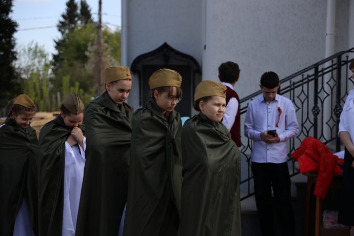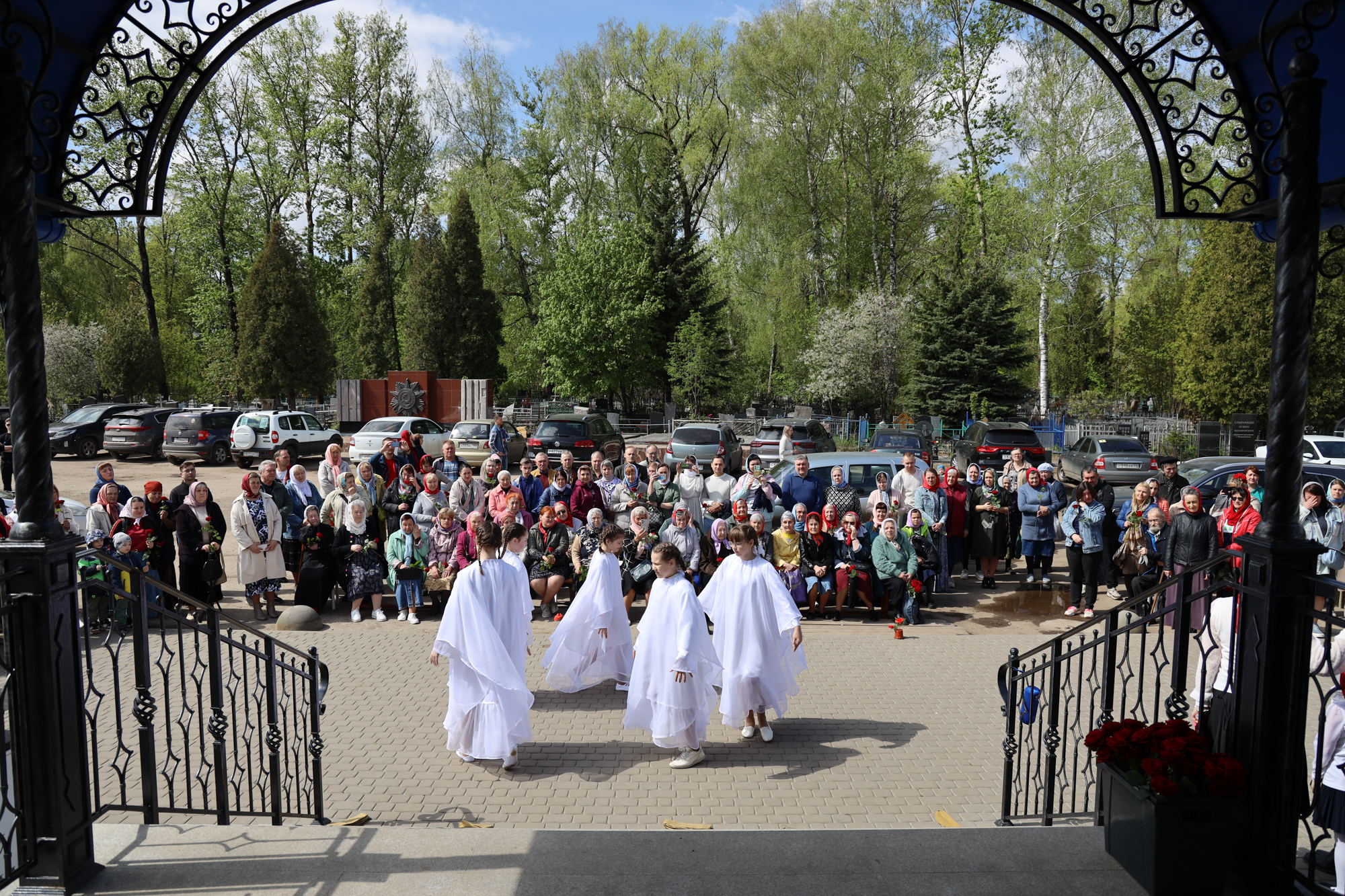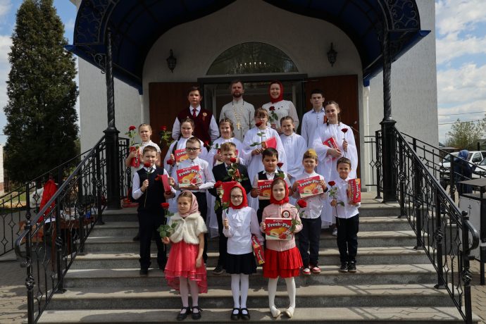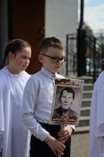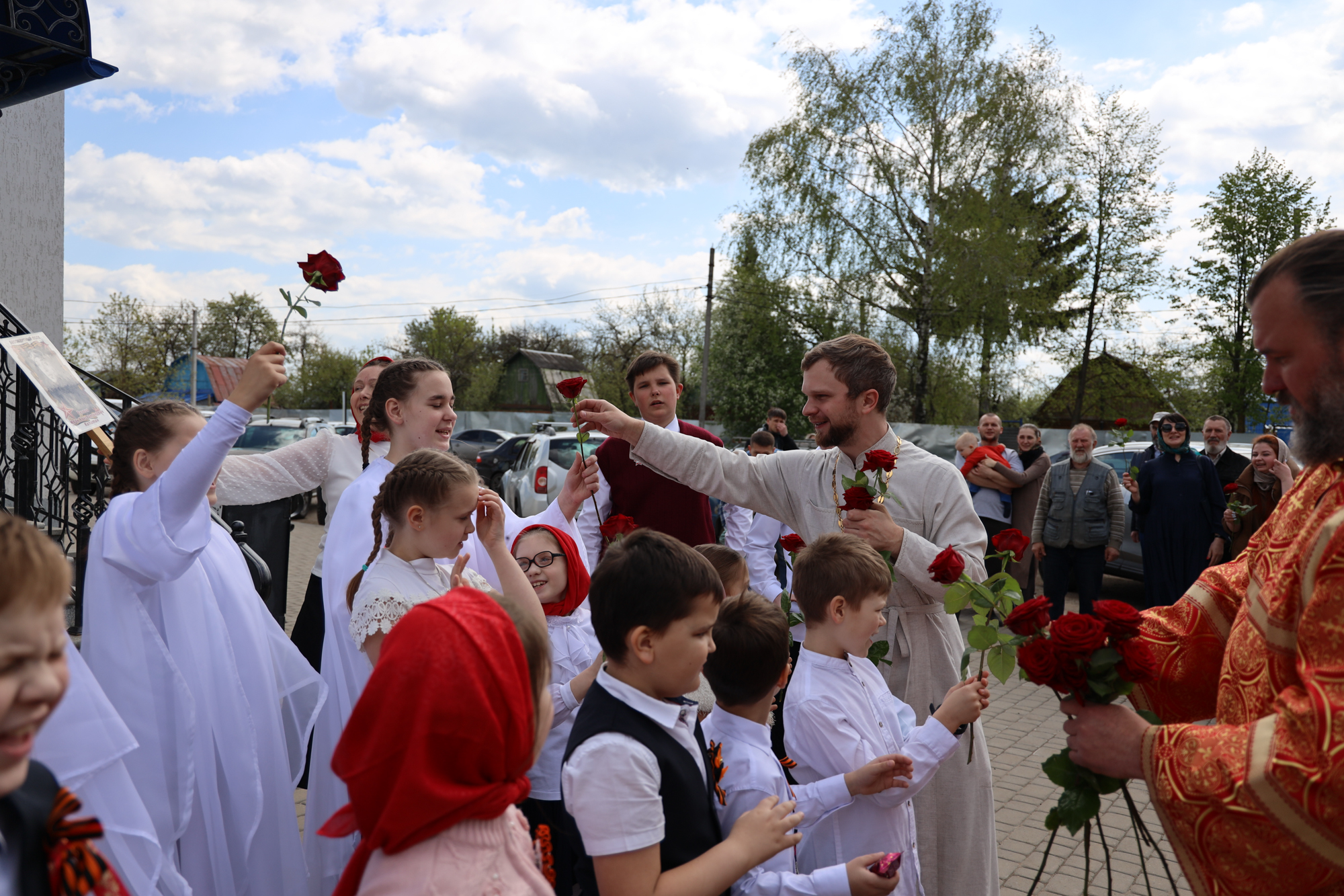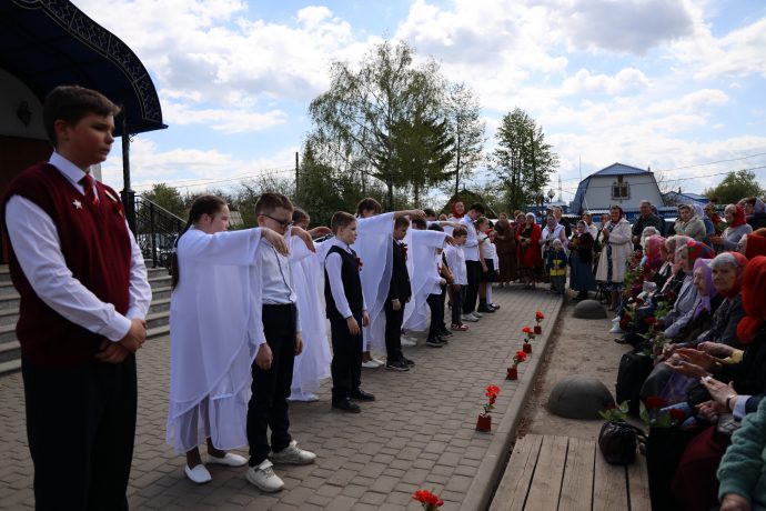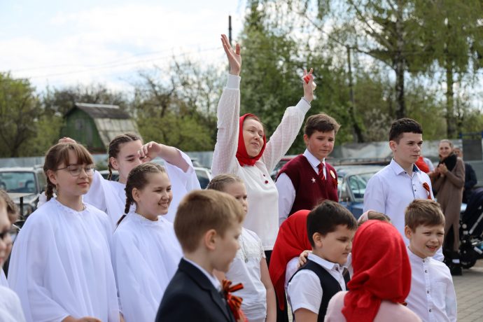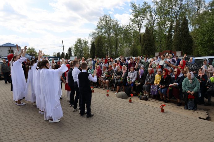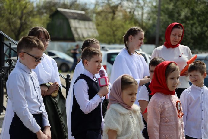 По окончании воскресной Божественной литургии настоятель храма Всех святых иерей Феодор Передиреев пригласил прихожан собраться на улице перед храмом и посмотреть детское представление. Ребята прочитали патриотические стихи, исполнили танец «белых журавлей» под знаменитую песню композитора Яна Френкеля, поздравили зрителей со Светлой Пасхой и Днем Победы и преподнесли прихожанам храма сладкие подарки.