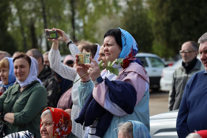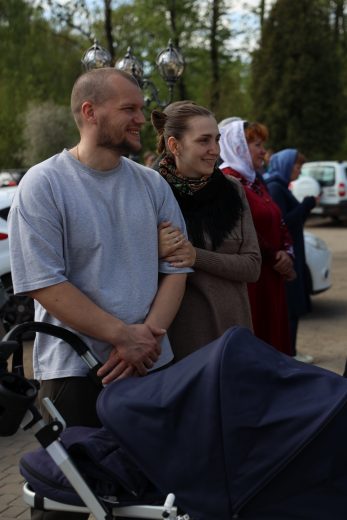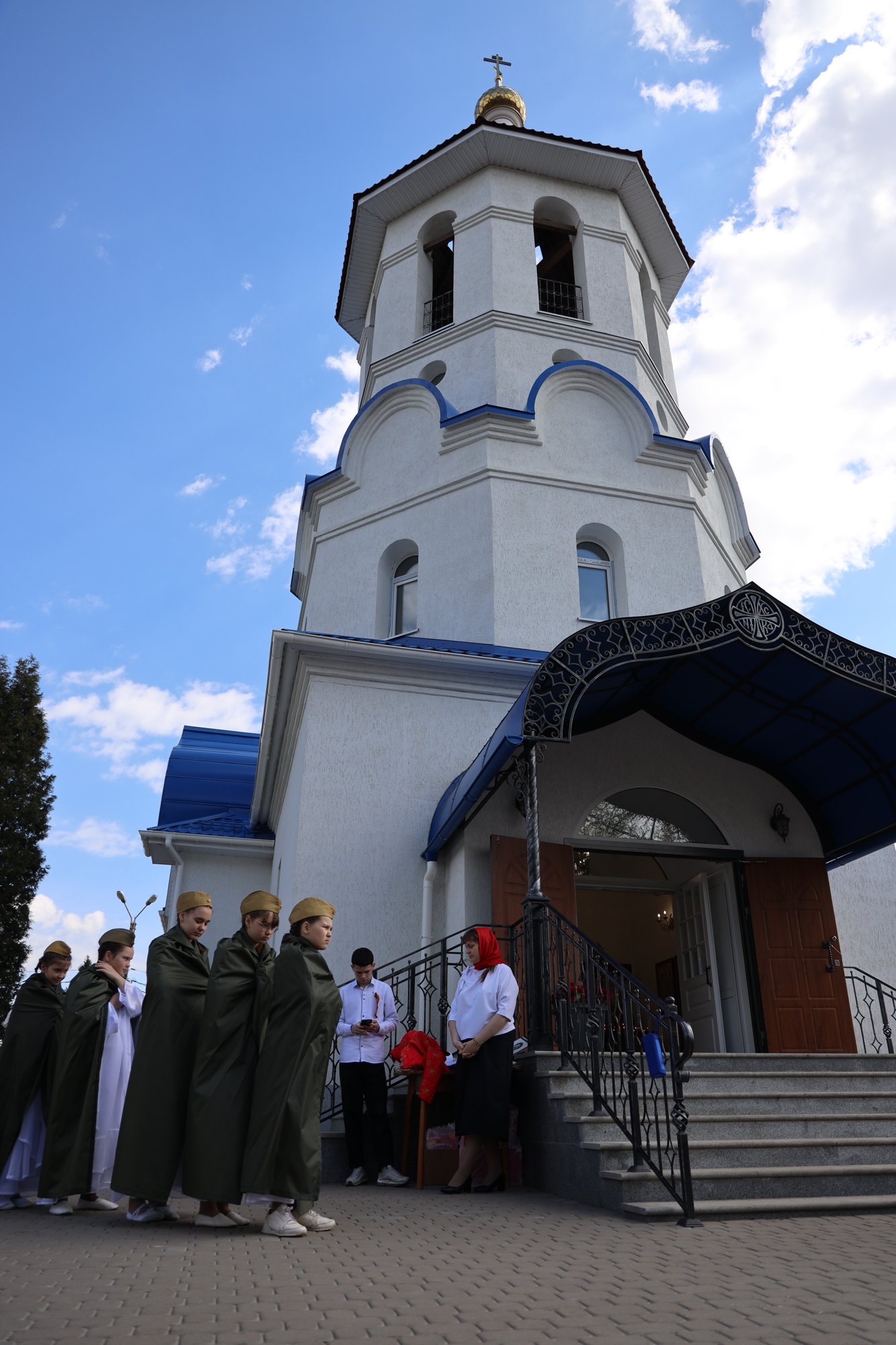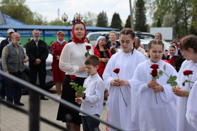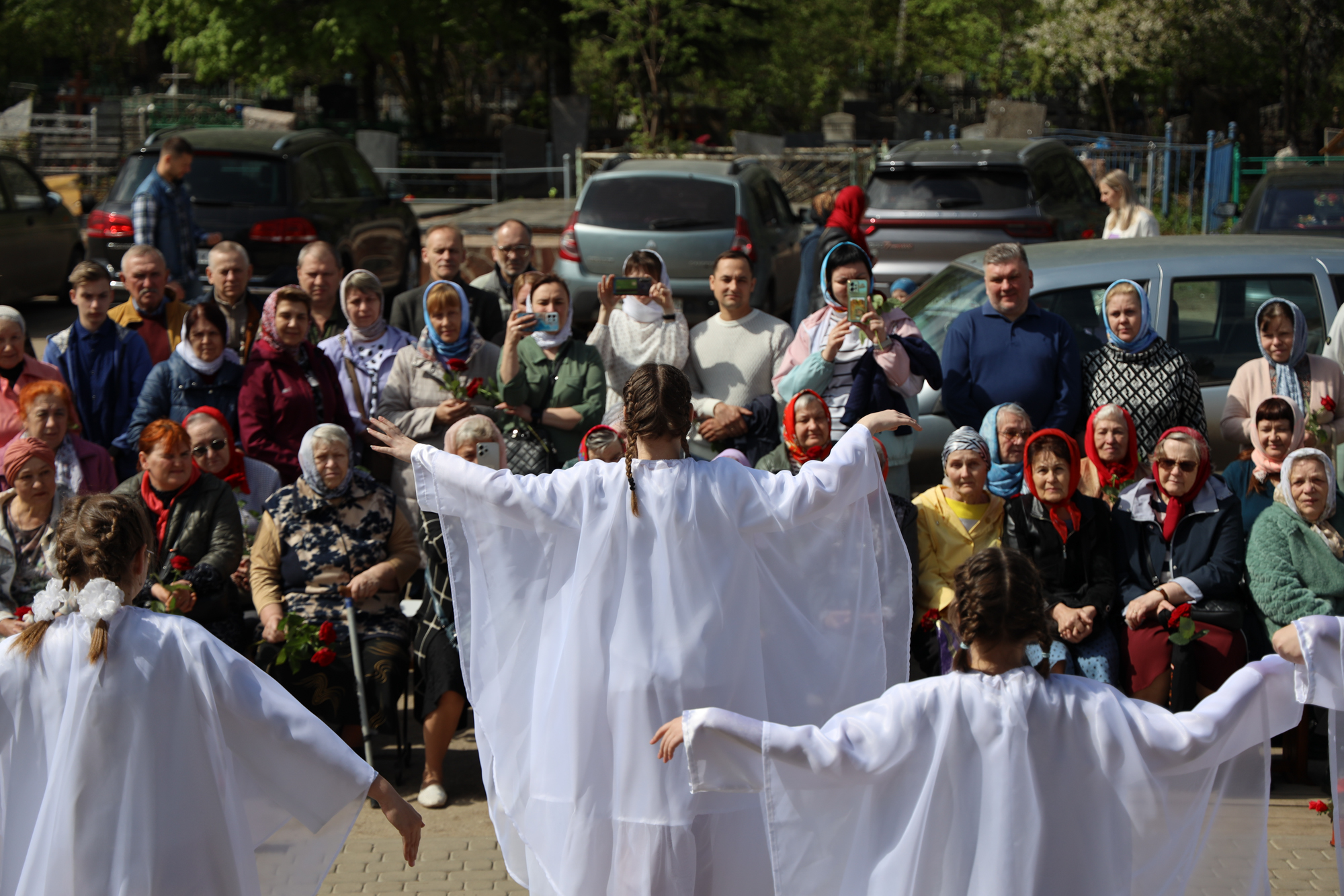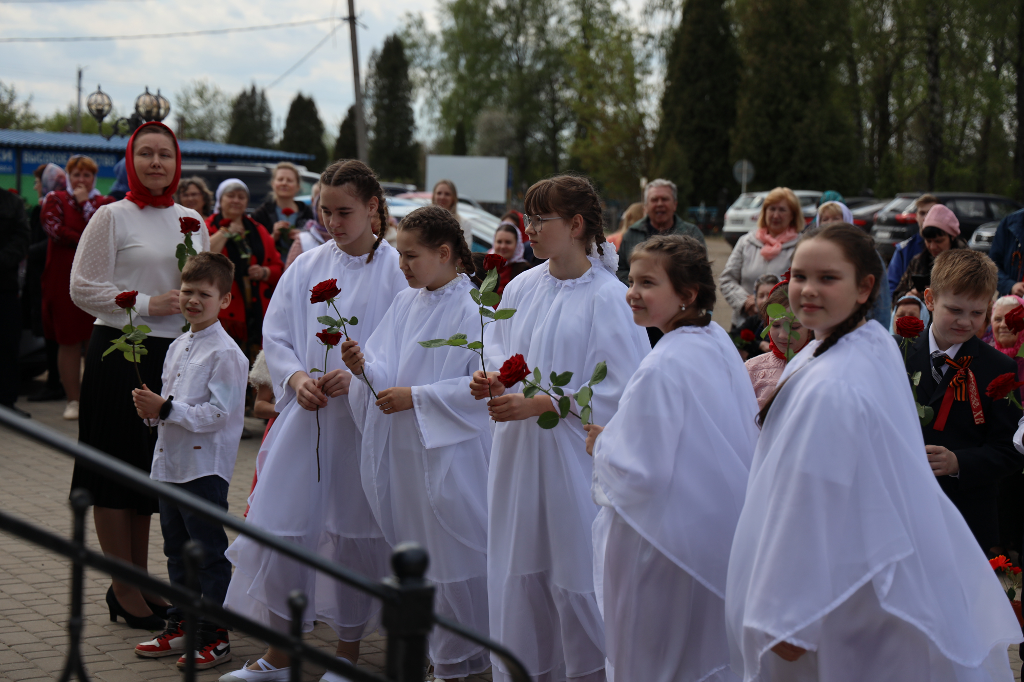 По окончании воскресной Божественной литургии настоятель храма Всех святых иерей Феодор Передиреев пригласил прихожан собраться на улице перед храмом и посмотреть детское представление. Ребята прочитали патриотические стихи, исполнили танец «белых журавлей» под знаменитую песню композитора Яна Френкеля, поздравили зрителей со Светлой Пасхой и Днем Победы и преподнесли прихожанам храма сладкие подарки.