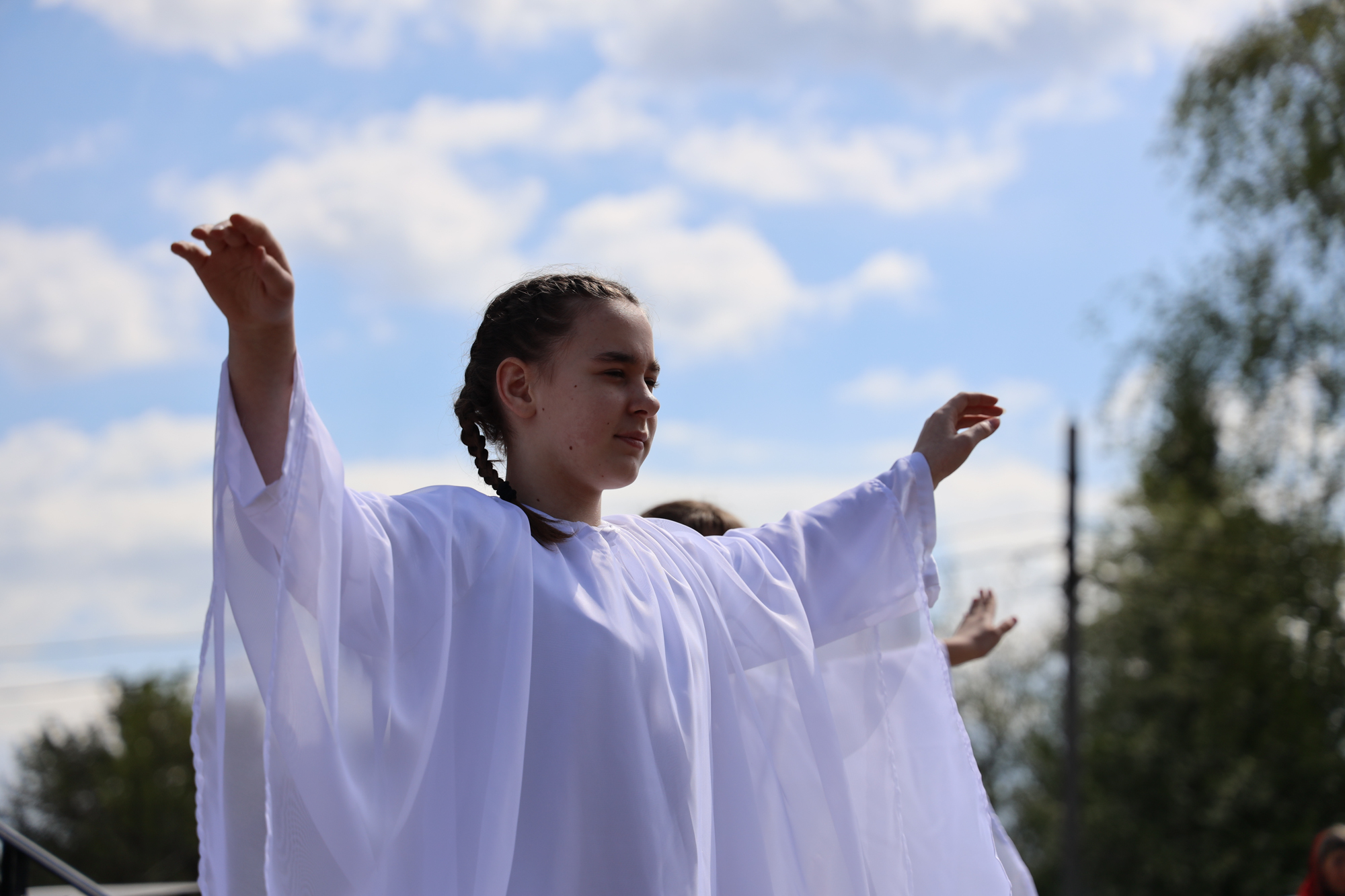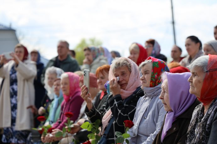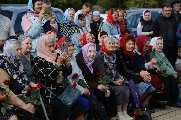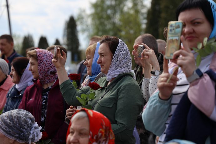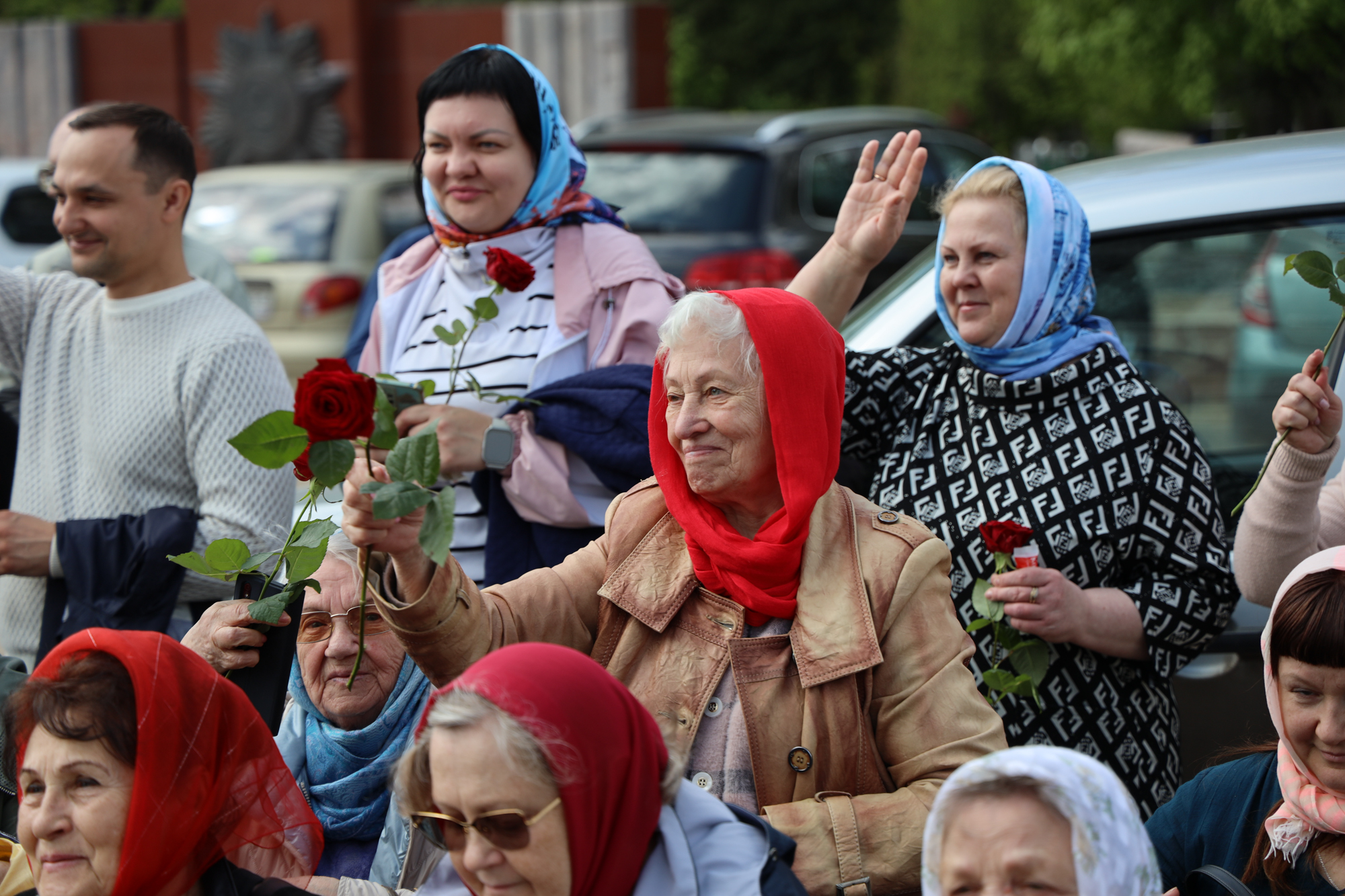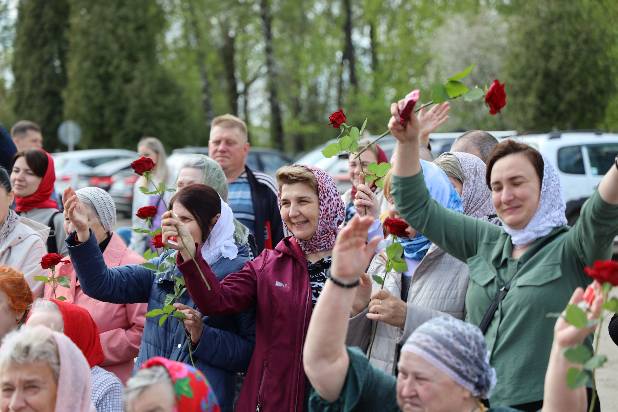 По окончании воскресной Божественной литургии настоятель храма Всех святых иерей Феодор Передиреев пригласил прихожан собраться на улице перед храмом и посмотреть детское представление. Ребята прочитали патриотические стихи, исполнили танец «белых журавлей» под знаменитую песню композитора Яна Френкеля, поздравили зрителей со Светлой Пасхой и Днем Победы и преподнесли прихожанам храма сладкие подарки.