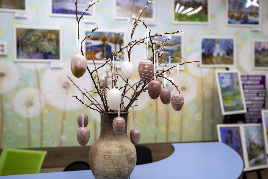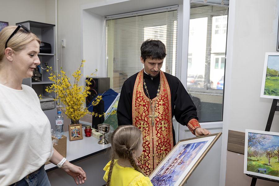 Батюшка посмотрел выставку детских рисунков на весеннюю тематику и пожелал детям и родителям радостного пасхального настроения.