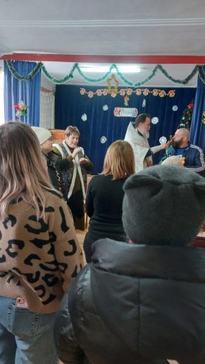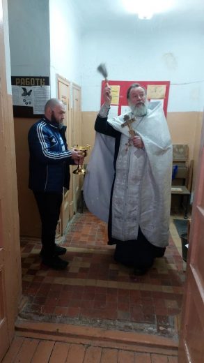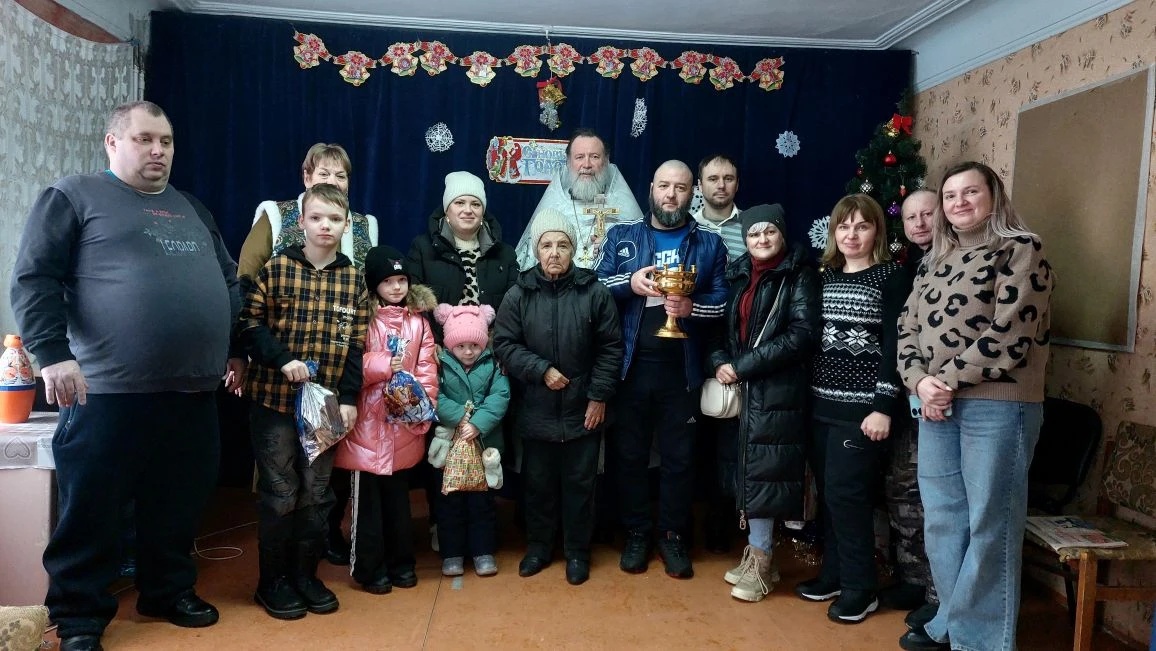 Встреча началась с молитвы, после чего батюшка под пение тропаря праздника окропил молящихся и помещение крещенской водой, угостил всех сладкими подарками и рассказал об истории и символизме праздника Крещения Господня.