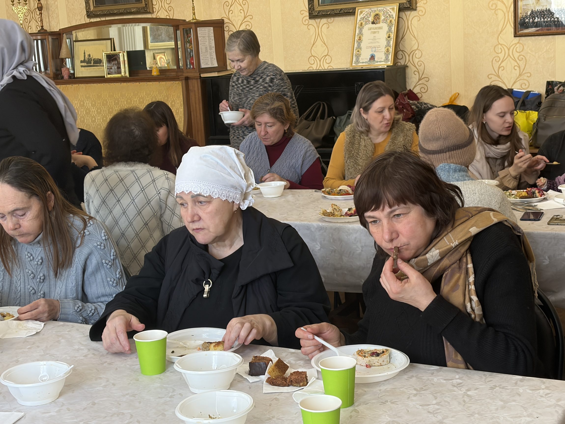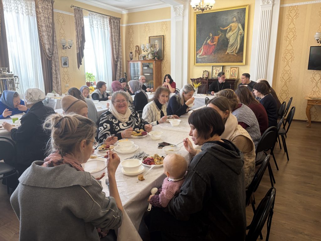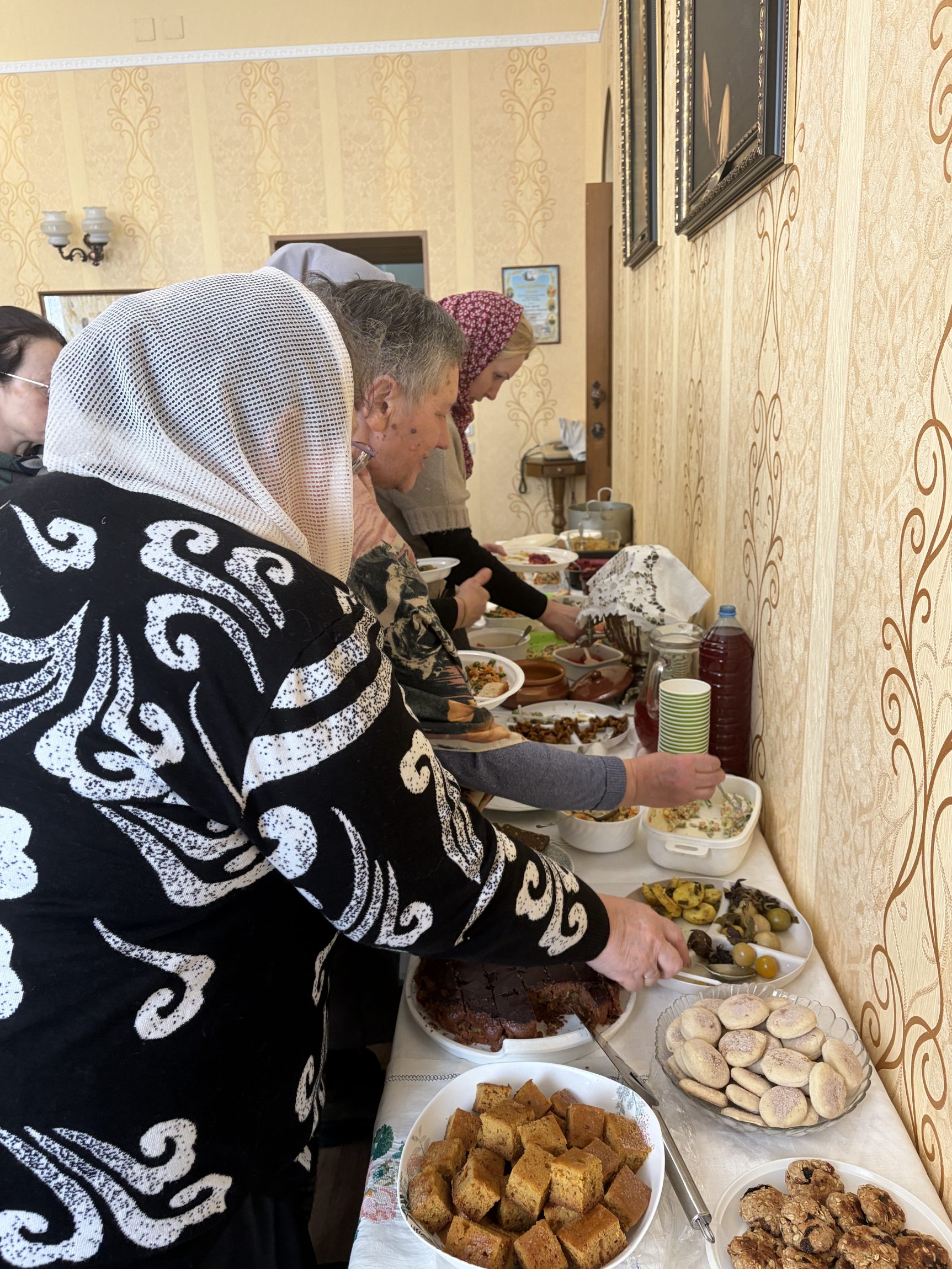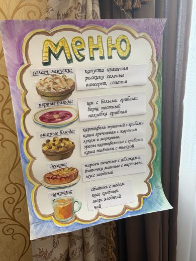 Каждый год во время Великого поста хозяйки собираются вместе в каминном зале, и каждый приносит из дома готовое угощение: супы, горячие блюда, закуски, салаты, пироги и печенье, напитки. После богослужения участницы выставки накрыли на стол и презентовали свои блюда. В этом году перед конкурсом было составлено меню-подсказка, чтобы постный стол оказался максимально разнообразным и интересным.