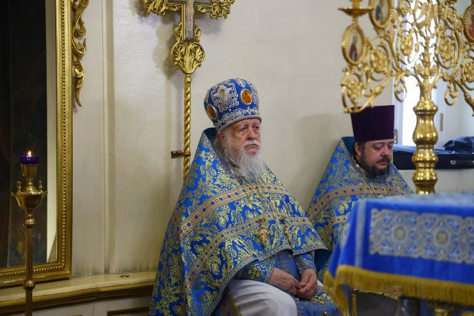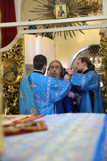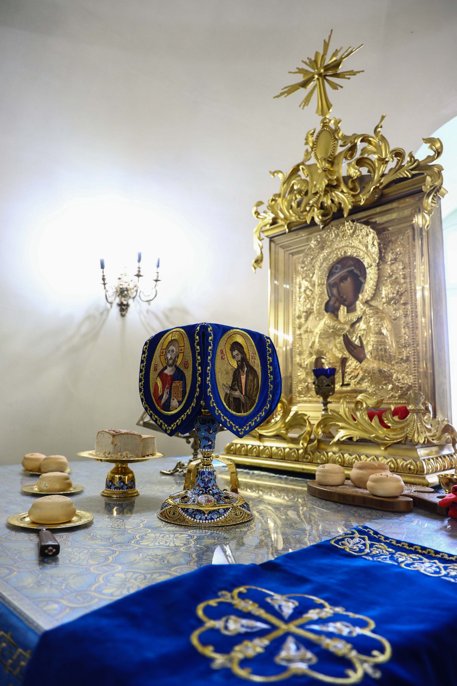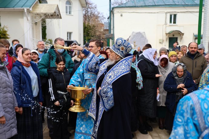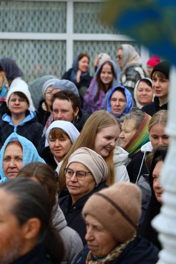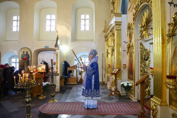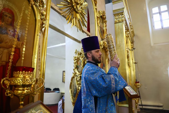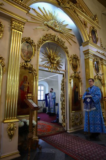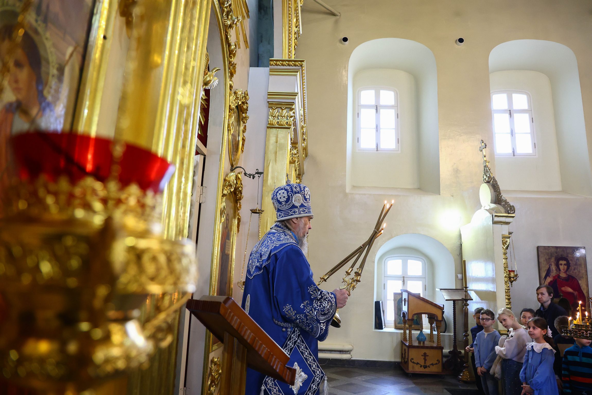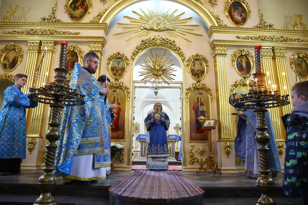 На сугубой ектении вознесены молитвы о благопоспешениихристолюбивому Российскому воинству в установлении мира в сию лихую годину, на Святую Русь нашедшую, о мире на Украине, а также о сохранении единства святого Православия.