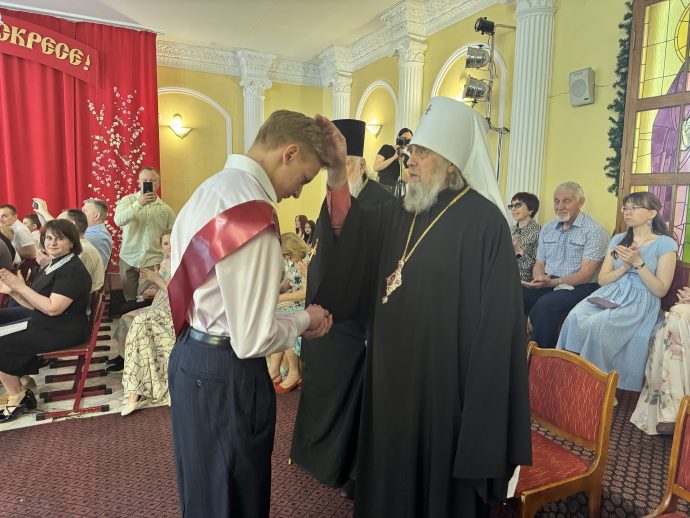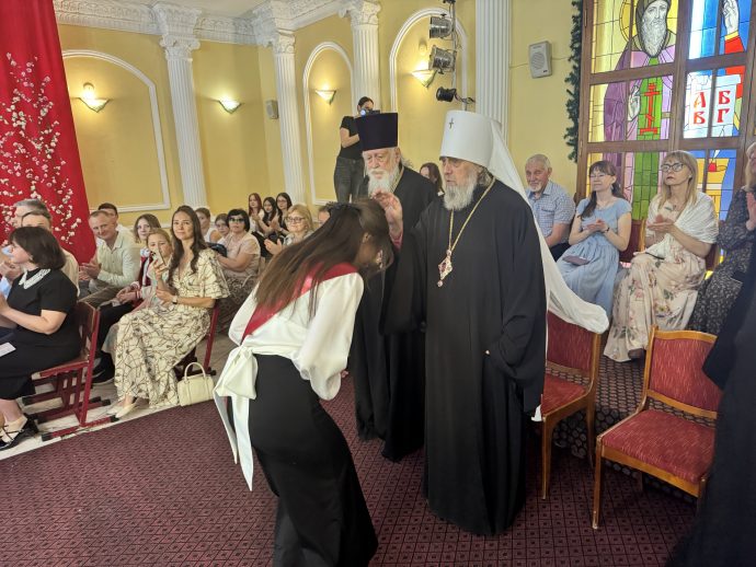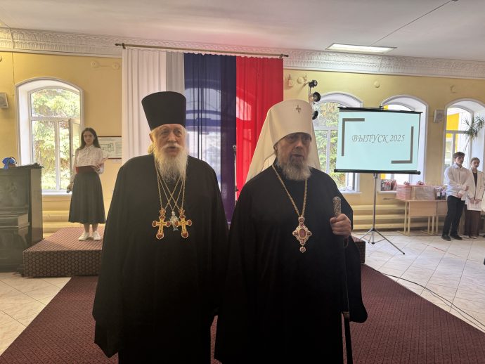 Главные виновники события, выпускники, сопровождаемые первоклассниками под звуки торжественной мелодии, прошествовали под архипастырское благословение на грядущие итоговые экзамены и предстоящую взрослую жизнь.
