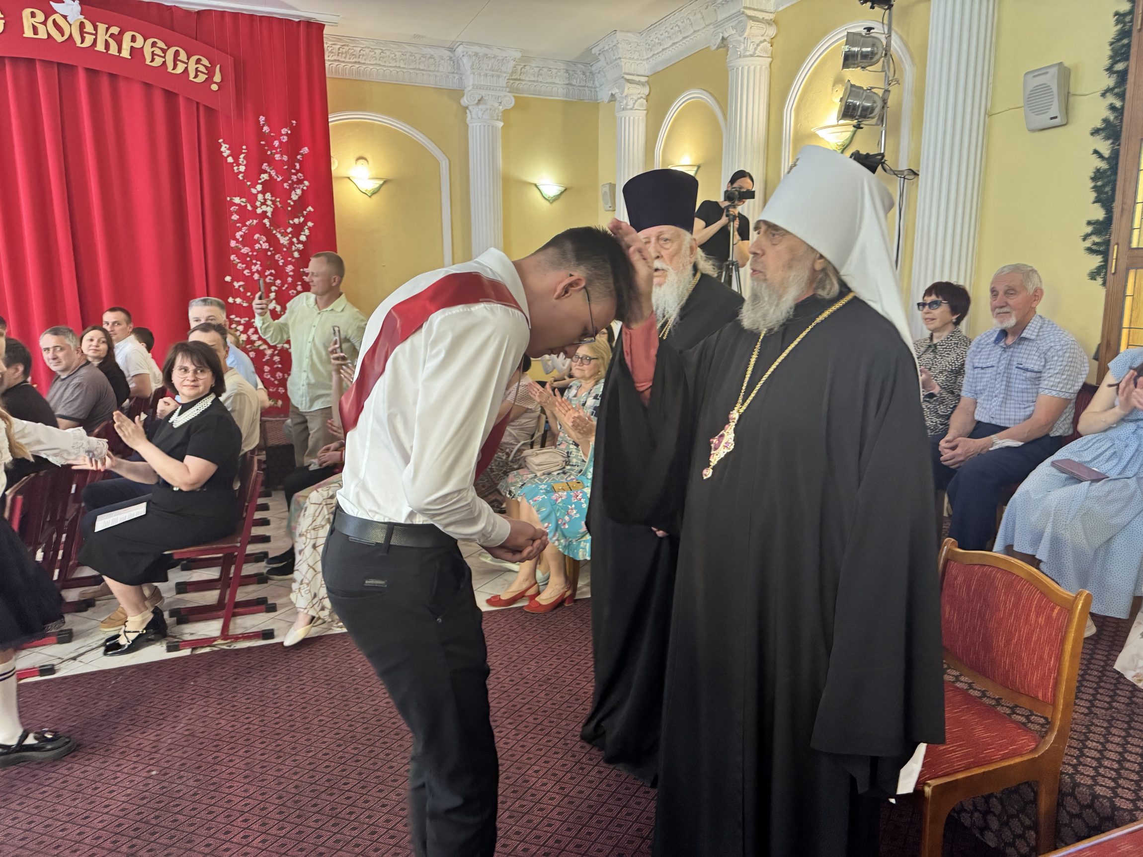 Выпускники в ответном слове выразили благодарность владыке Алексию за внимание, деятельное участие в их гимназической жизни, а также мудрое наставление и благословение, вручив архипастырю букет роз.