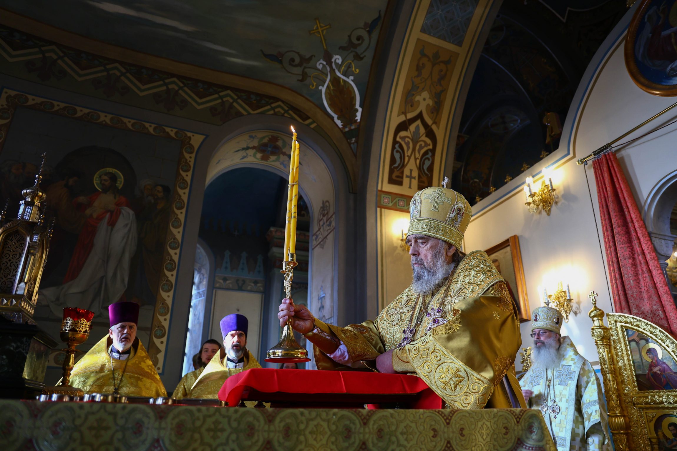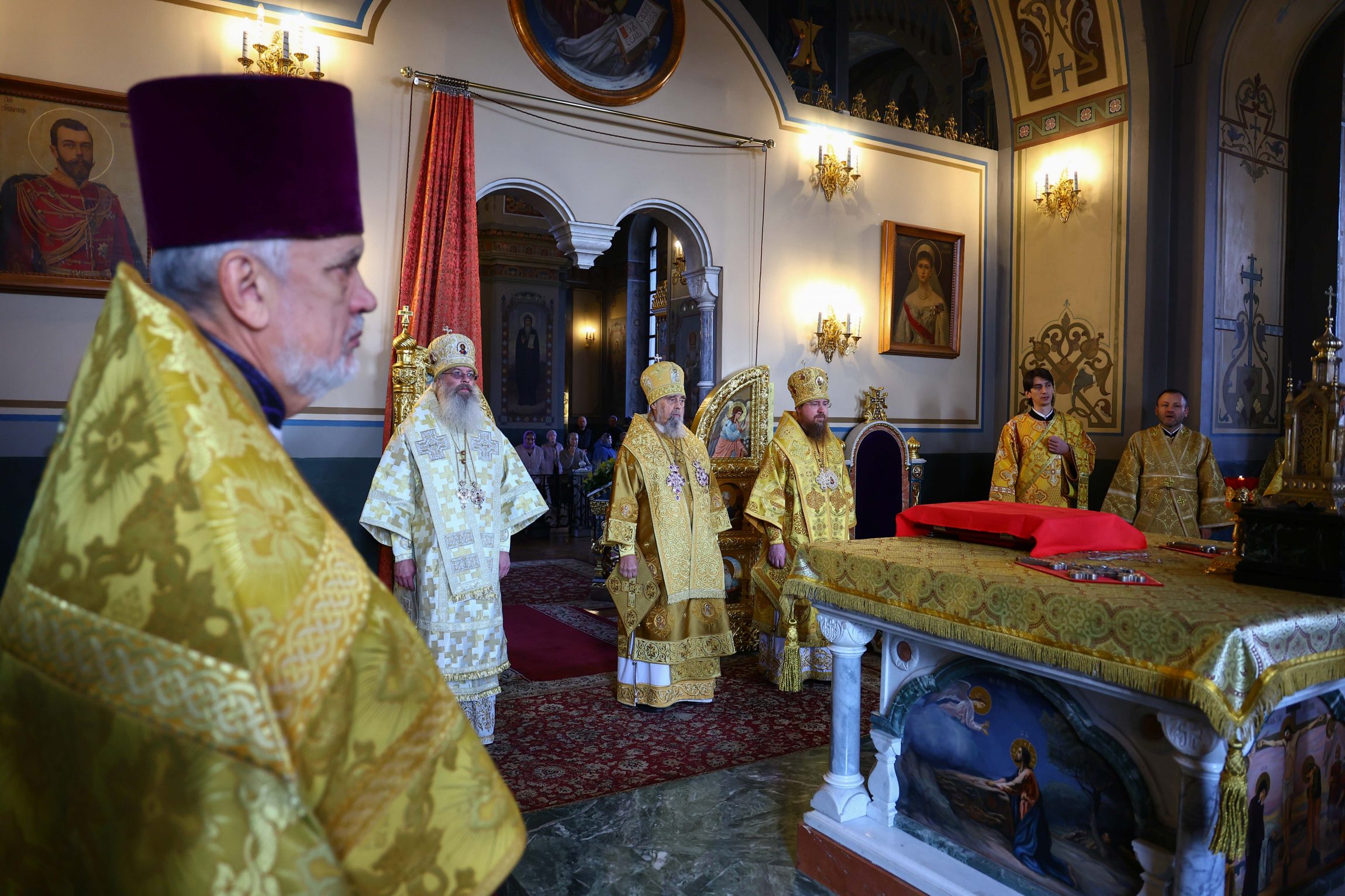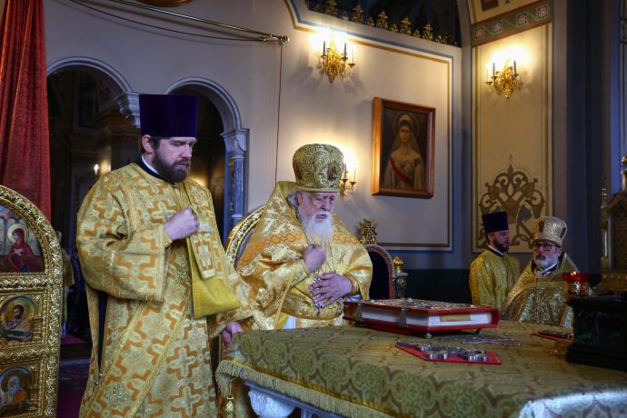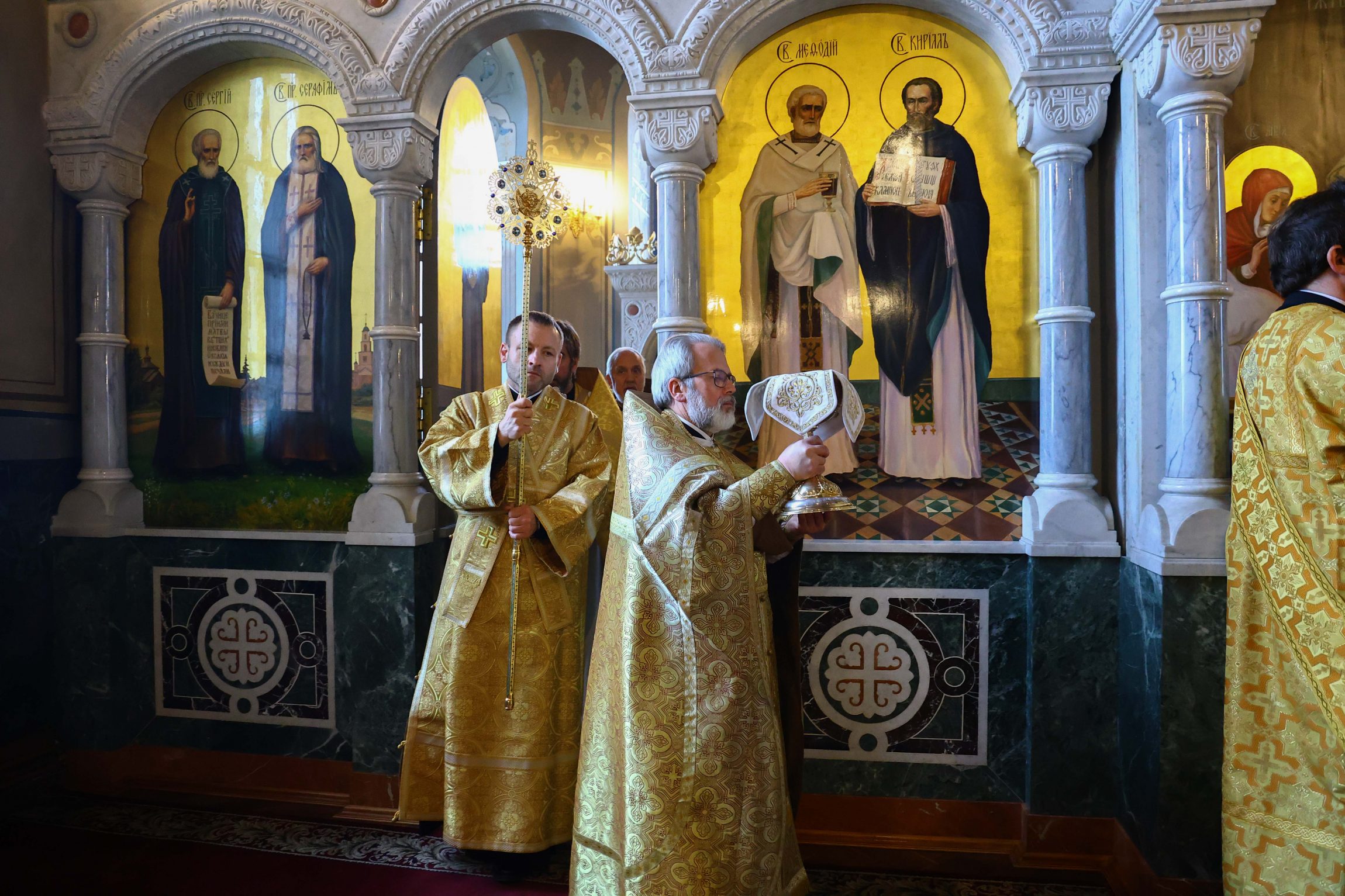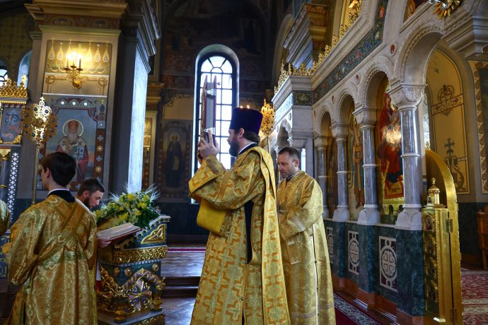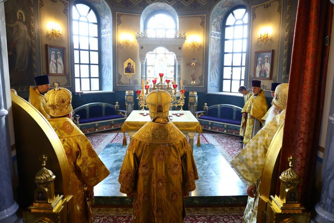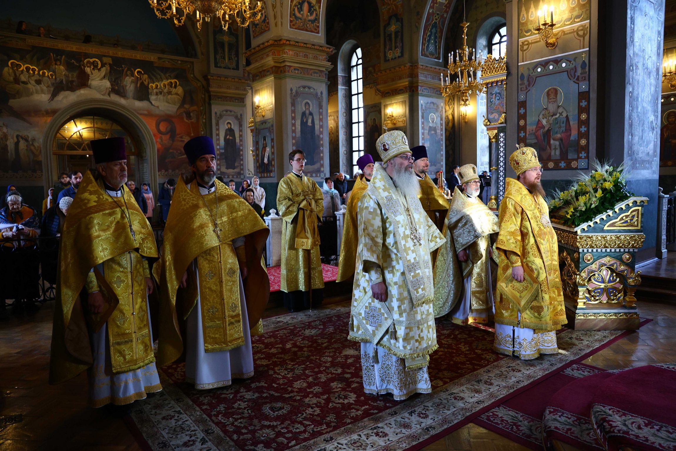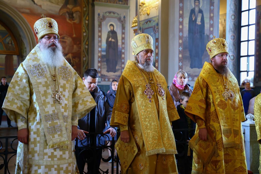 На сугубой ектении вознесены молитвы о благопоспешении христолюбивому Российскому воинству в установлении мира в сию лихую годину, на Святую Русь нашедшую, о мире на Украине, а также о сохранении единства святого Православия.