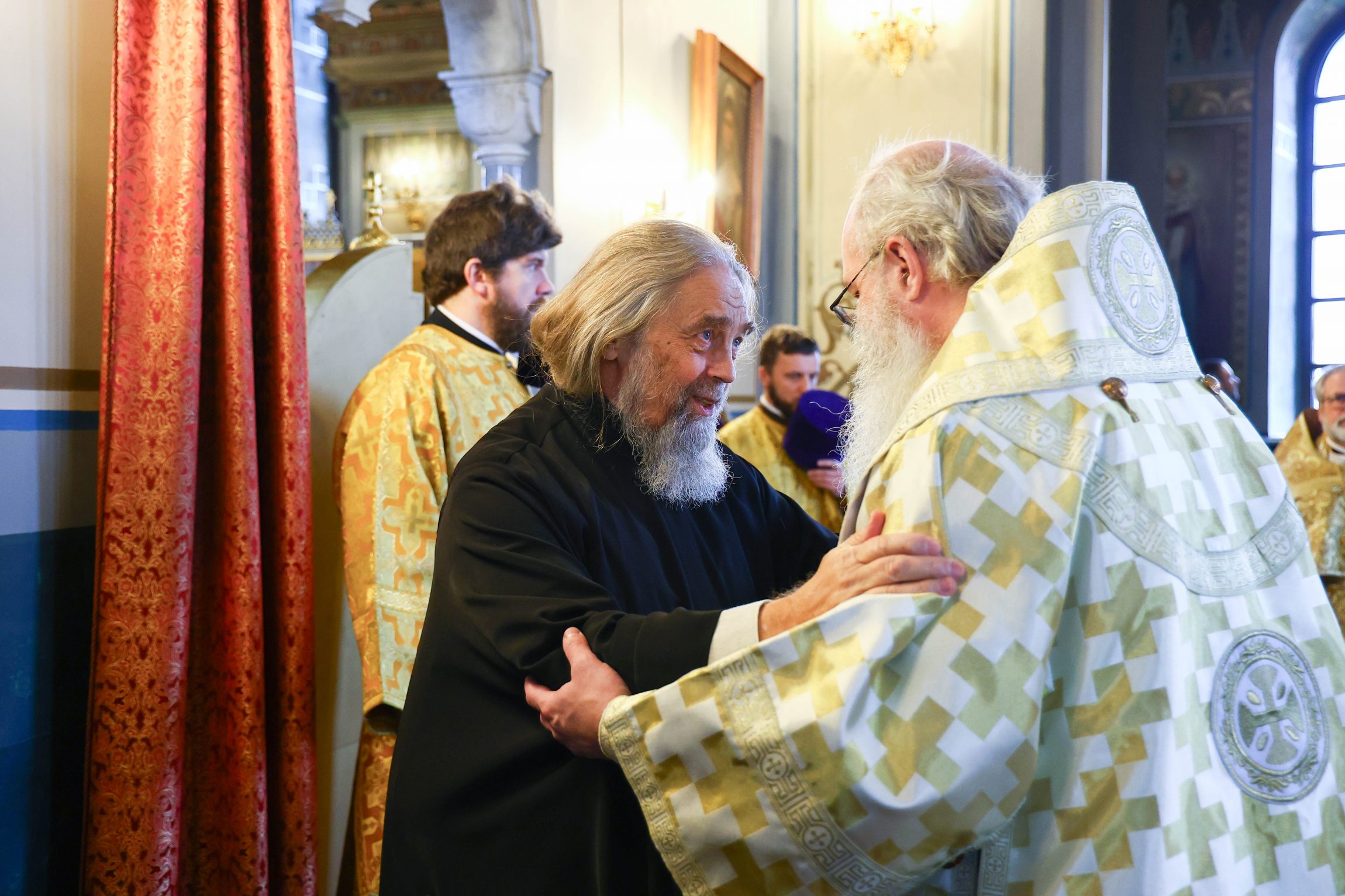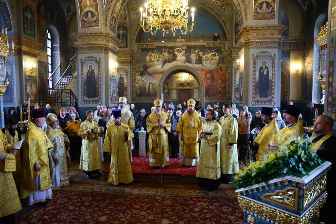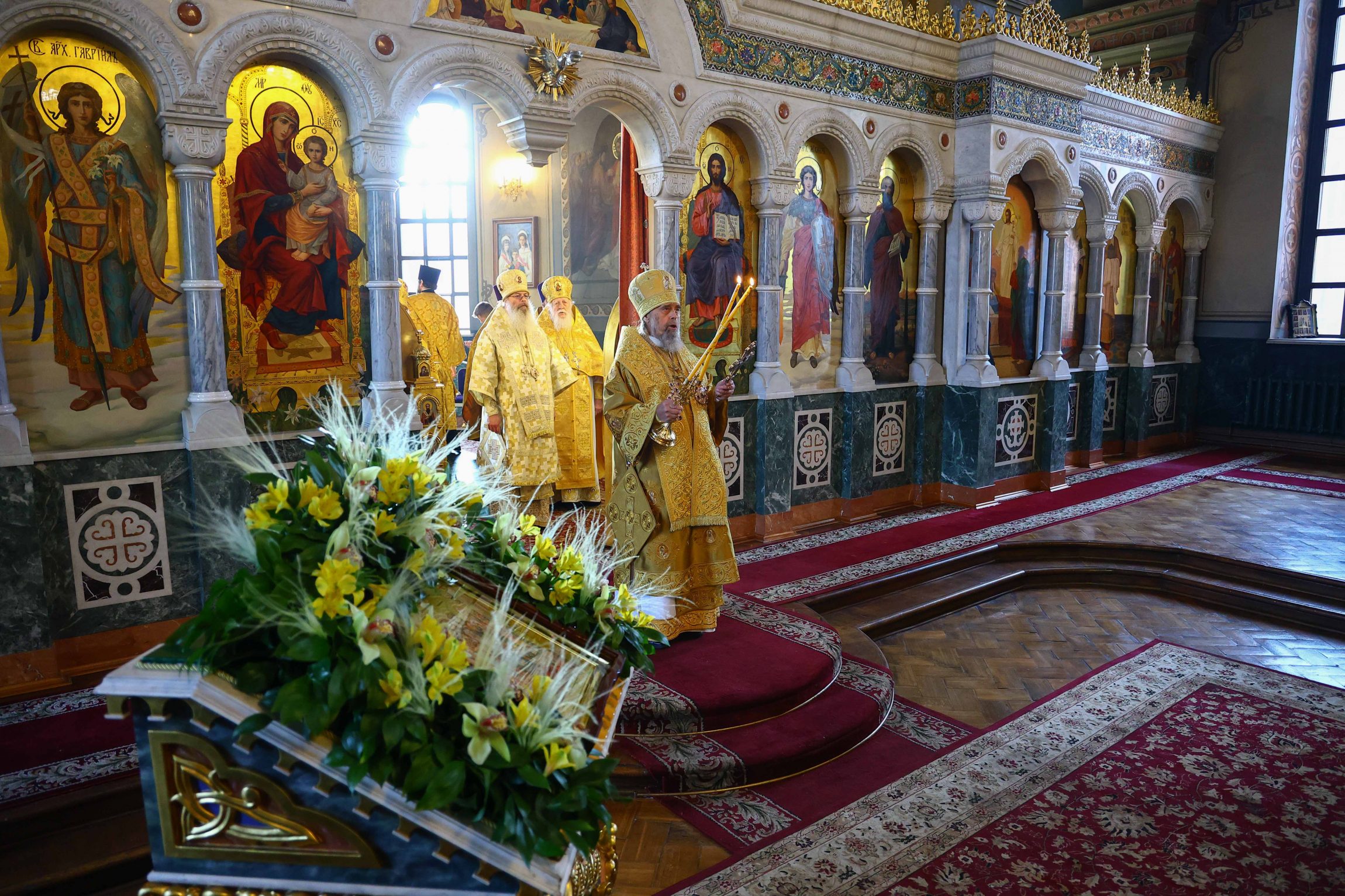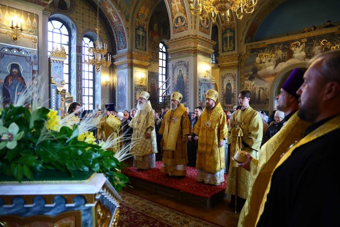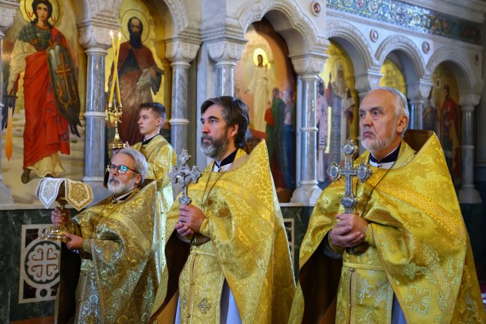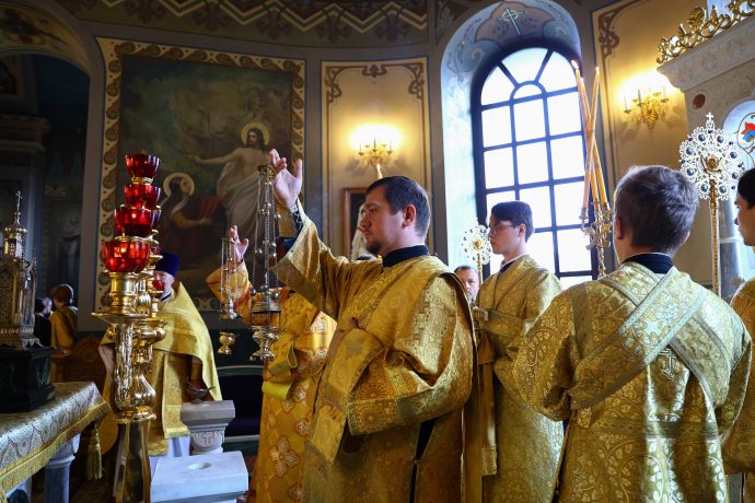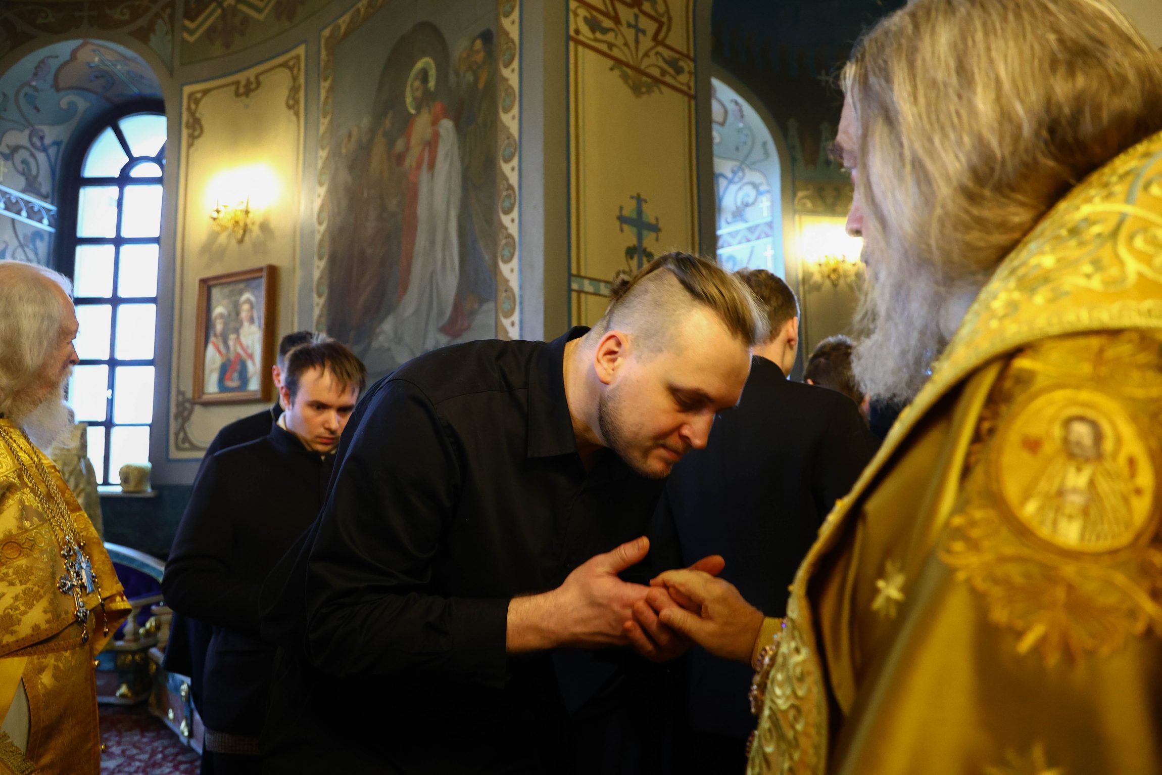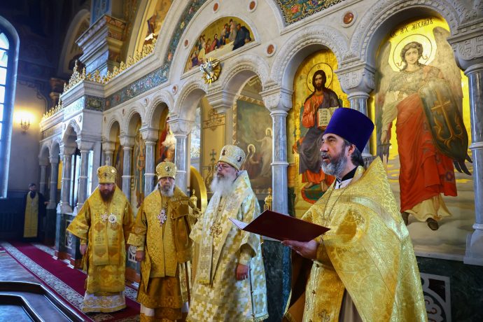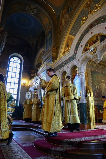 На сугубой ектении вознесены молитвы о благопоспешении христолюбивому Российскому воинству в установлении мира в сию лихую годину, на Святую Русь нашедшую, о мире на Украине, а также о сохранении единства святого Православия.