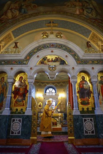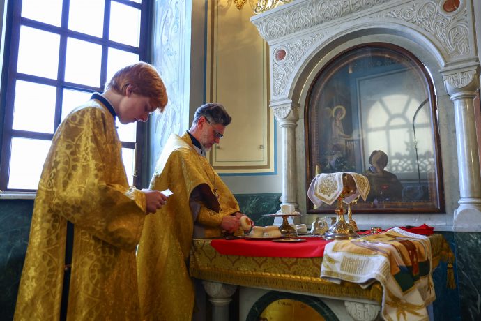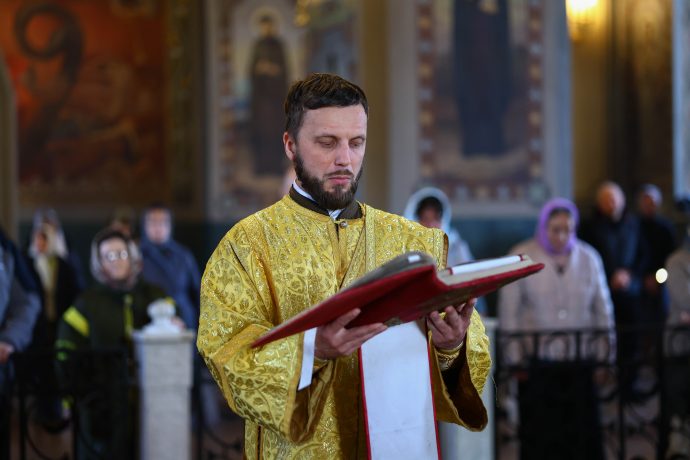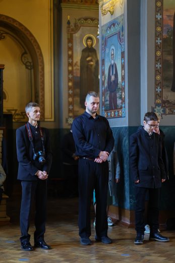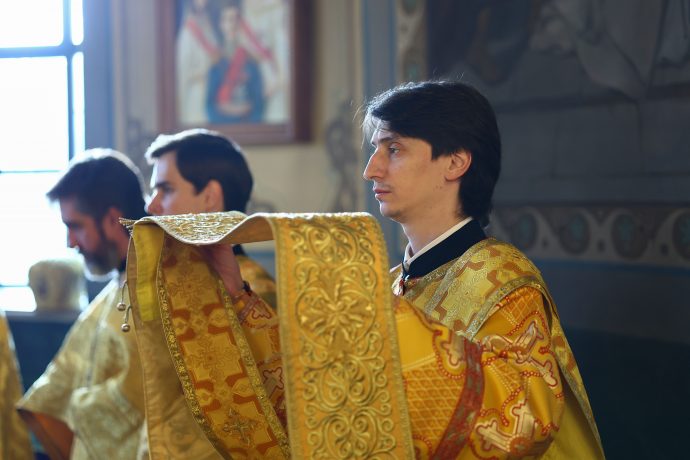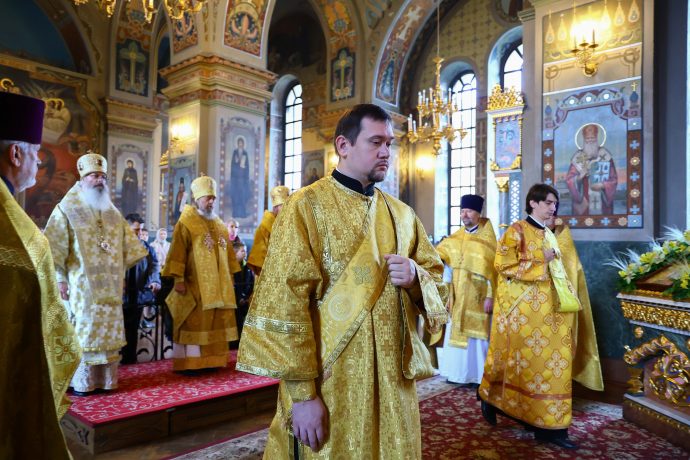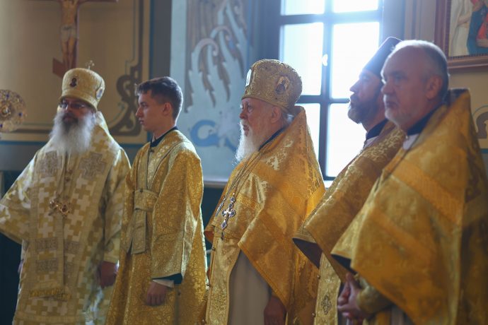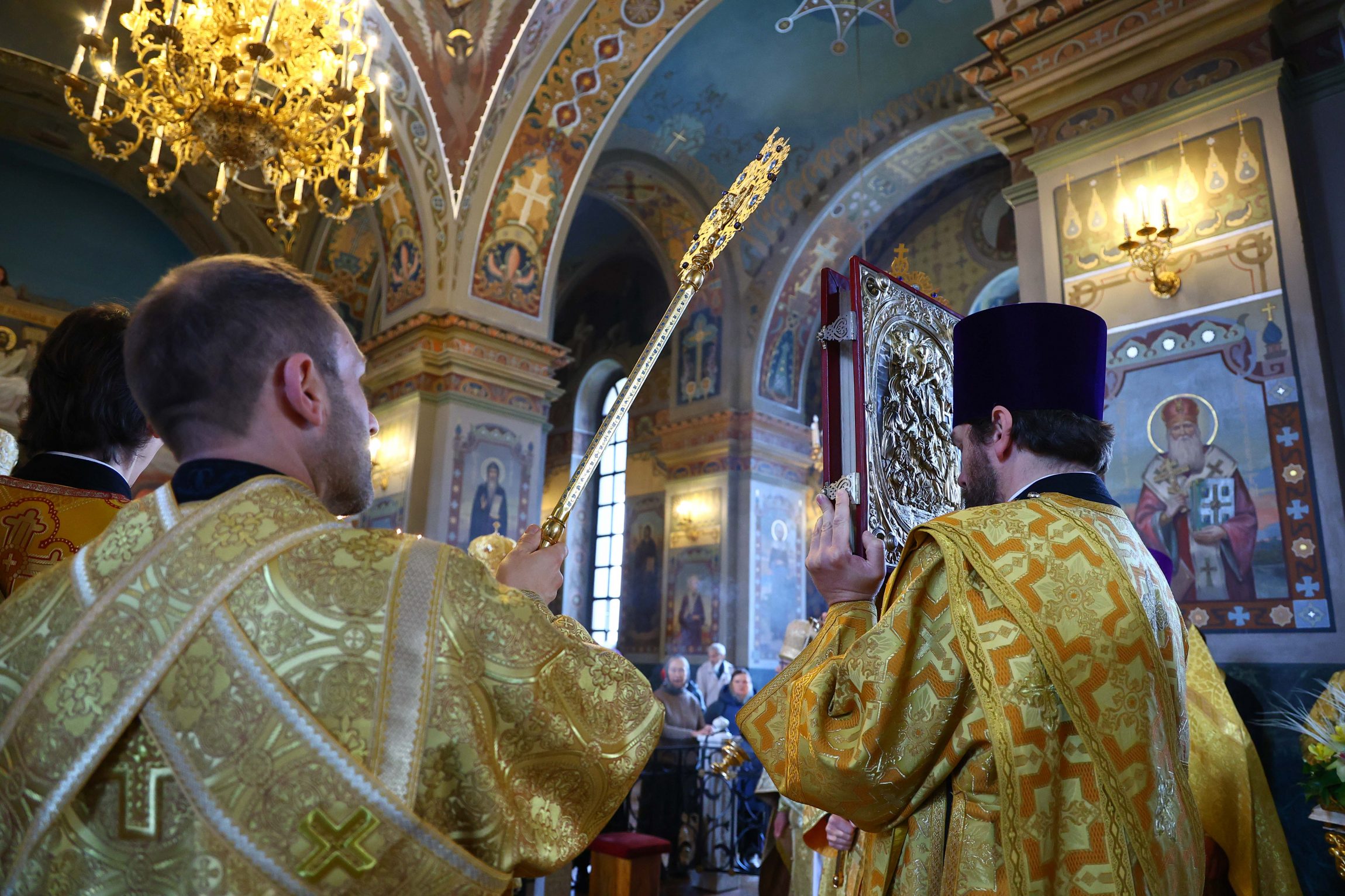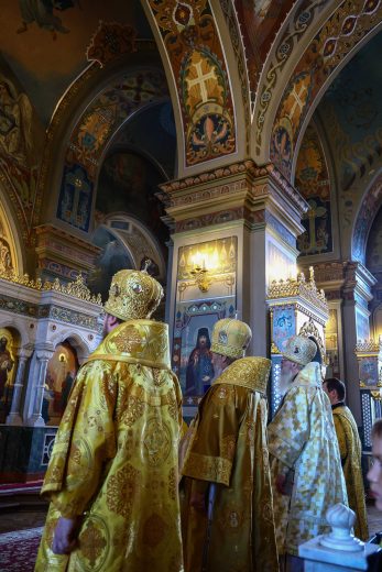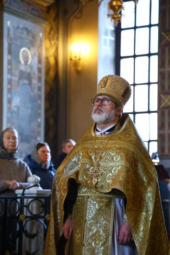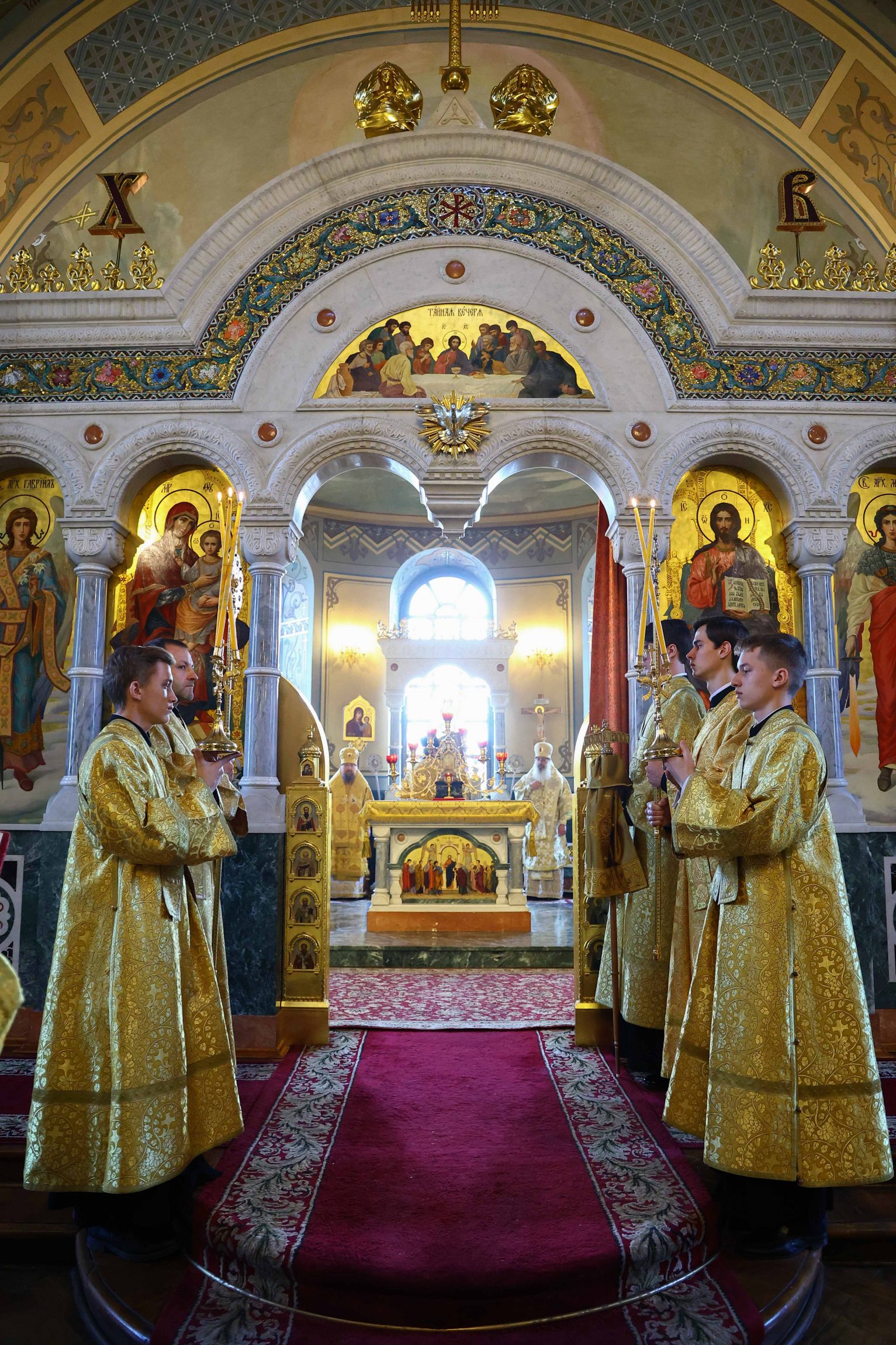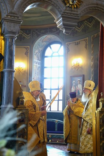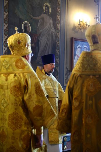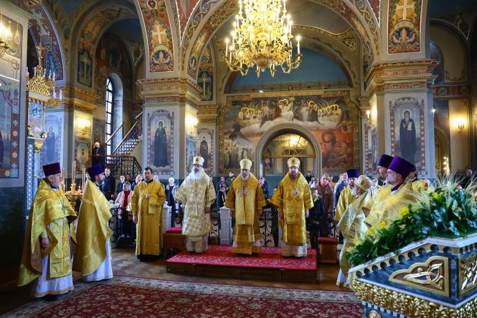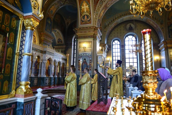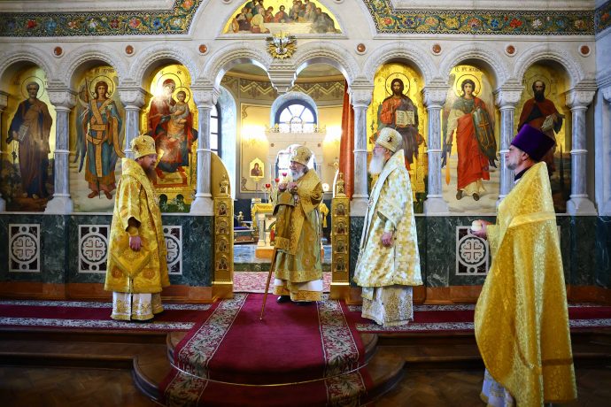 На сугубой ектении вознесены молитвы о благопоспешении христолюбивому Российскому воинству в установлении мира в сию лихую годину, на Святую Русь нашедшую, о мире на Украине, а также о сохранении единства святого Православия.