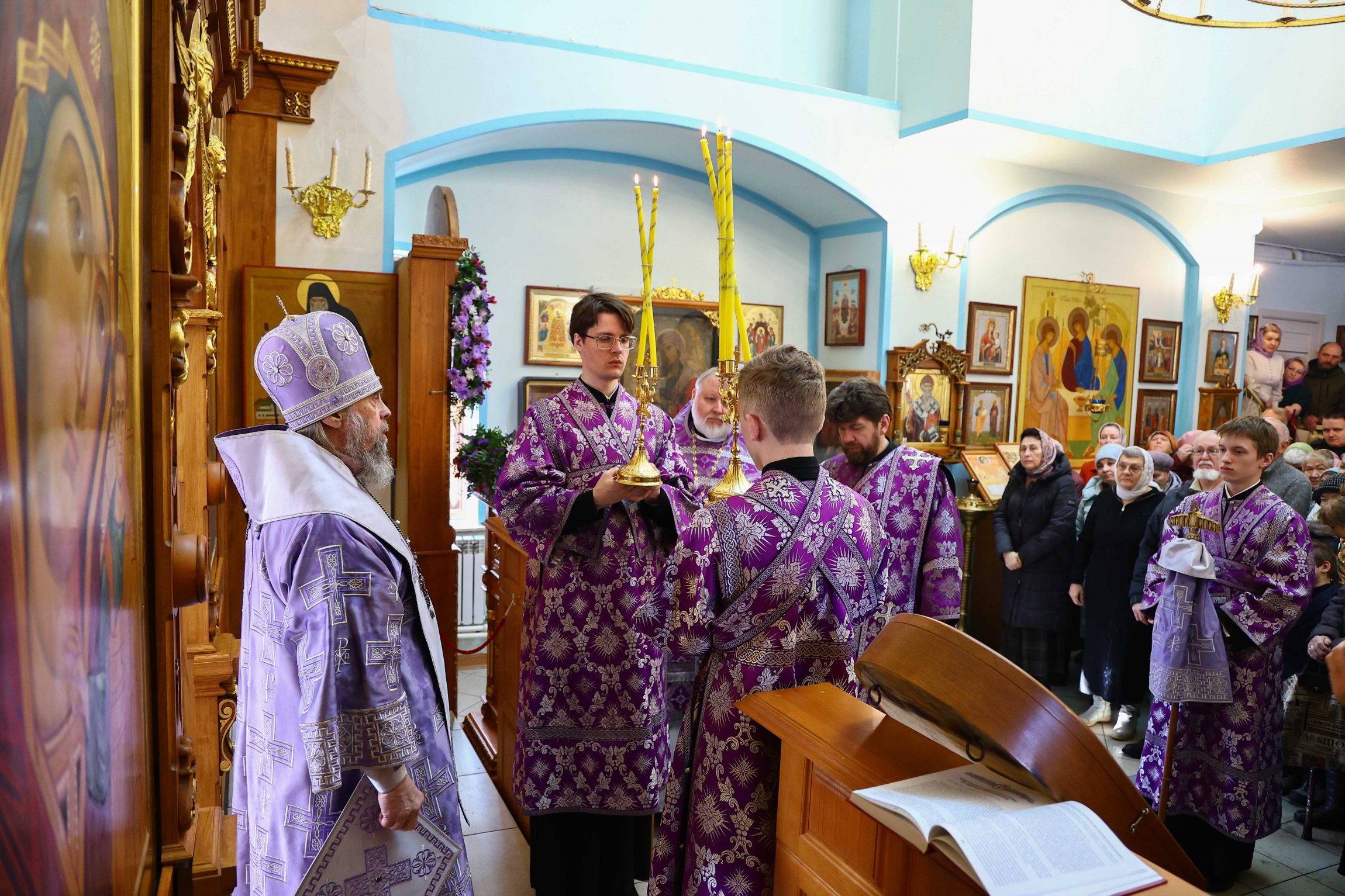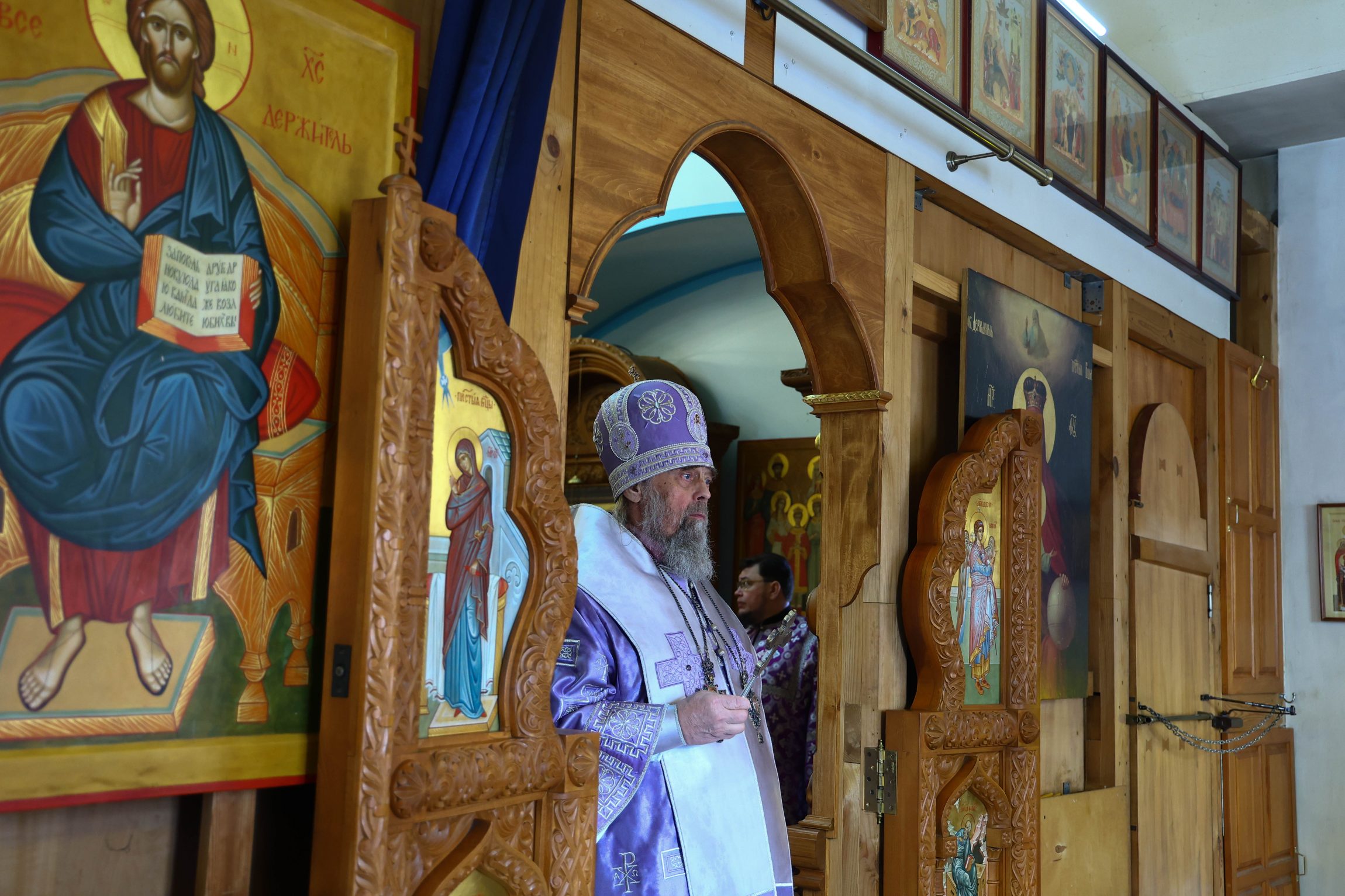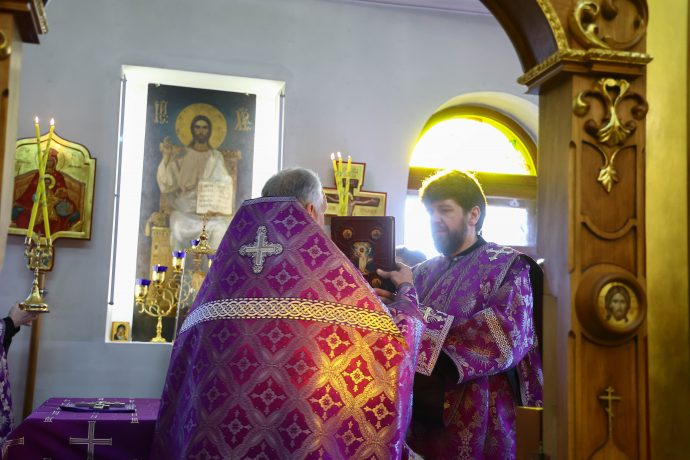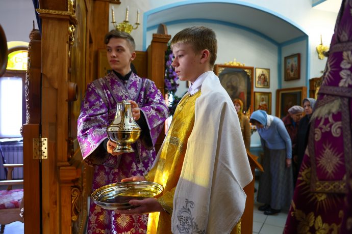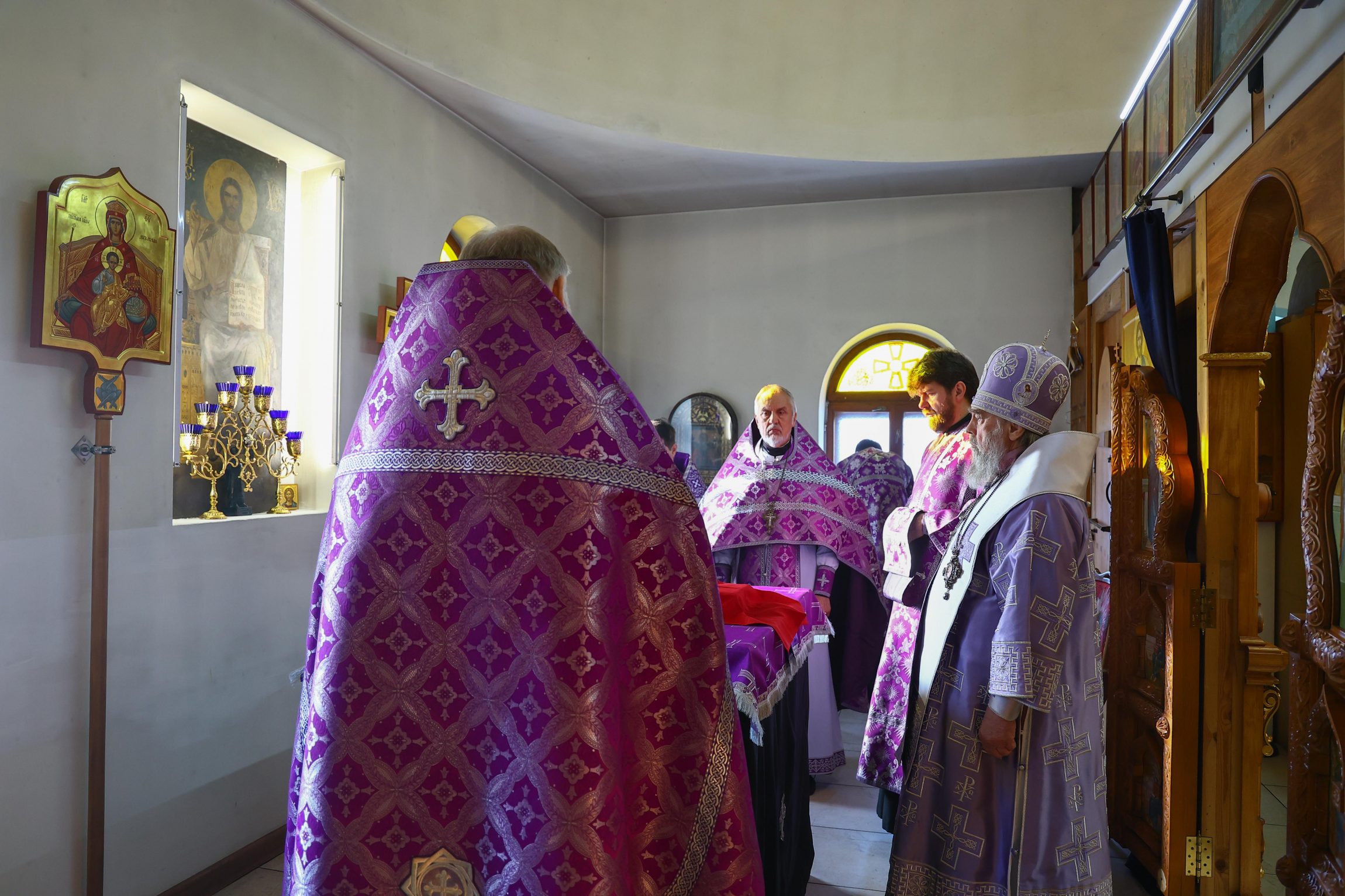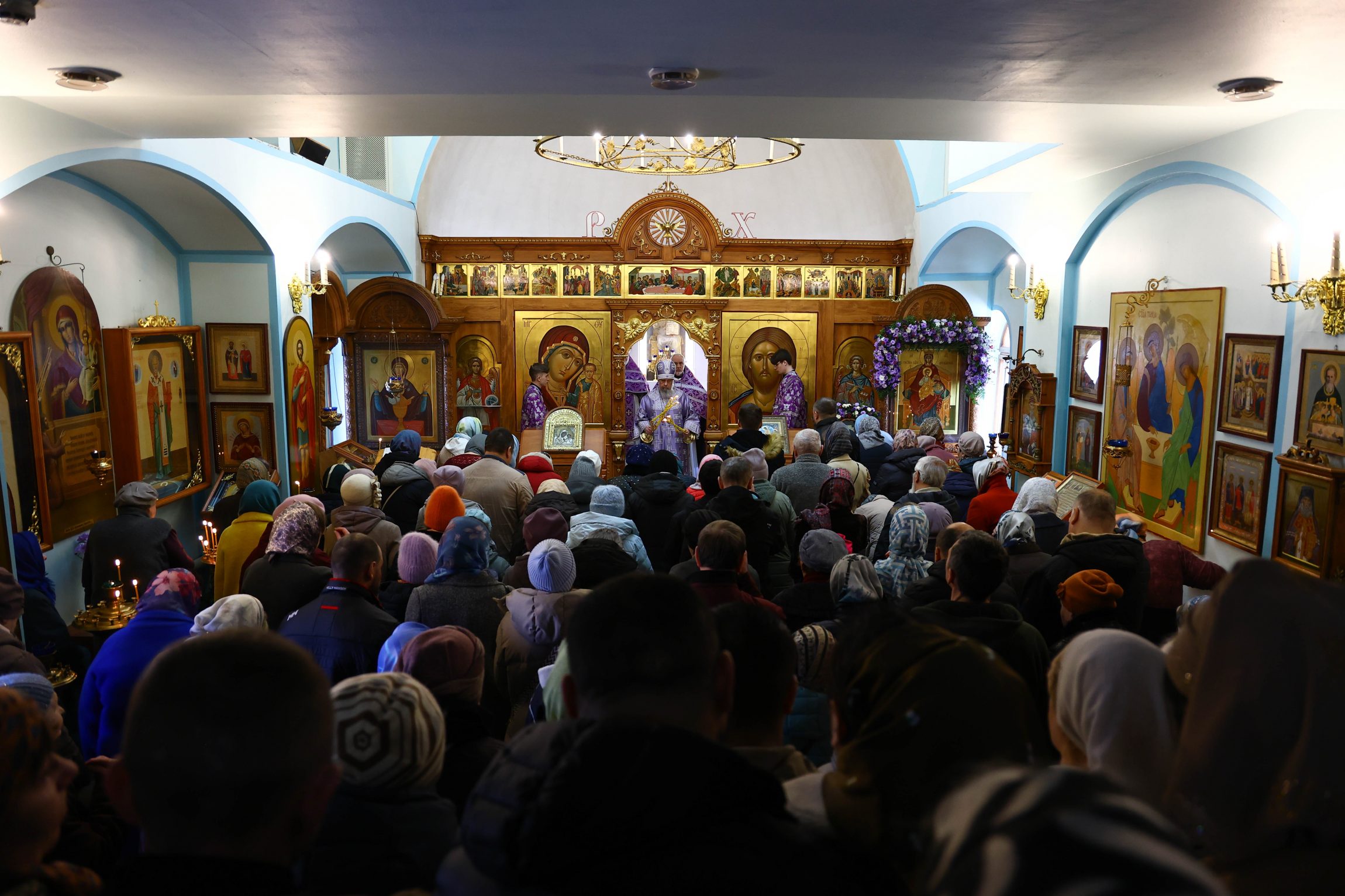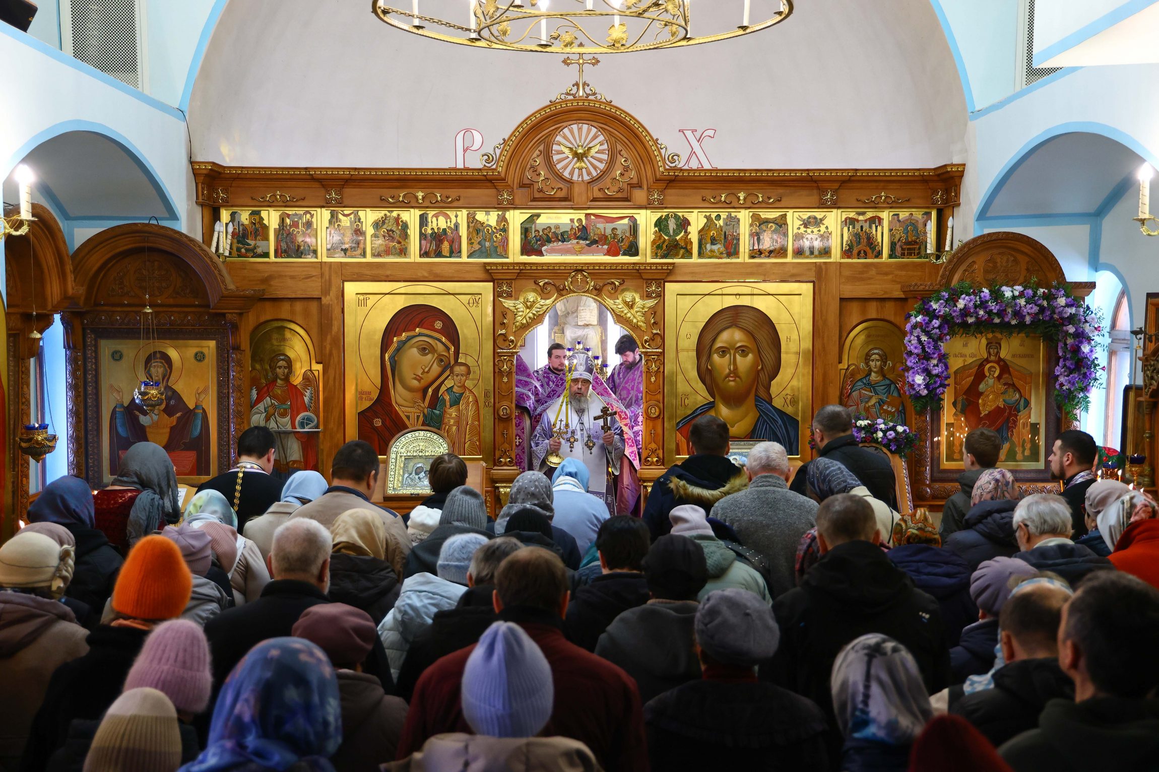 На сугубой ектении вознесены молитвы о благопоспешении христолюбивому Российскому воинству в установлении мира в сию лихую годину, на Святую Русь нашедшую, о мире на Украине, а также о сохранении единства святого Православия.
