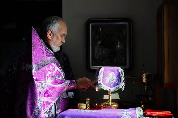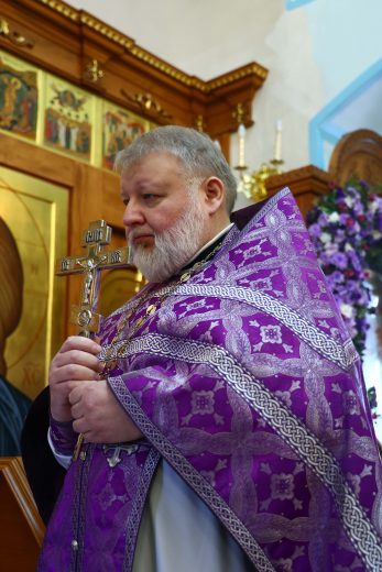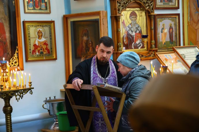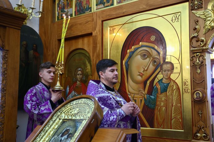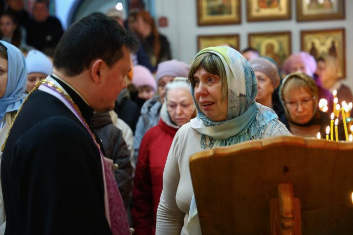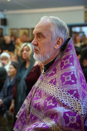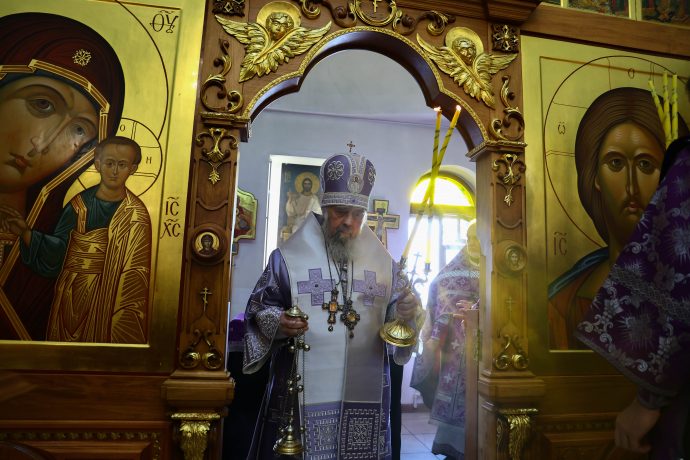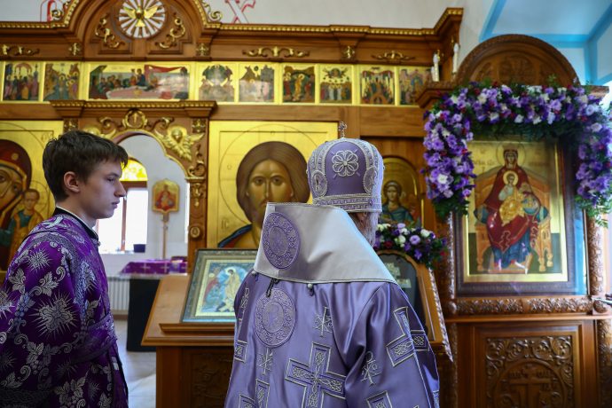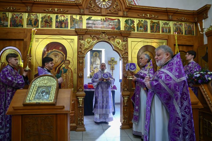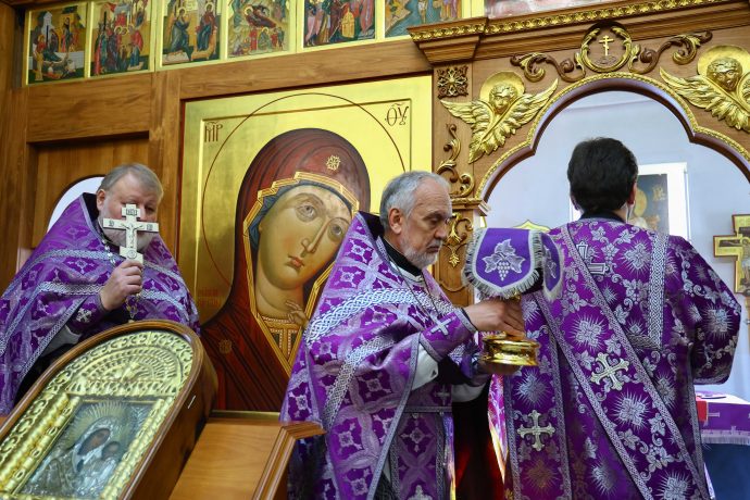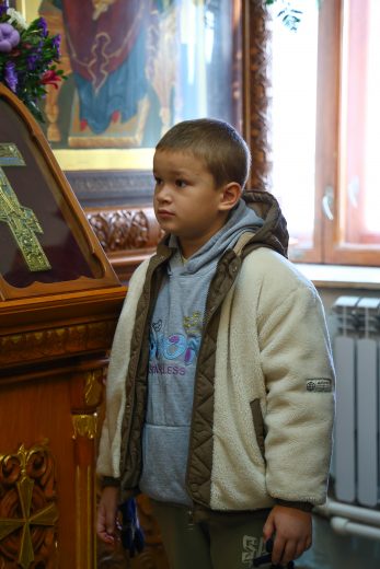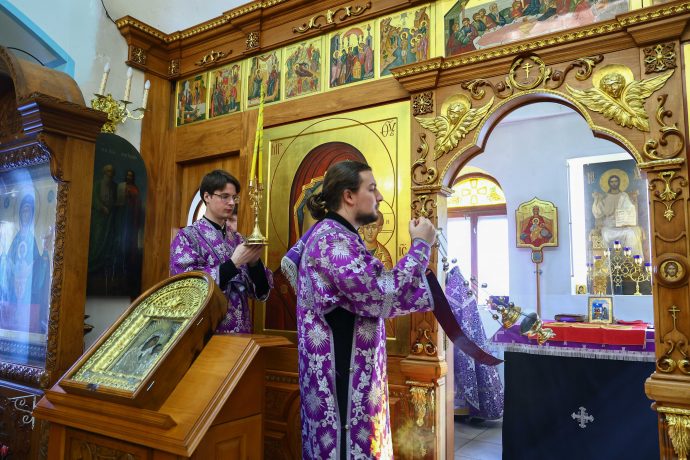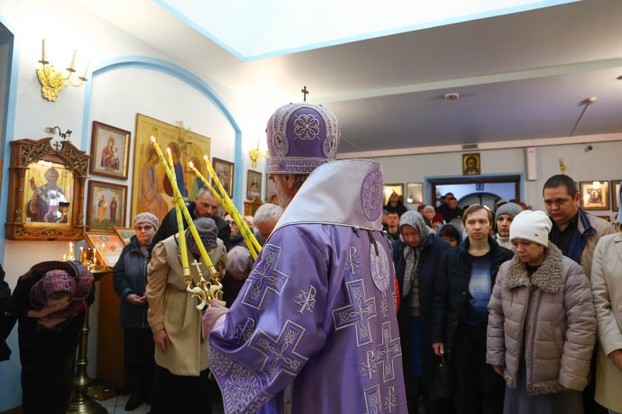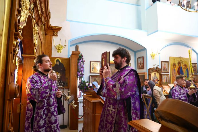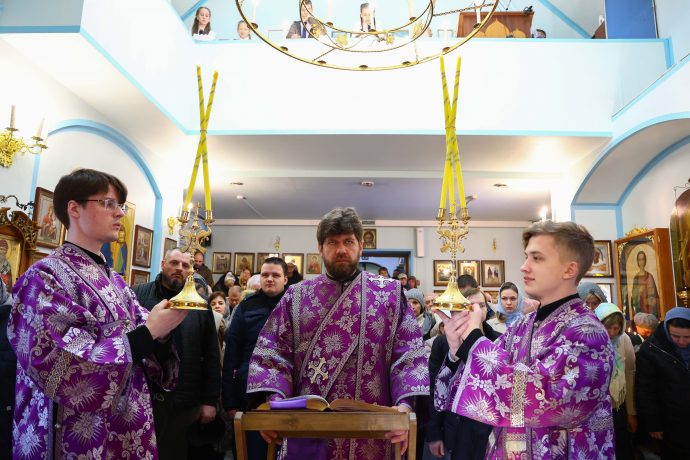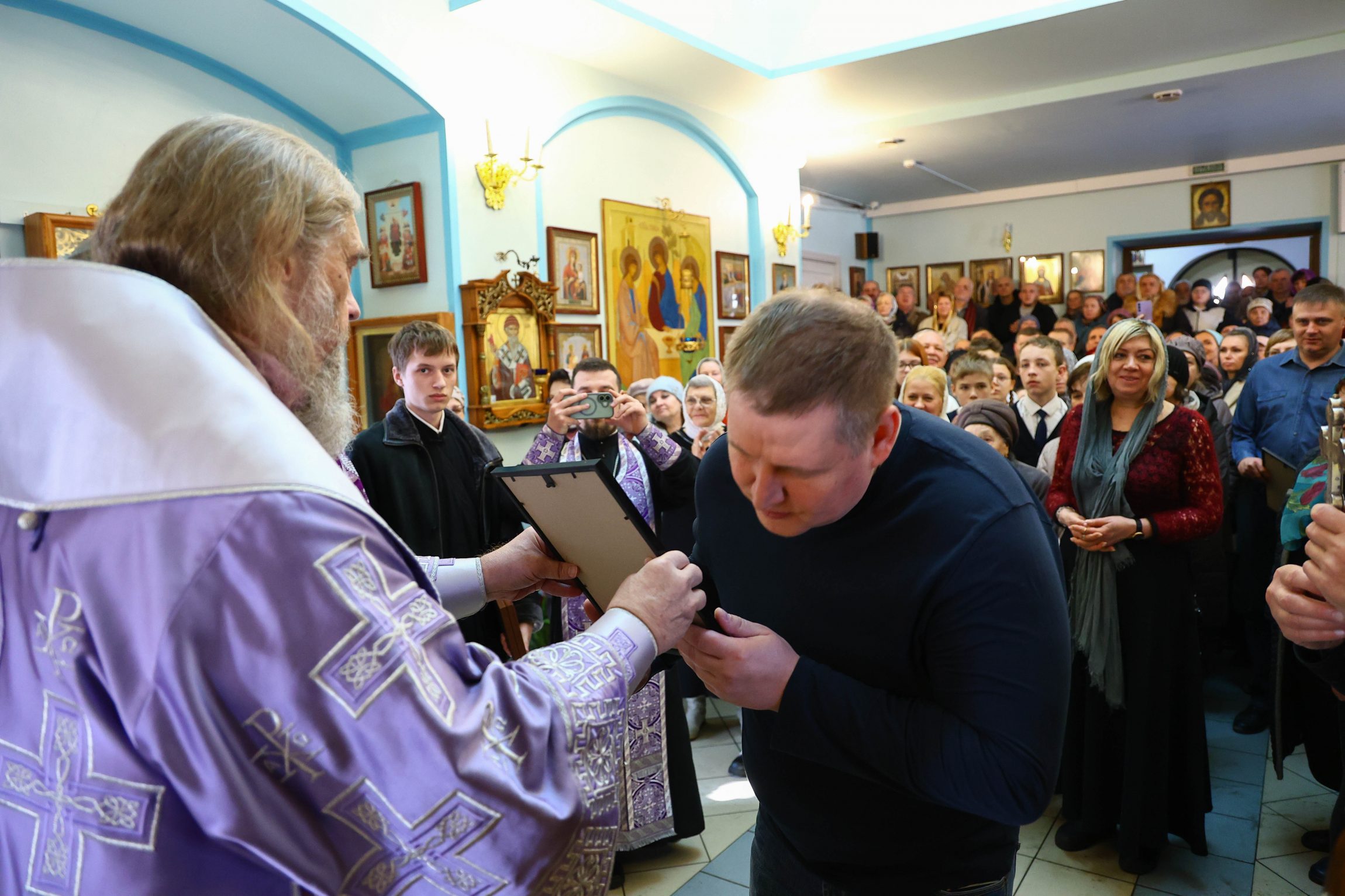На сугубой ектении вознесены молитвы о благопоспешении христолюбивому Российскому воинству в установлении мира в сию лихую годину, на Святую Русь нашедшую, о мире на Украине, а также о сохранении единства святого Православия.