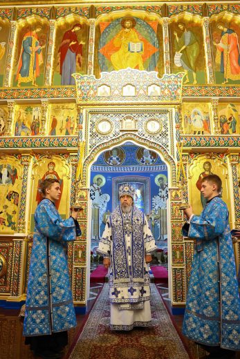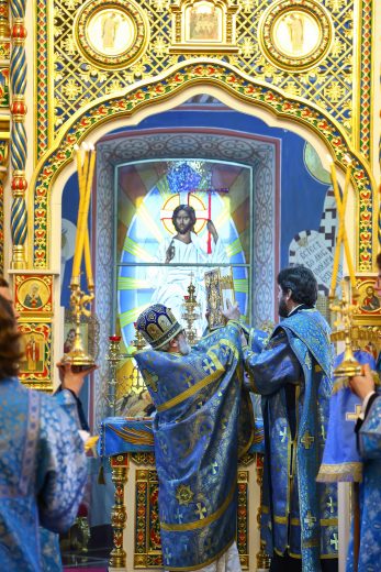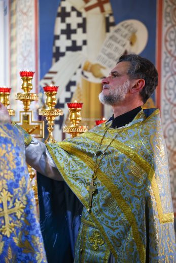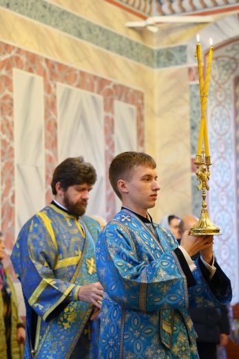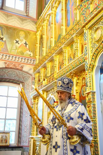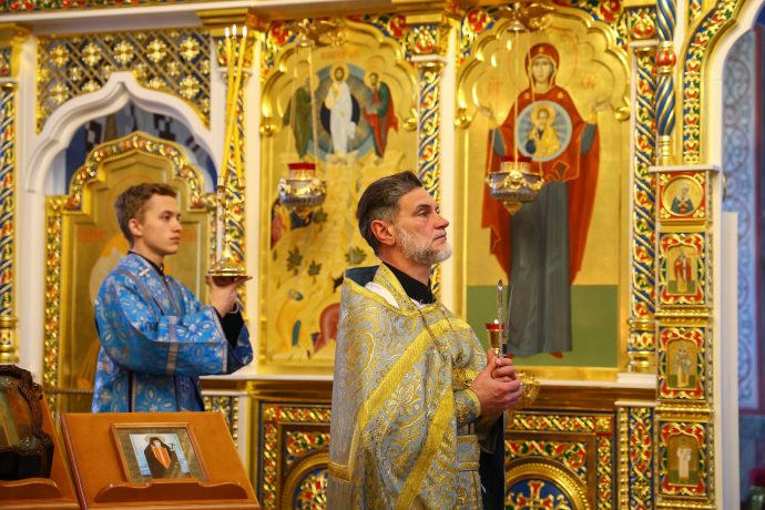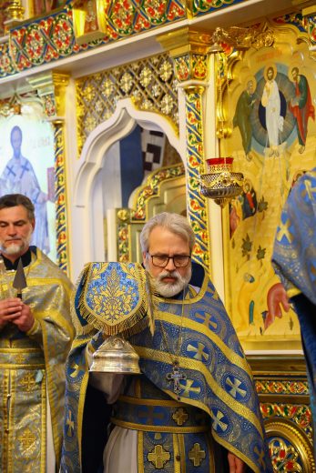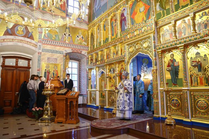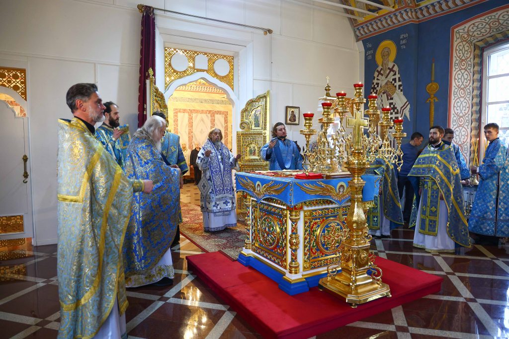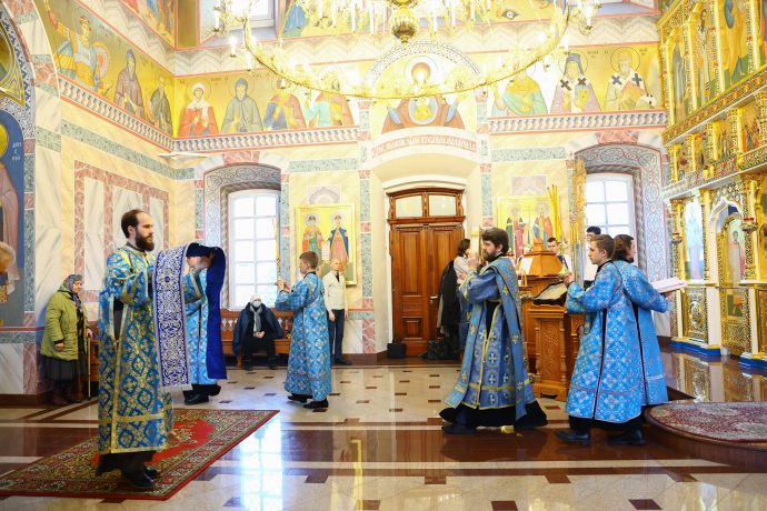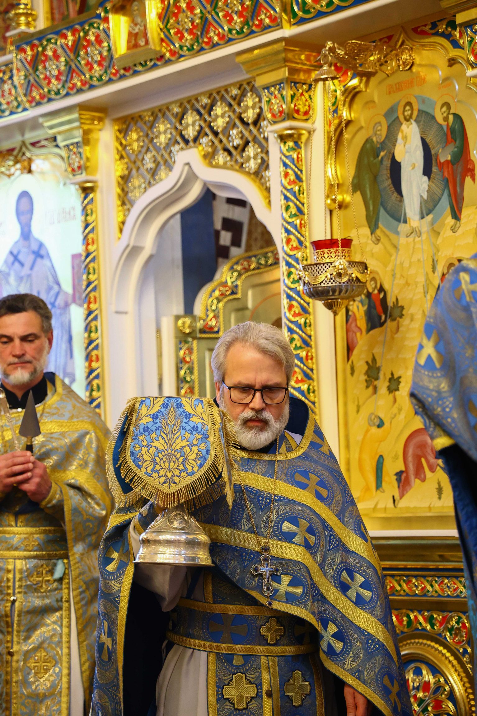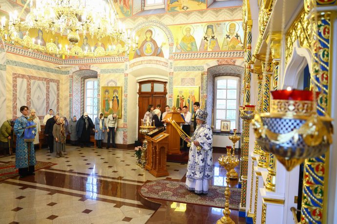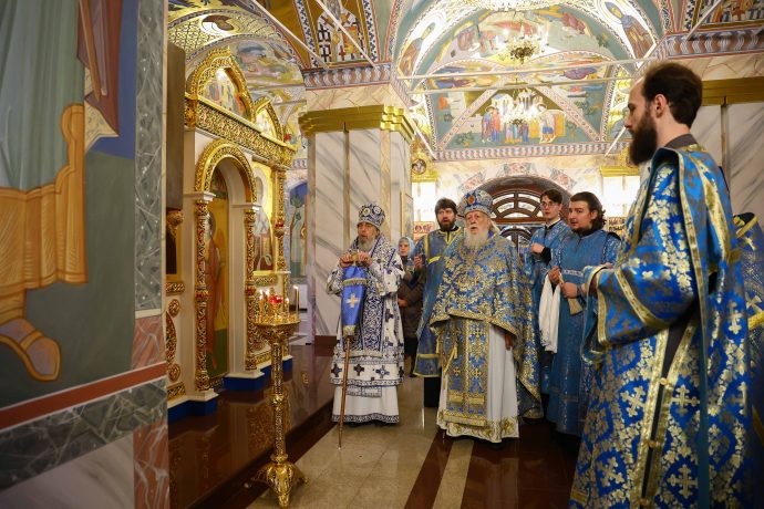 На сугубой ектении вознесены молитвы о благопоспешении христолюбивому Российскому воинству в установлении мира в сию лихую годину, на Святую Русь нашедшую, о мире на Украине, а также о сохранении единства святого Православия.