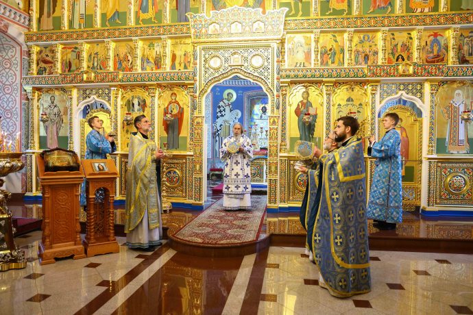Владыка Алексий также поздравил прихожан и паломников, с благоговением и умилением притекающих к местночтимому Корсунскому образу Божией Матери, через который, «чудодействуя со времени крещения в древнем городе Корсуни равноапостольного великого князя Владимира, Преблагословенная Матерь Жизни нашей не перестает и поныне содействовать ответственно и осознанно принявшим Святое крещение, изо дня в день всей своей земной жизни доброхотным исполнением евангельских заповедей облекаться во Христа (Гал. 3: 27), подобно апостолу от двенадцати Иакову Алфееву и преподобному исповеднику, Севастиану Карагандинскому, единому от богопрославленного сонма старцев Оптинских».