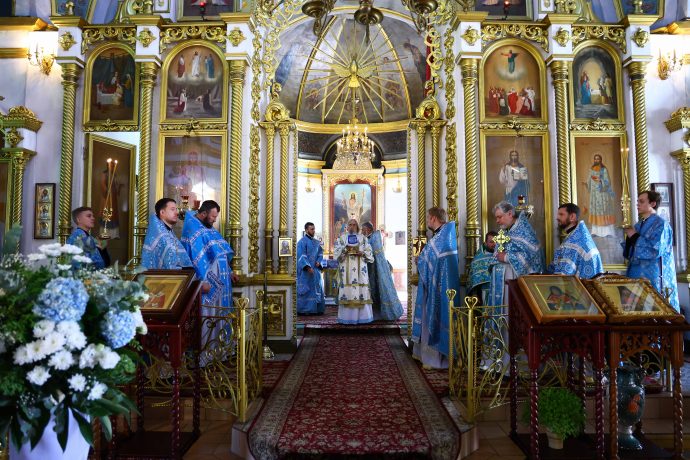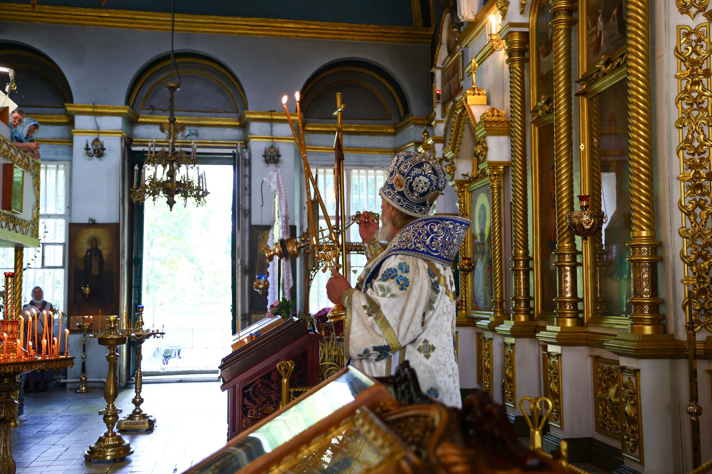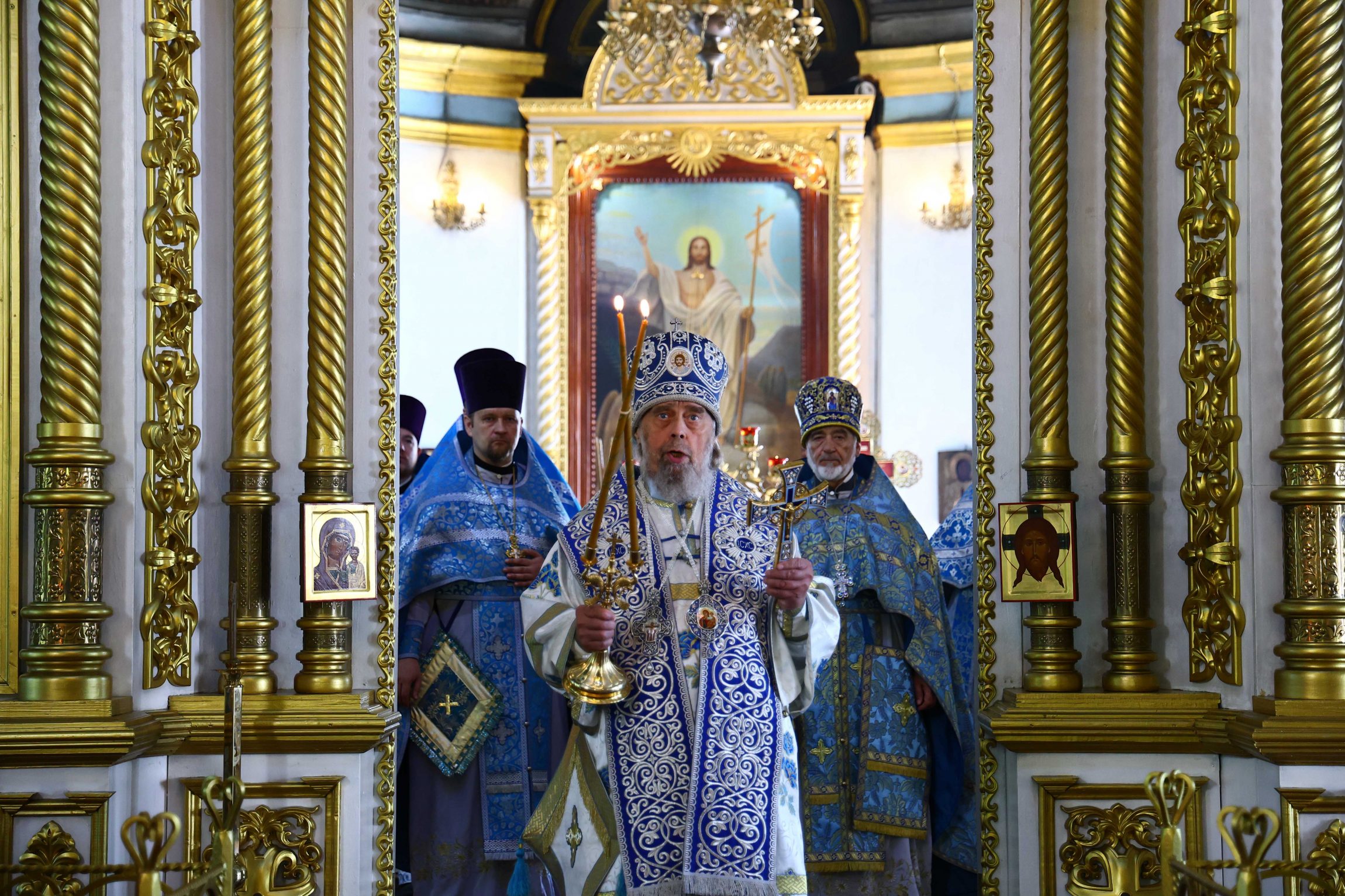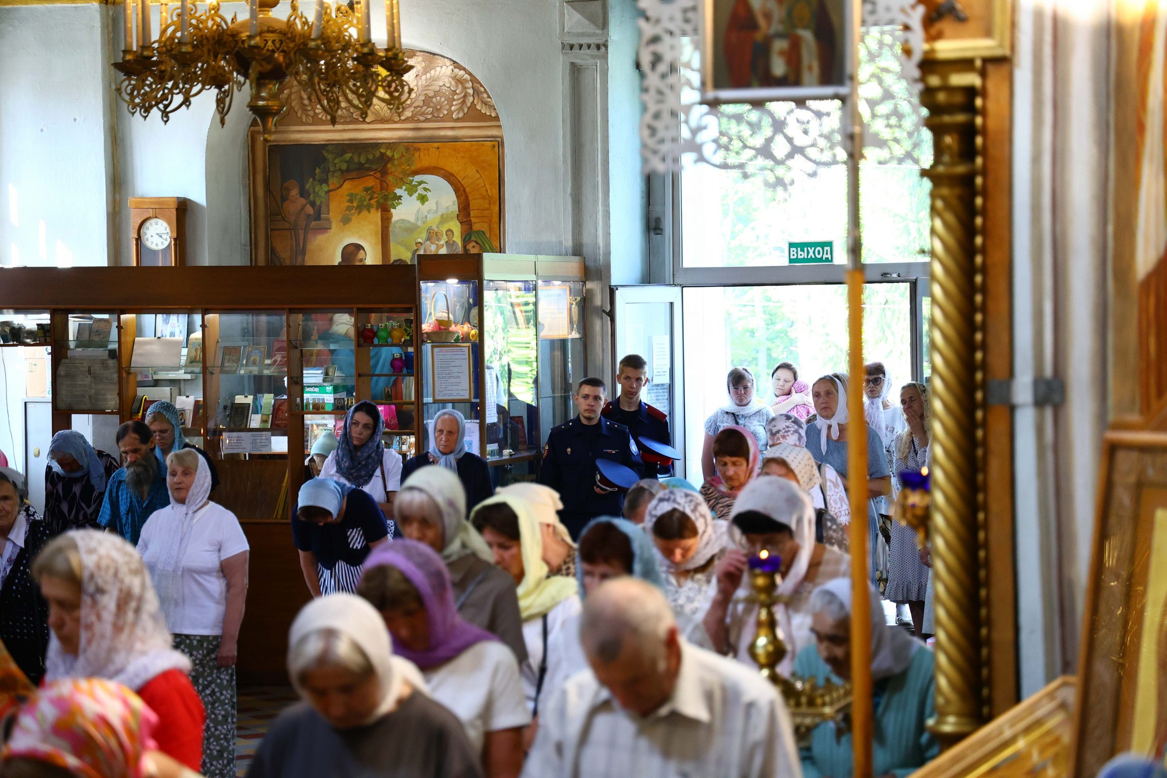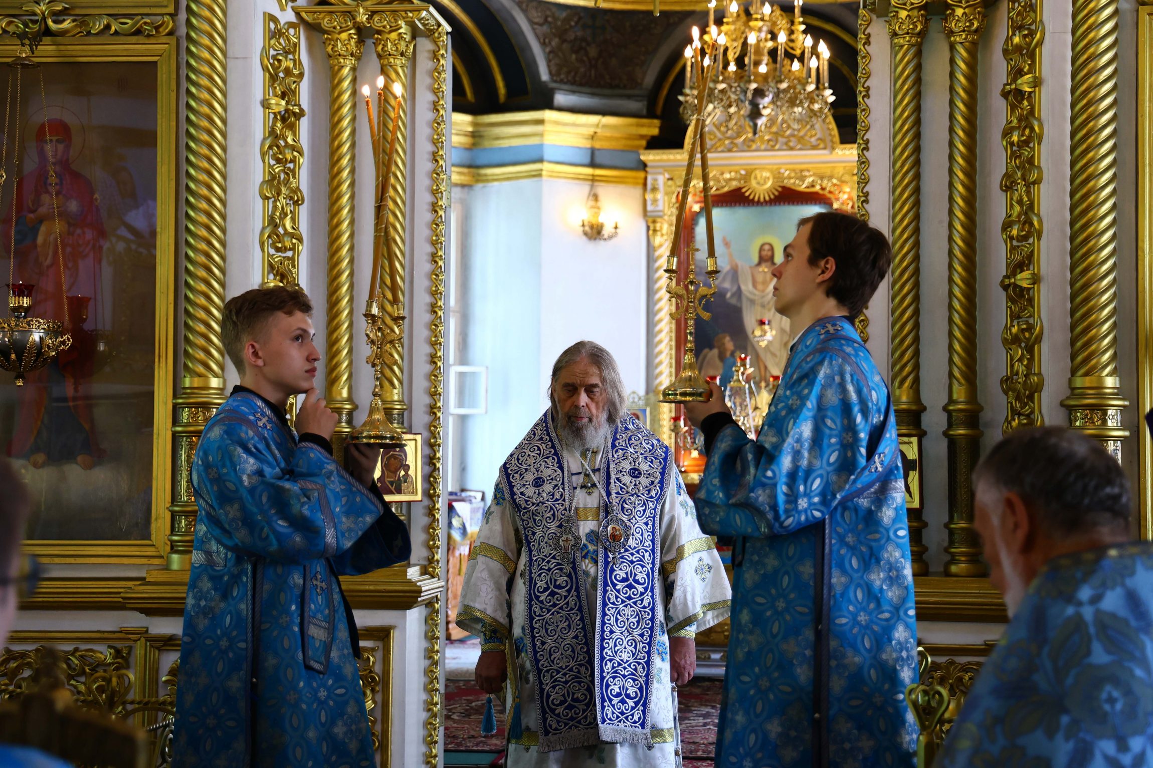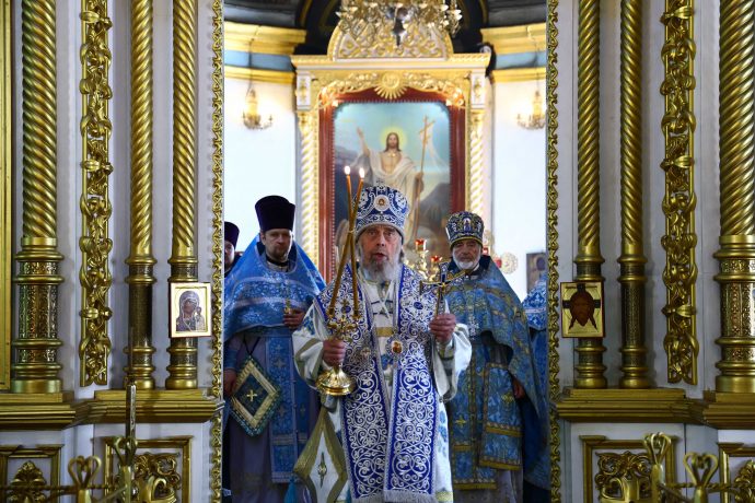 На сугубой ектении вознесены молитвы о благопоспешении христолюбивому Российскому воинству в установлении мира в сию лихую годину, на Святую Русь нашедшую, о мире на Украине, а также о сохранении единства святого Православия.