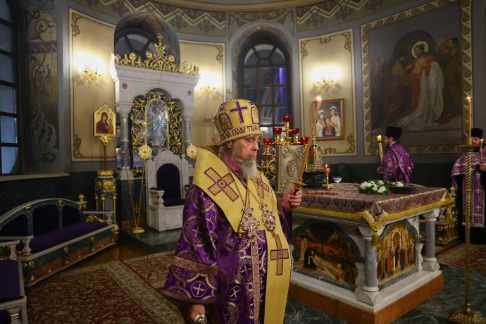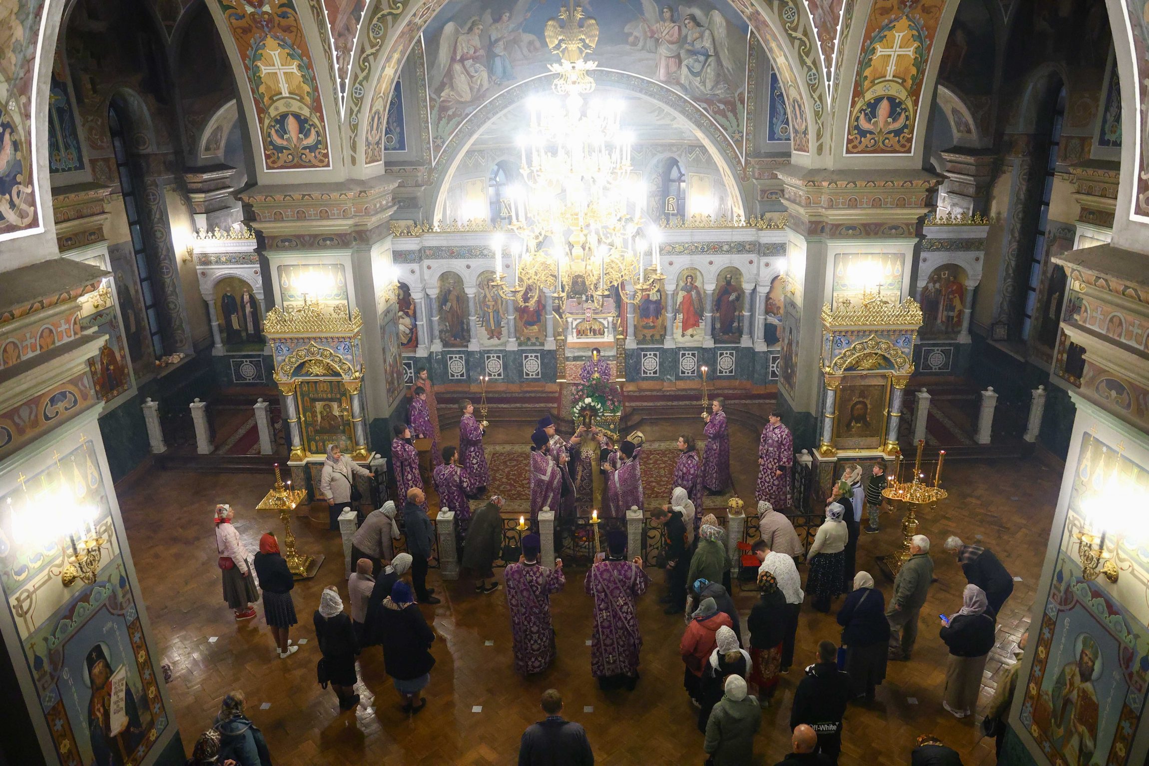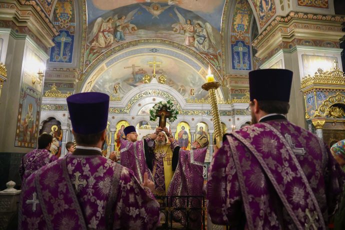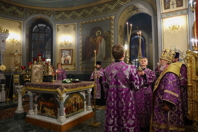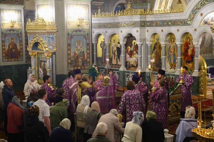 Митрополит Тульский и Ефремовский Алексий совершил всенощное бдение с чином Воздвижения Креста Господня в Успенском кафедральном соборе города Тулы в сослужении соборного духовенства.