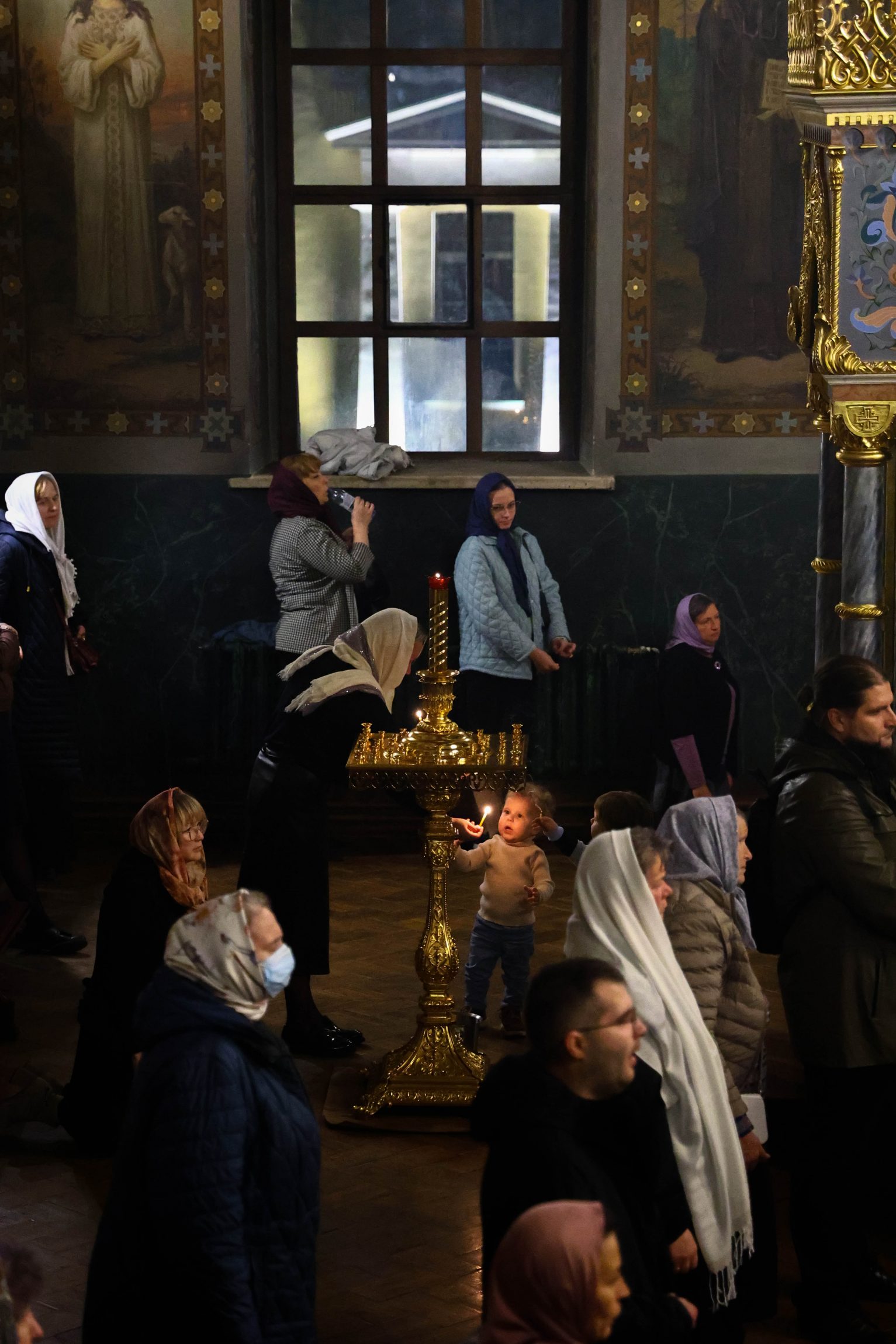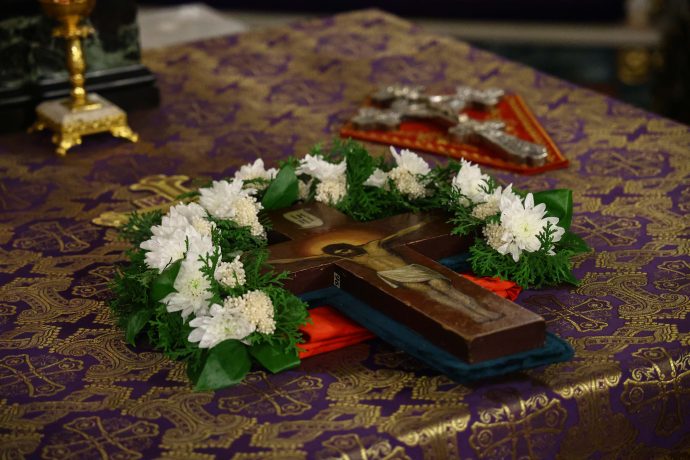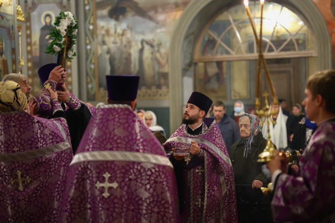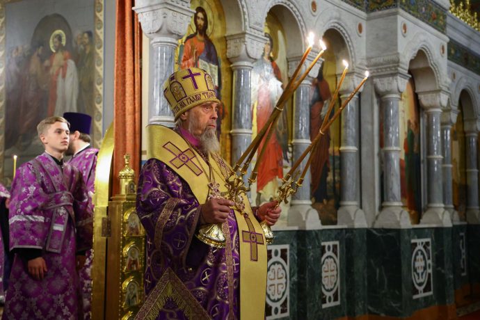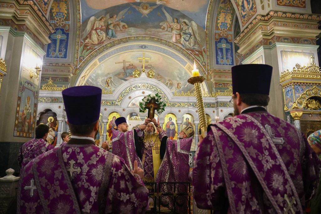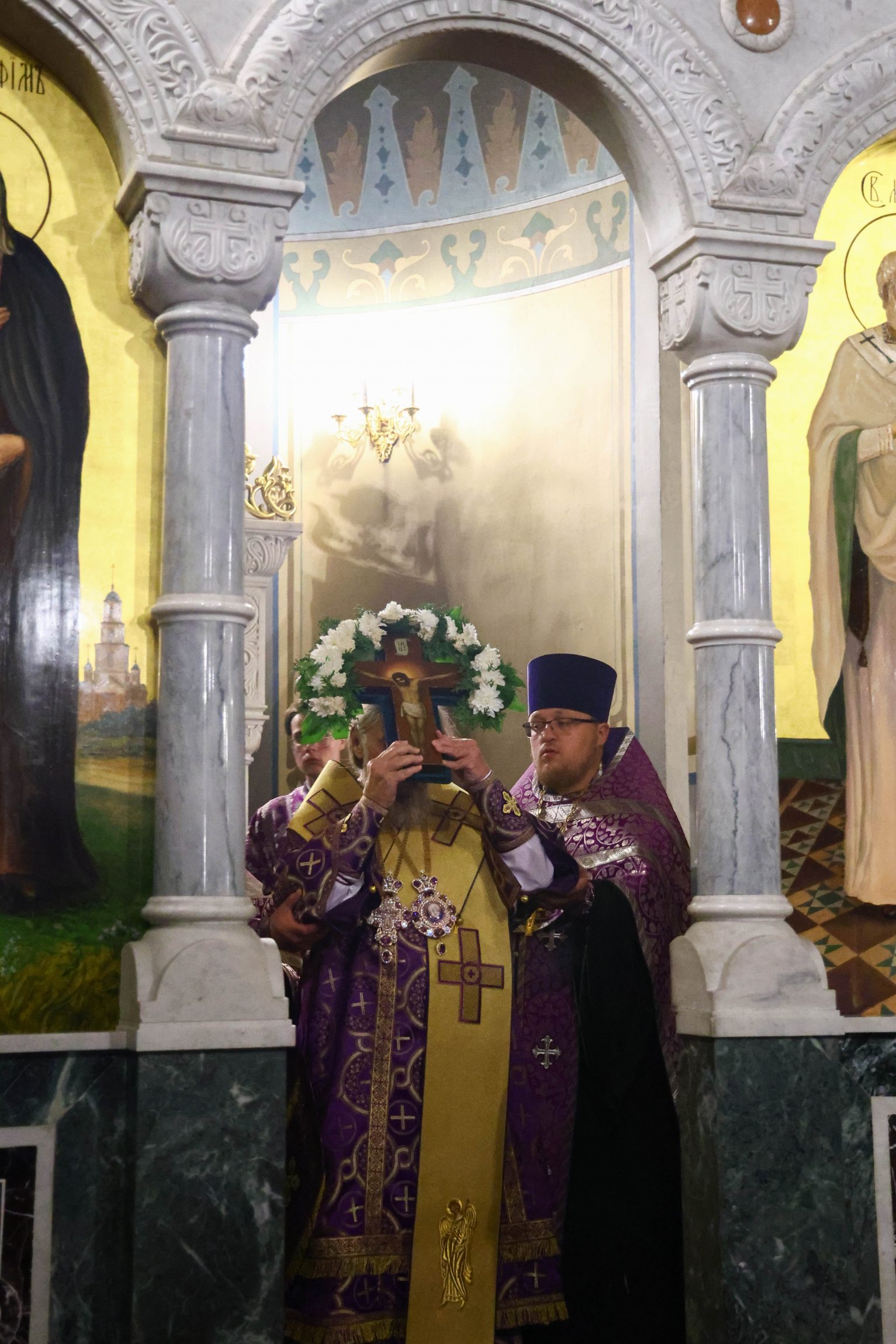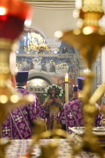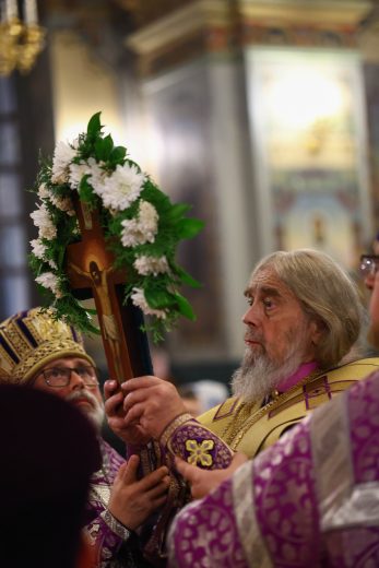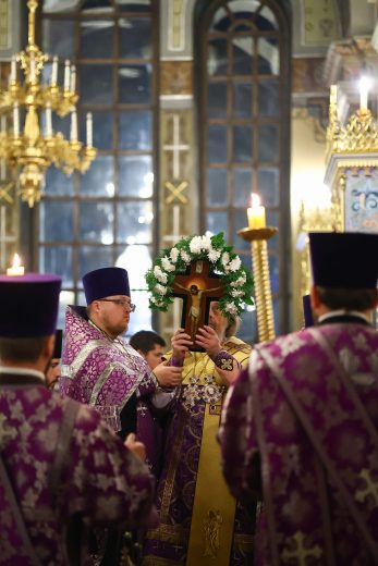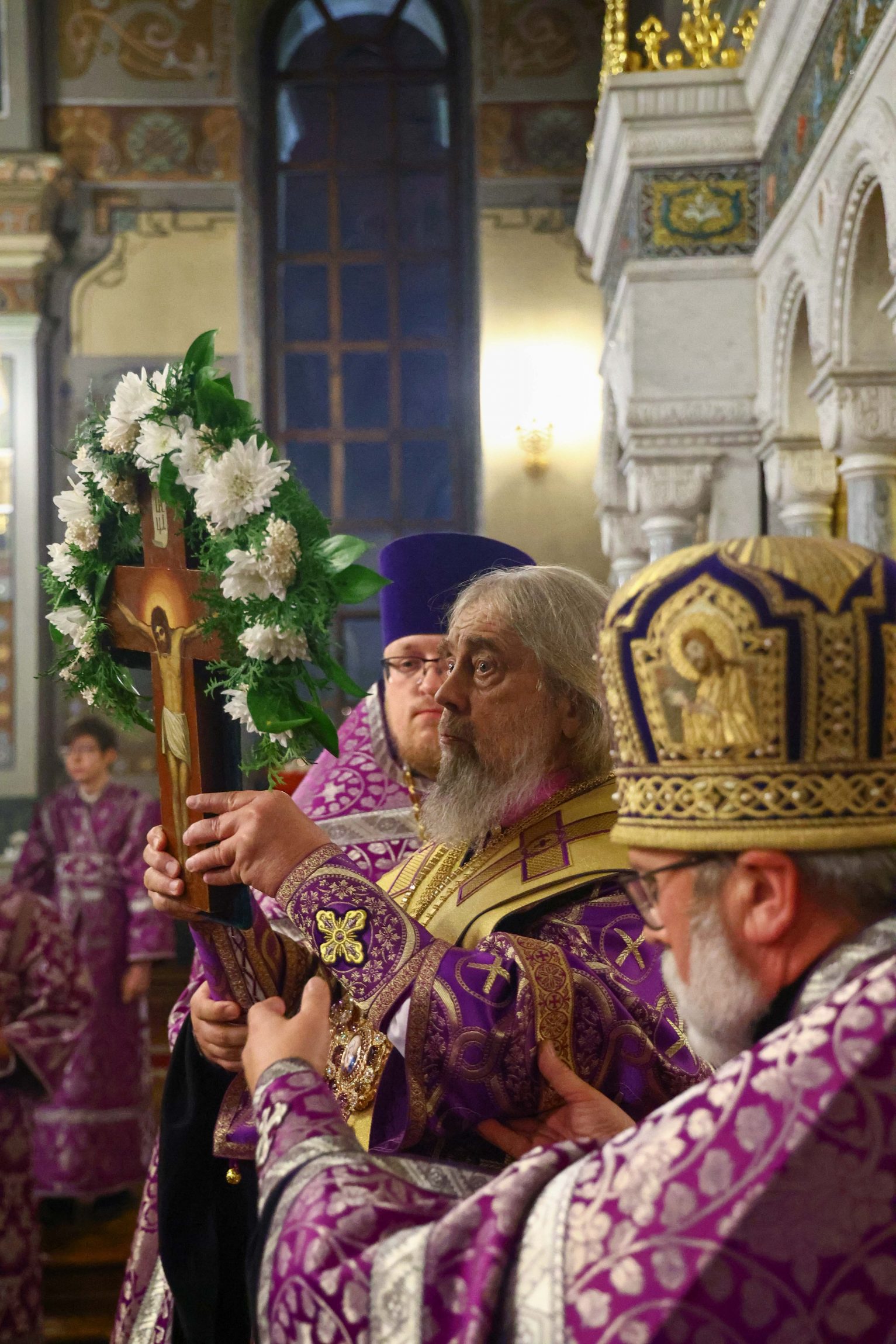 По отпусте владыка приветствовал участников общей молитвы словом мира и любви о Христе: «В благословенное сие навечерие мироспасительного события обретения и Воздви́жения Честно́го и Животворящего Креста Господня приветсвую всех вас, всечестные отцы и возлюбленные о Господе братья и сестры!