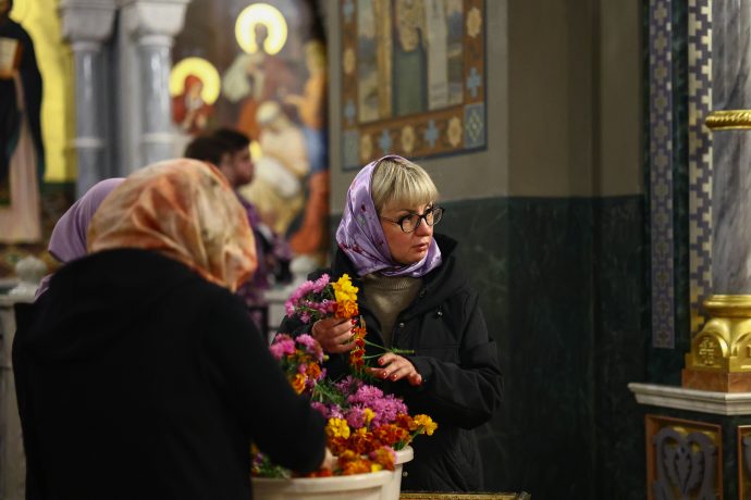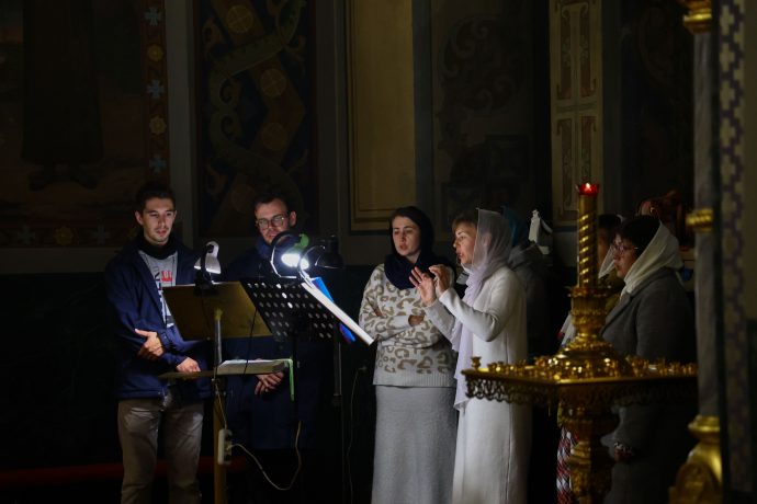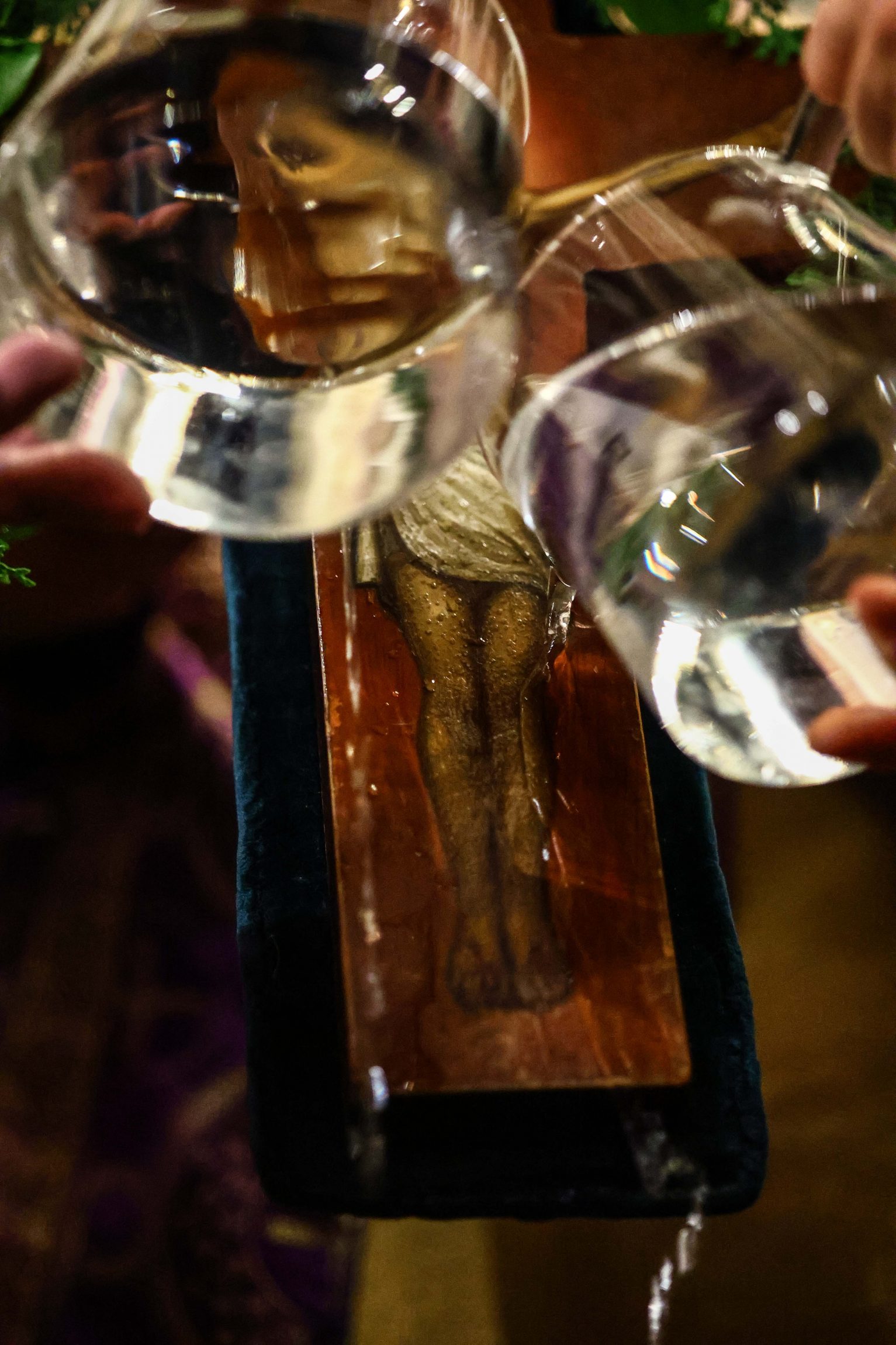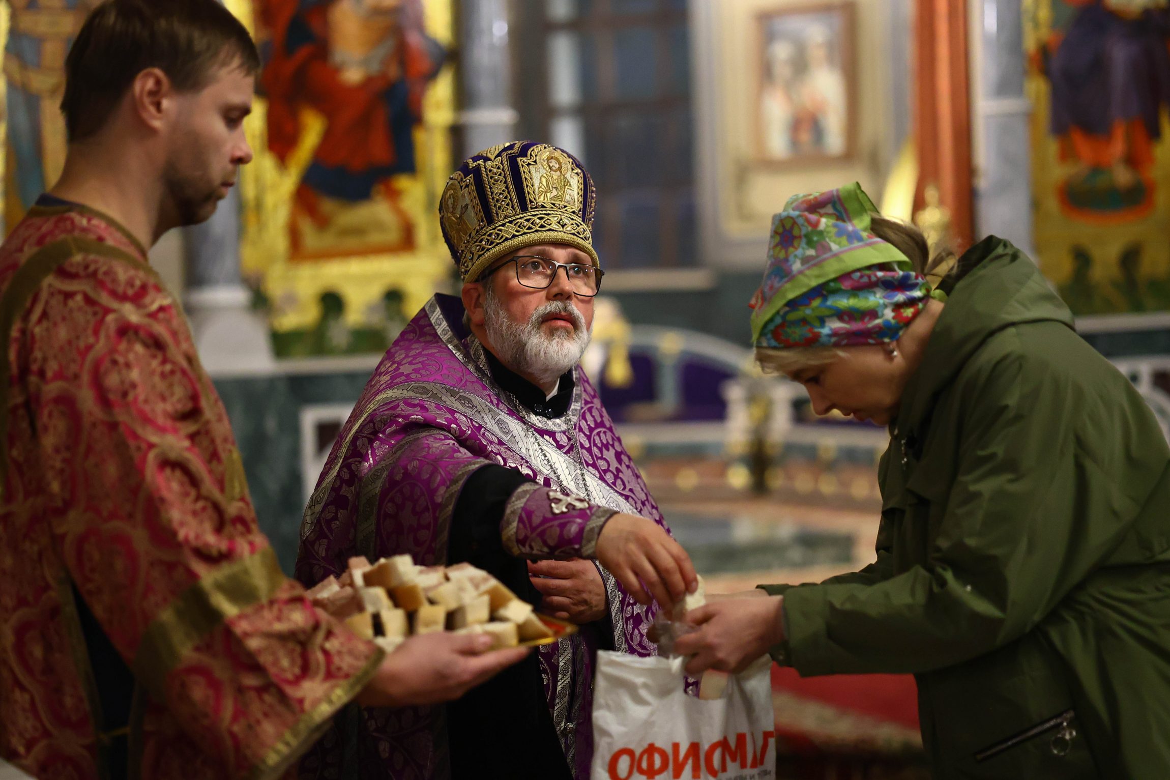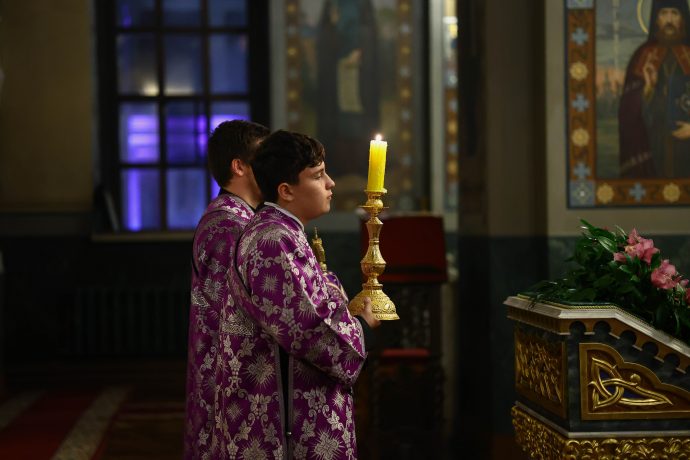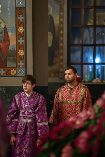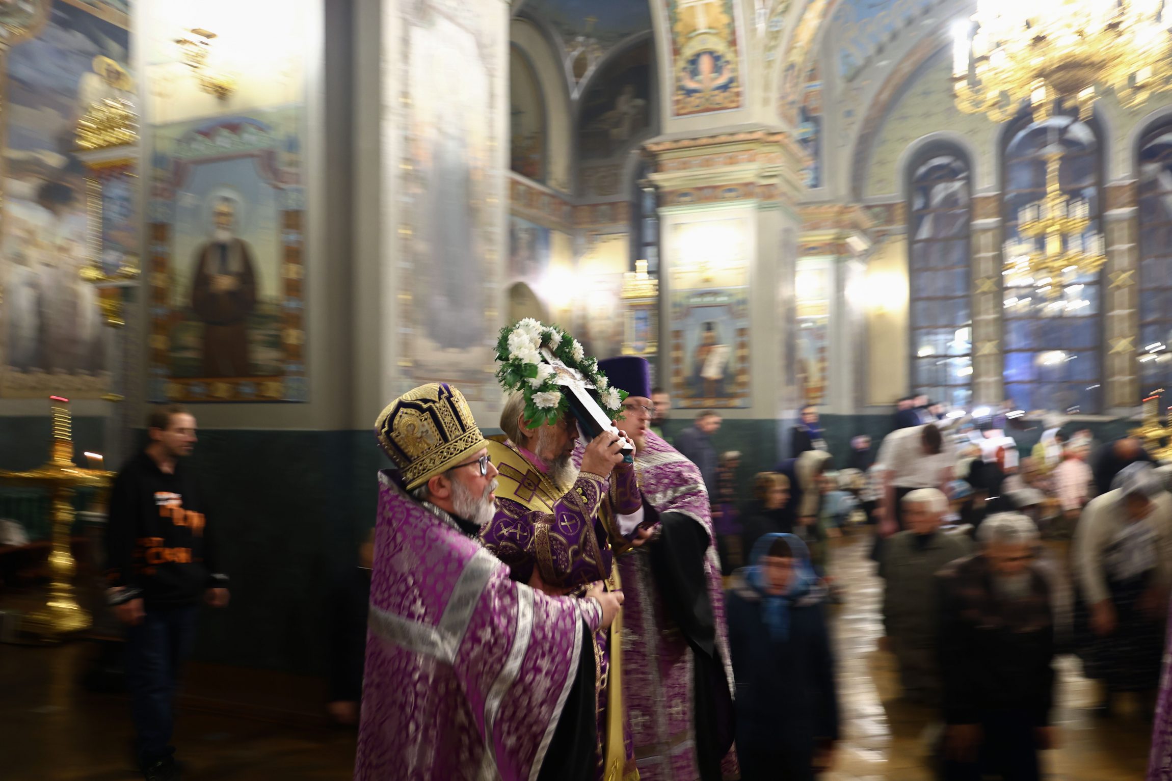 По отпусте владыка приветствовал участников общей молитвы словом мира и любви о Христе: «В благословенное сие навечерие мироспасительного события обретения и Воздви́жения Честно́го и Животворящего Креста Господня приветсвую всех вас, всечестные отцы и возлюбленные о Господе братья и сестры!