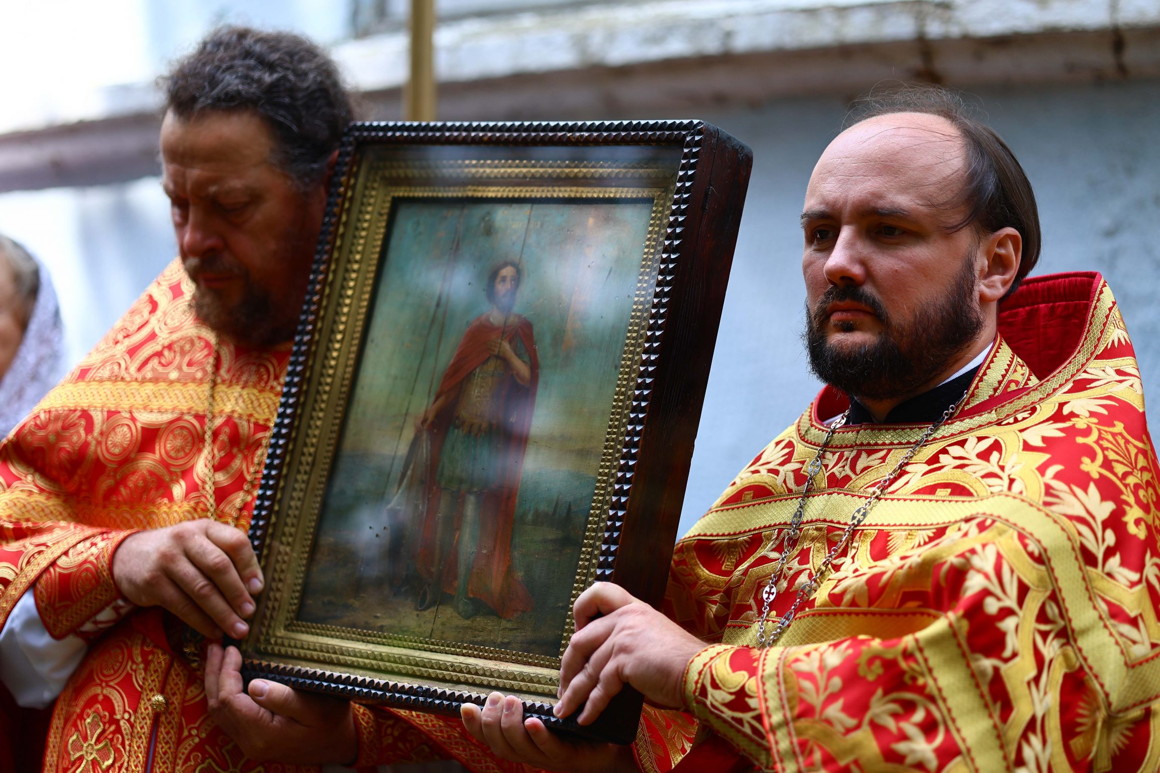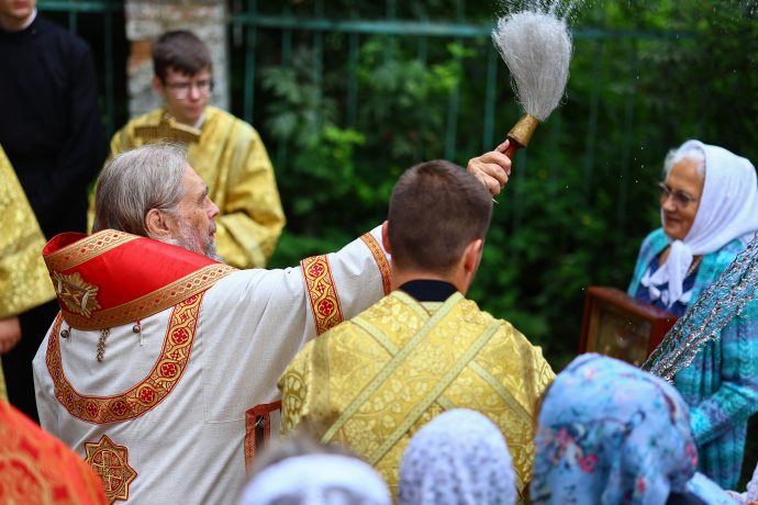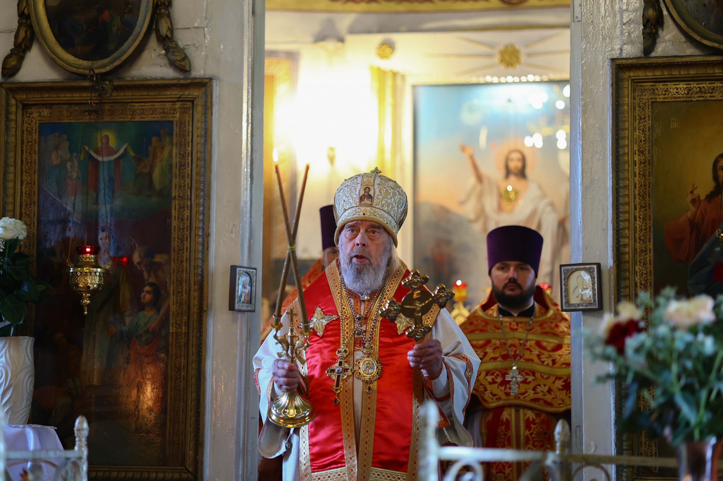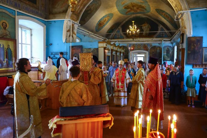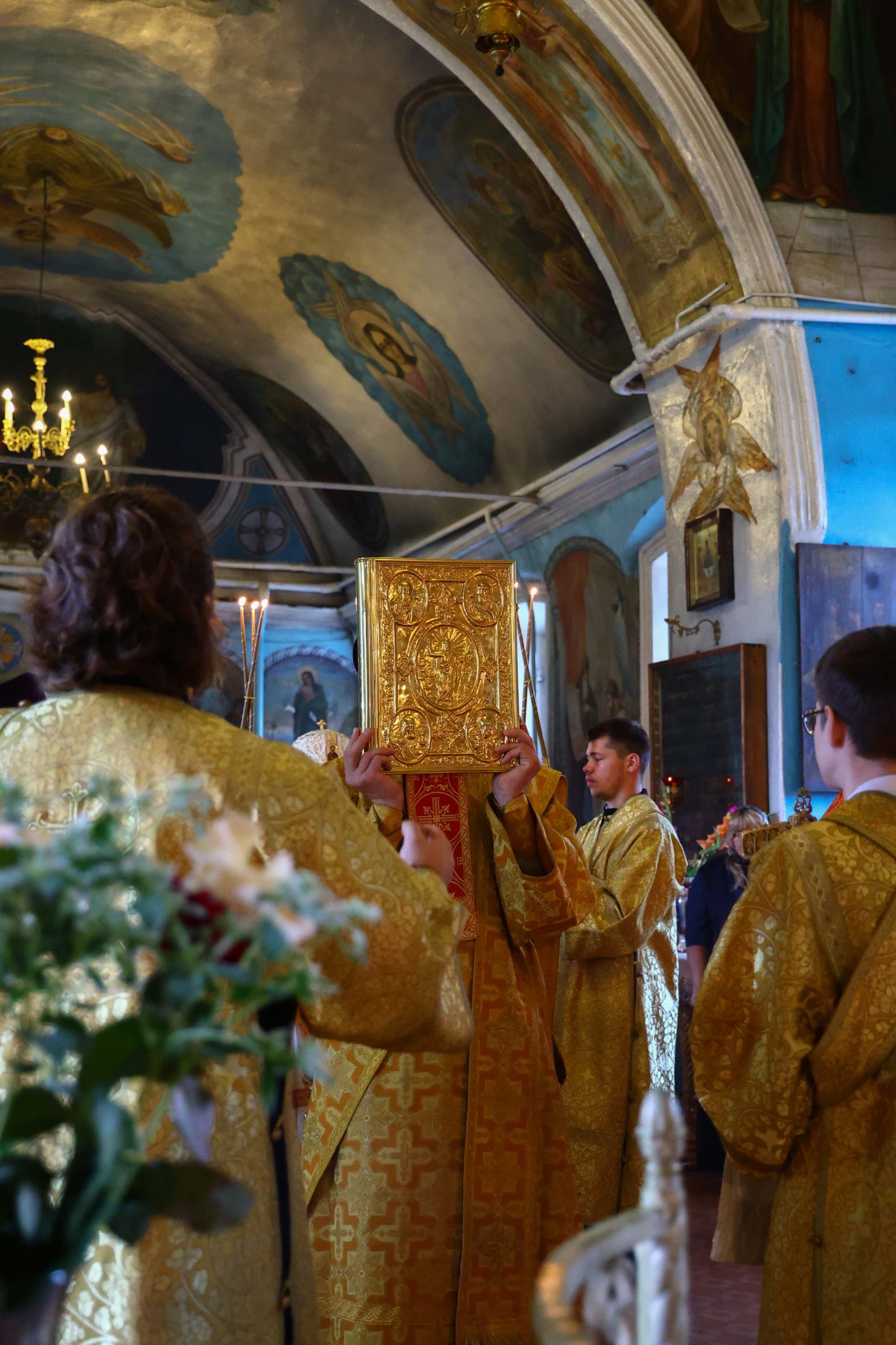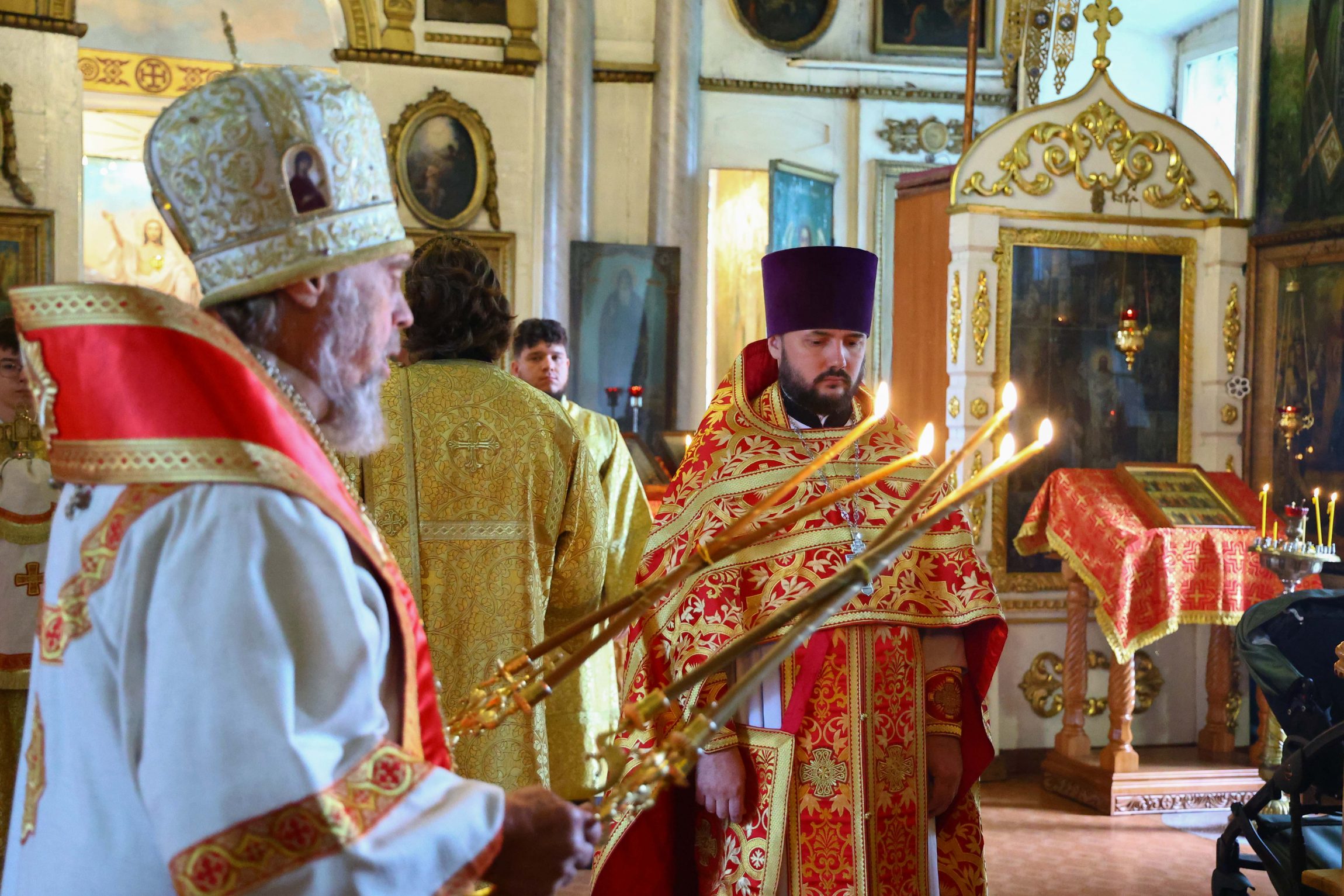 На сугубой ектении вознесены молитвы о благопоспешении христолюбивому Российскому воинству в установлении мира в сию лихую годину, на Святую Русь нашедшую, о мире на Украине, а также о сохранении единства святого Православия, после чего владыка обратился к предстоящим словом мира и любви о Христе: «В благословенный день престольного праздника сего святого храма и мы на Ефремовской земле, в благознаменитом селе, носящем замечательное именование Благодать, имеем духовную радость и утешение — взирать на образ одного из покровителей этого Божьего дома — добропобедного Христова мученика Иоанна Воина, мысленно созерцать красоту его христоподобия и соотносить себя как в своем внутреннем человеке (2 Кор. 4:16), так и во внешнем своем человеке с его достоинством и красотою. И если же заметим свою непохожесть на него, но при этом почему-то именуем себя христианами, то устыдимся такой неправедности и постараемся войти доброхотно в единомыслие, единонравие, единочувствие, единодушие и единодействие с ним, как и с другими христоподобными человеками, среди которых особенно сияет Божия Матерь, благодатному Покрову Которой посвящен этот святой храм, и, таким образом, начнем себя не только называть христианами, а быть ими по самой сути нашей жизни.
