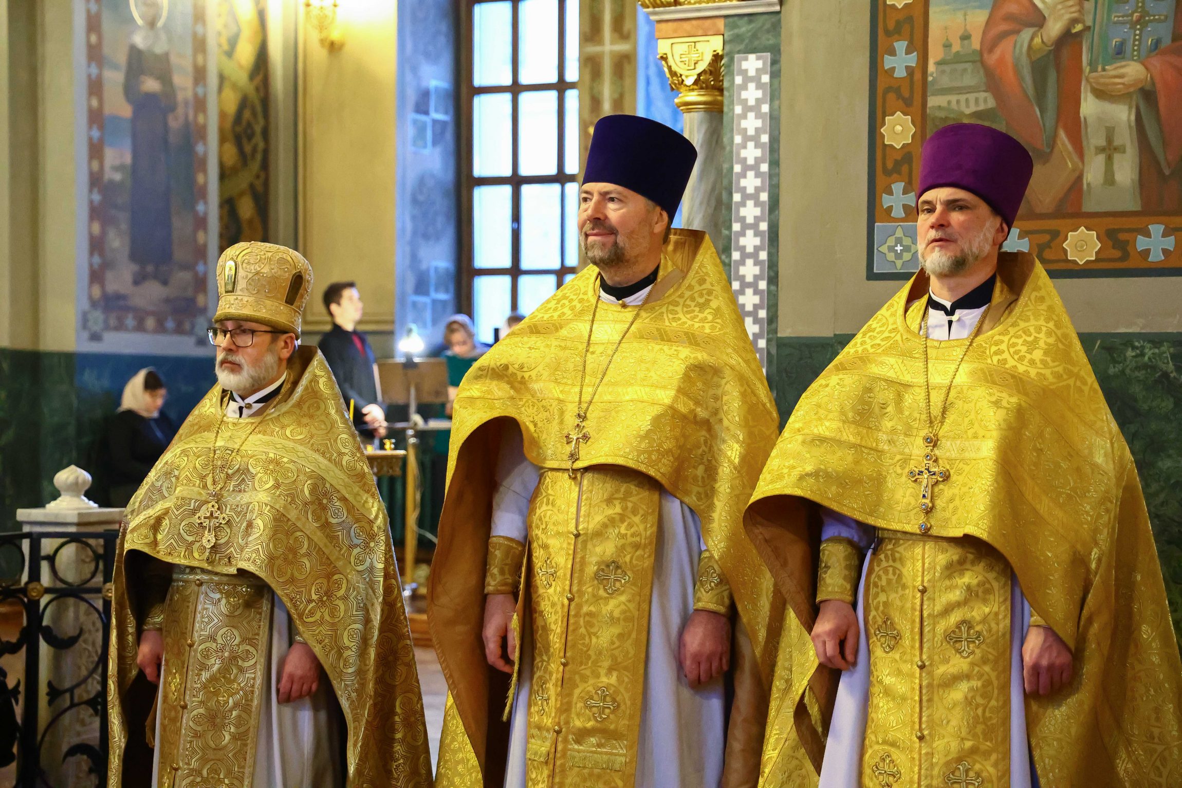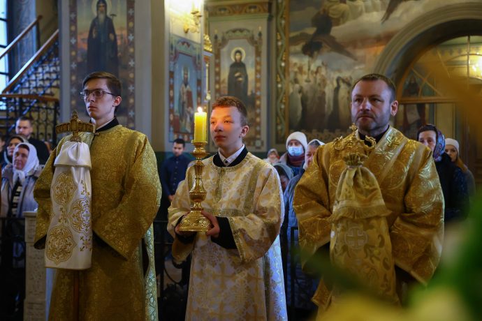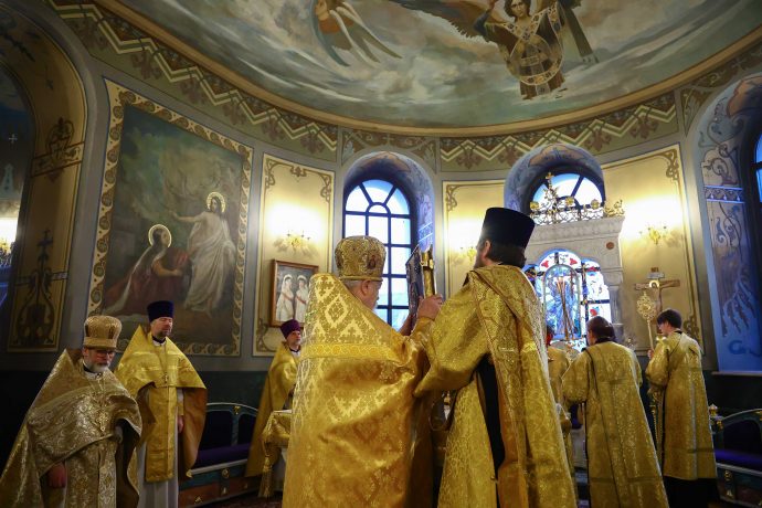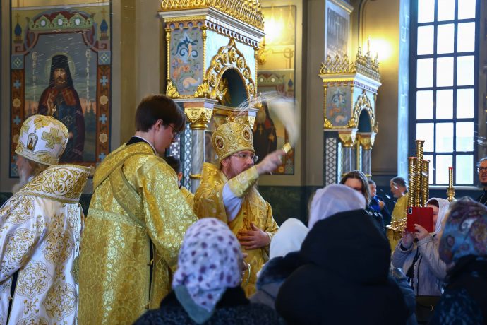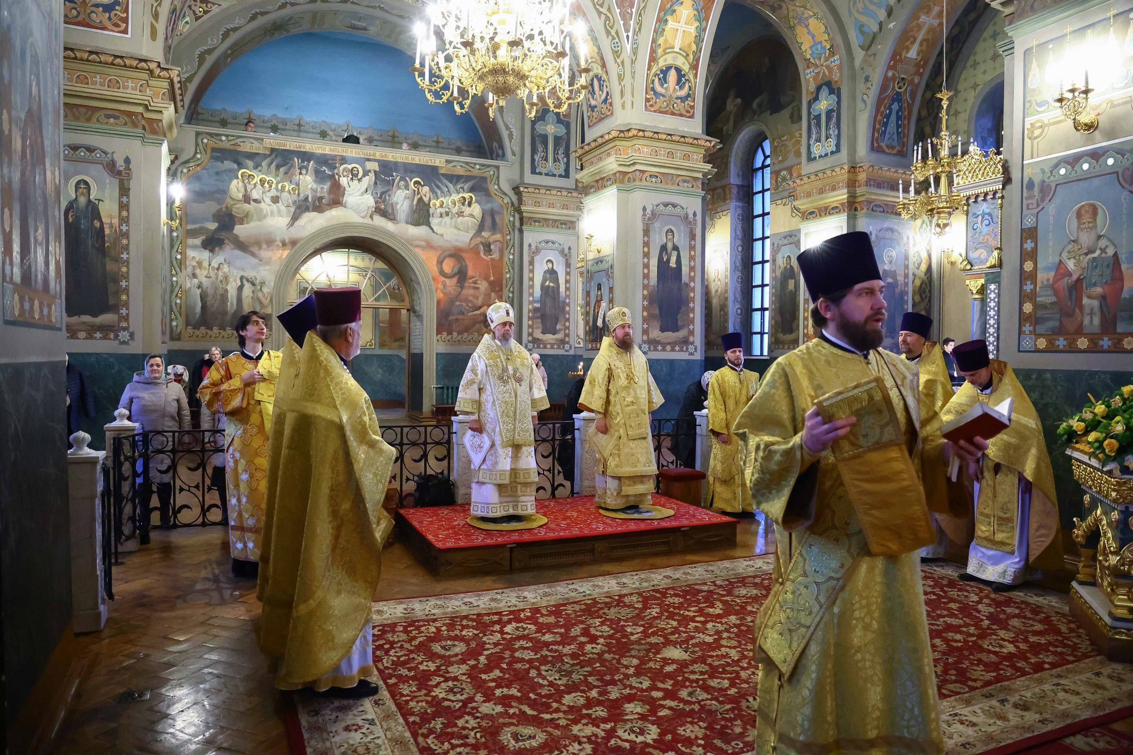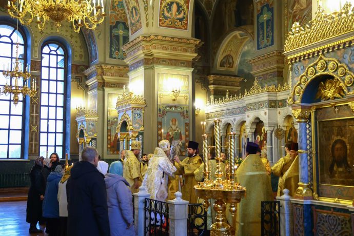На сугубой ектении вознесены молитвы о благопоспешении христолюбивому Российскому воинству в установлении мира в сию лихую годину, на Святую Русь нашедшую, о мире на Украине, а также о сохранении единства святого Православия.