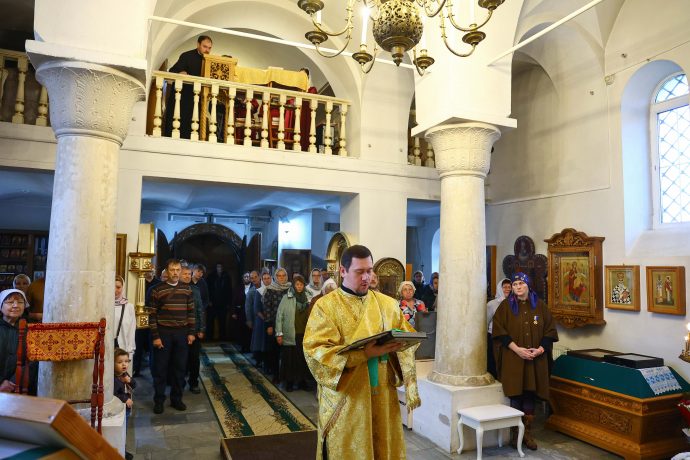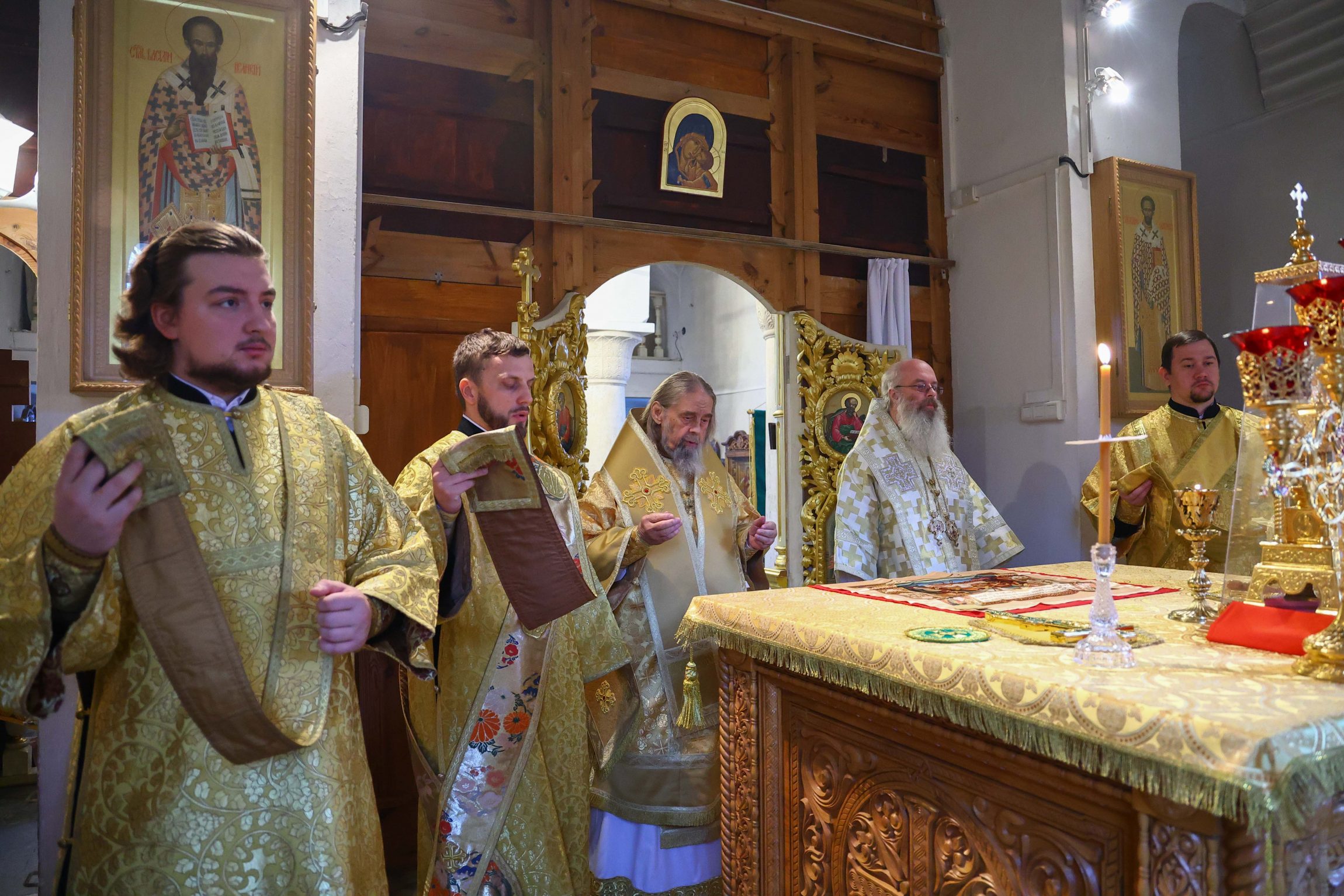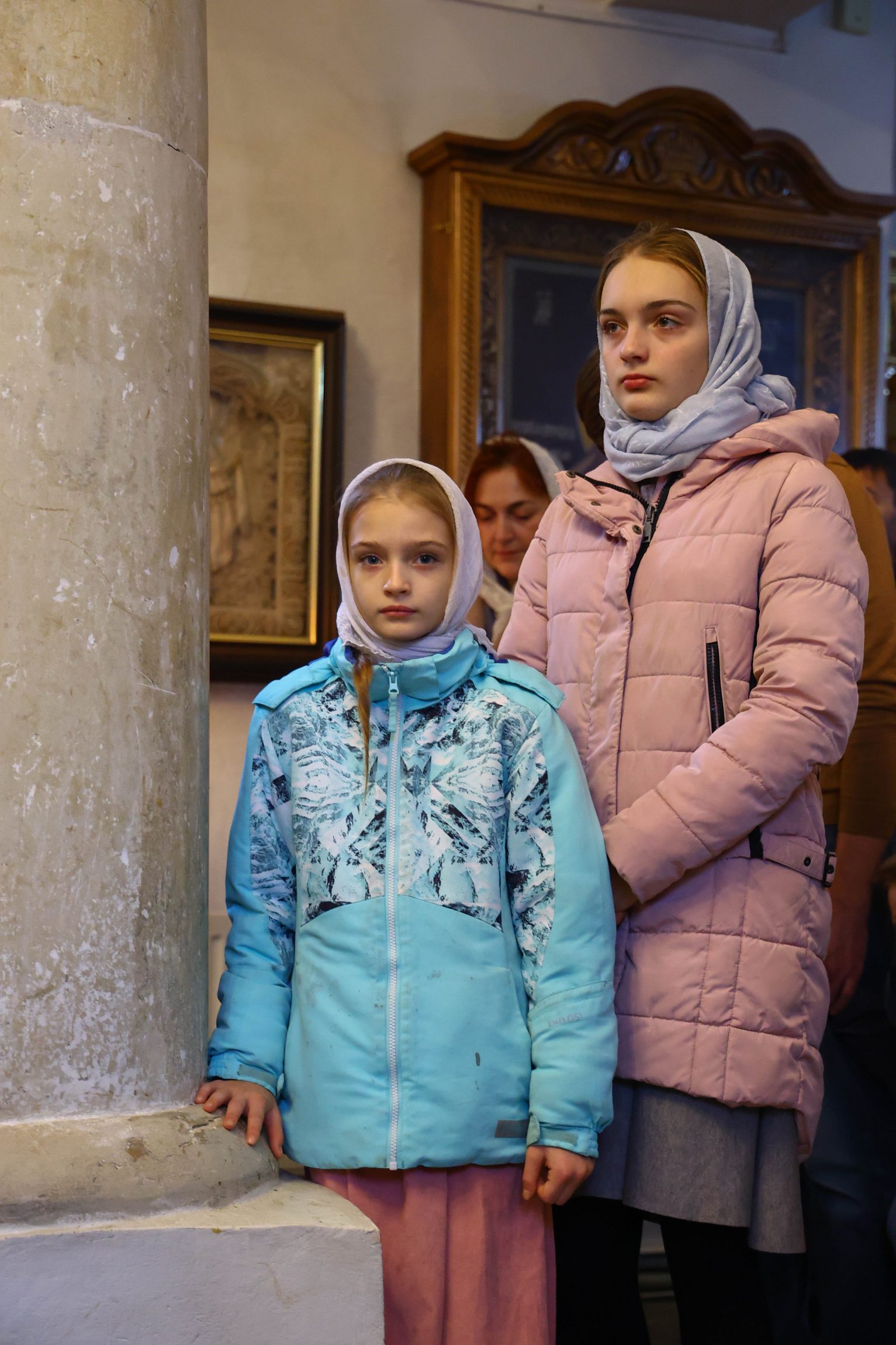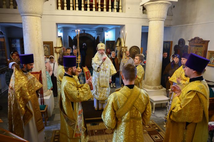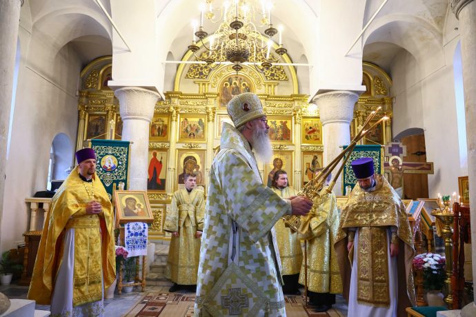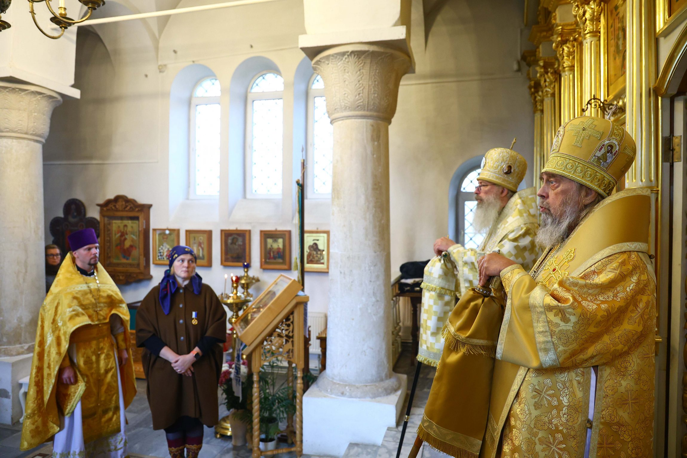 На сугубой ектении вознесены молитвы о благопоспешении христолюбивому Российскому воинству в установлении мира в сию лихую годину, на Святую Русь нашедшую, о мире на Украине, а также о сохранении единства святого Православия.