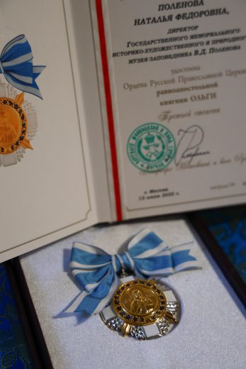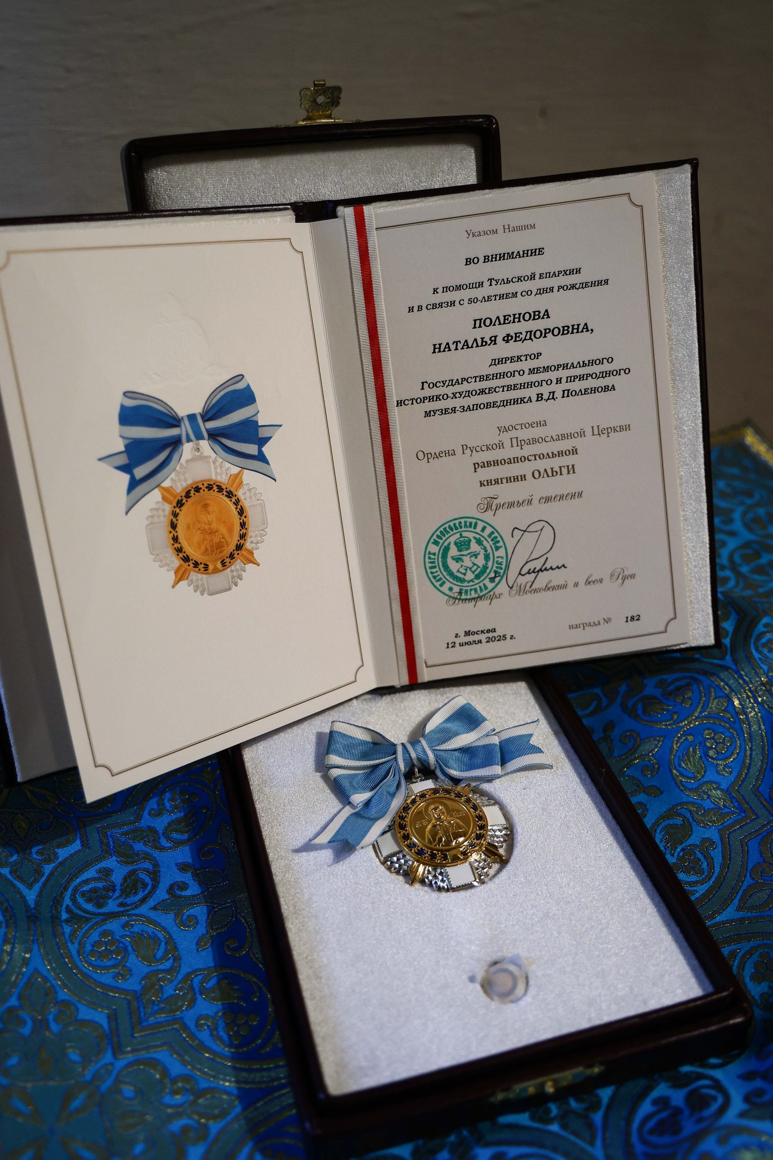 Особо глава Тульской митрополии приветствовал Наталью Федоровну Поленову, директора Государственного мемориального историко-художественного и природного музея-заповедника В. Д. Поленова, и во исполнение послушания Патриарха Московского и всея Руси Кирилла, возложенного на него и на владыку Серафима, поздравил ее с 50-летним юбилеем, и вручил награду Русской Православной Церкви — орден святой равноапостольной княгини Ольги III степени: «Особая и глубокая благодарность Вам, дорогая Наталья Федоровна, за то служение, которое уже более века Ваша семья осуществляет здесь, в Поленово, негасимо тепля лампаду боголюбия, человеколюбия, красотолюбия! И дай Господь Вам ревность апостольскую в этом служении, умножение сил духовных, душевных и телесных, чтобы вместе с Вами и единомысленные сродники по плоти, и единомысленно призываемые красотой Вашего служения соработники и сотрудники были верны традициям, положенным в основание Василием Дмитриевичем Поленовым и Вашей мамой, незабвенной Натальей Николаевной, которая покоится после праведных земных трудов здесь, и за каждой Божественной литургией духом своим вместе с нами и со всеми, кто близ храма сего погребен, ходатайствует пред Богом о том, чтобы мы были верны своему призванию и чувствовали способность привлечь, принять, вместить и удержать благодатные дары Святого Утешителя Духа истины и щедродательно одарять ими весь окружающий мир природы и людей.