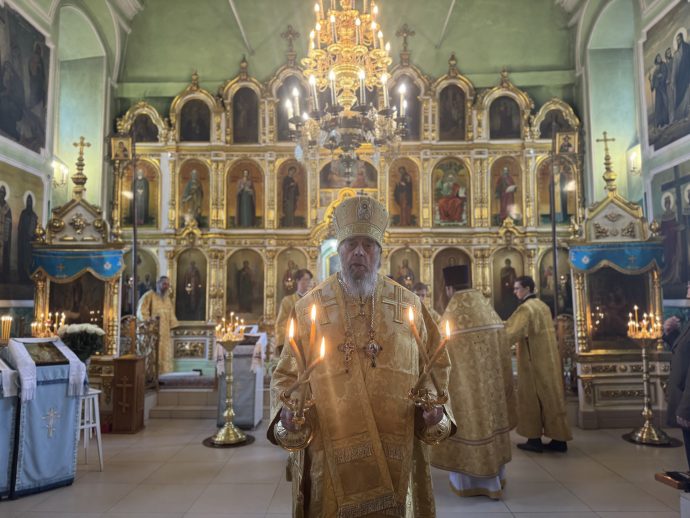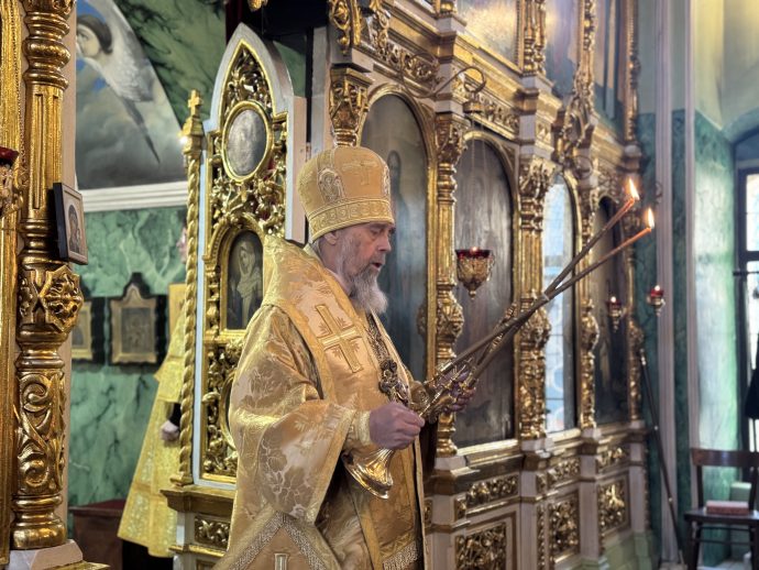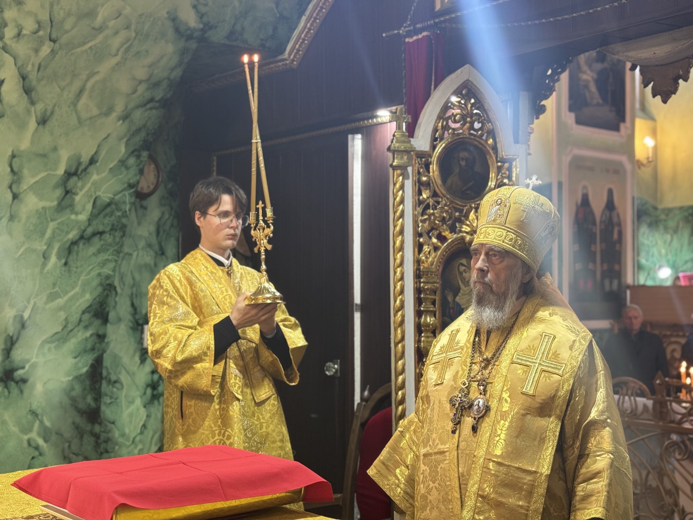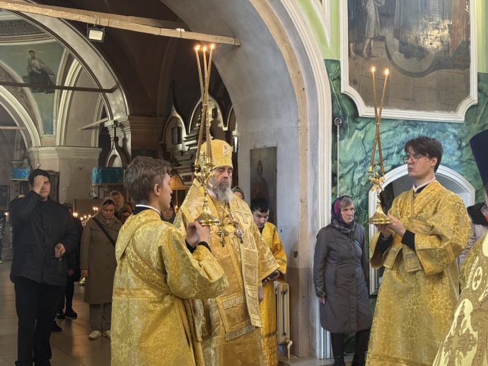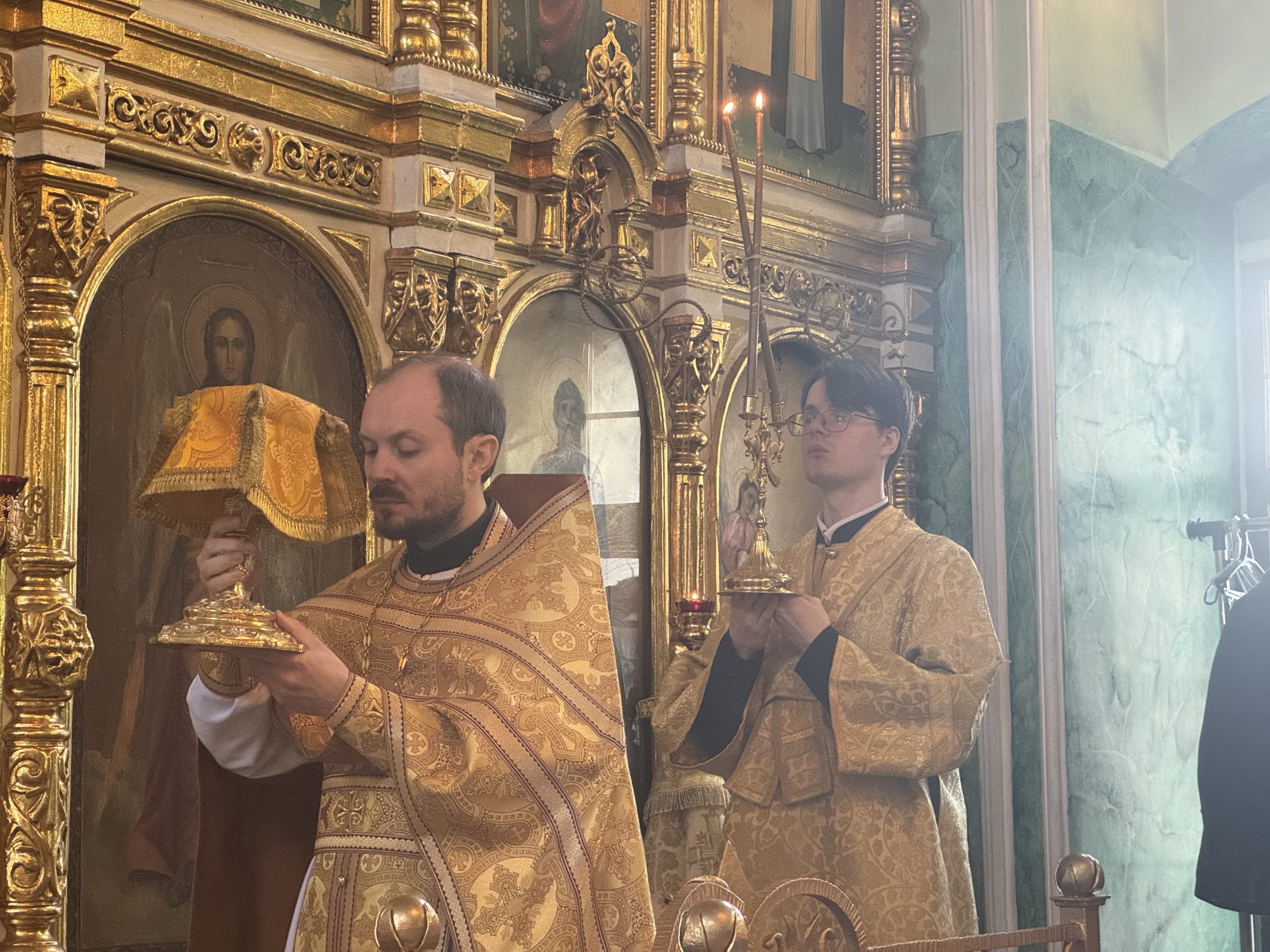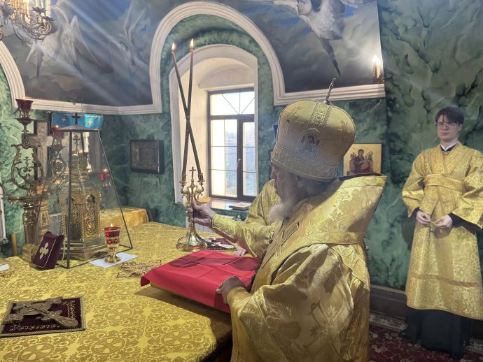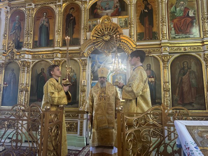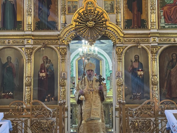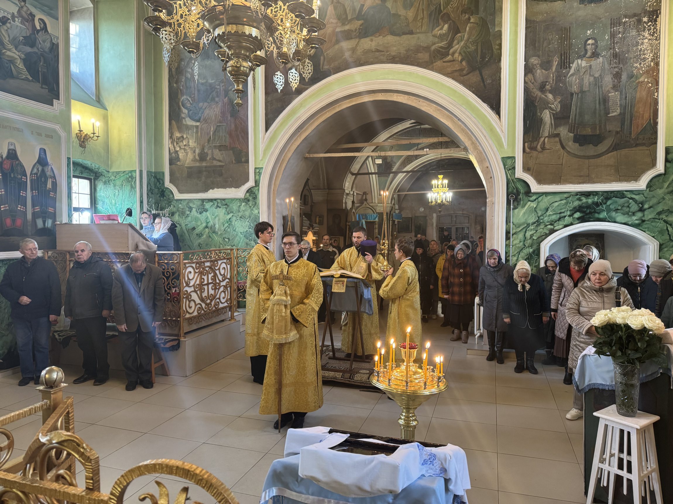 На сугубой ектении вознесены молитвы о благопоспешении христолюбивому Российскому воинству в установлении мира в сию лихую годину, на Святую Русь нашедшую, о мире на Украине, а также о сохранении единства святого Православия.