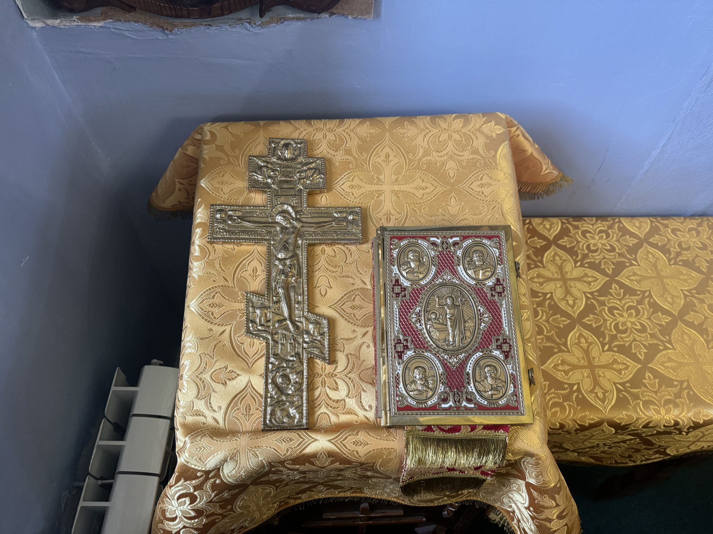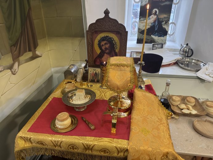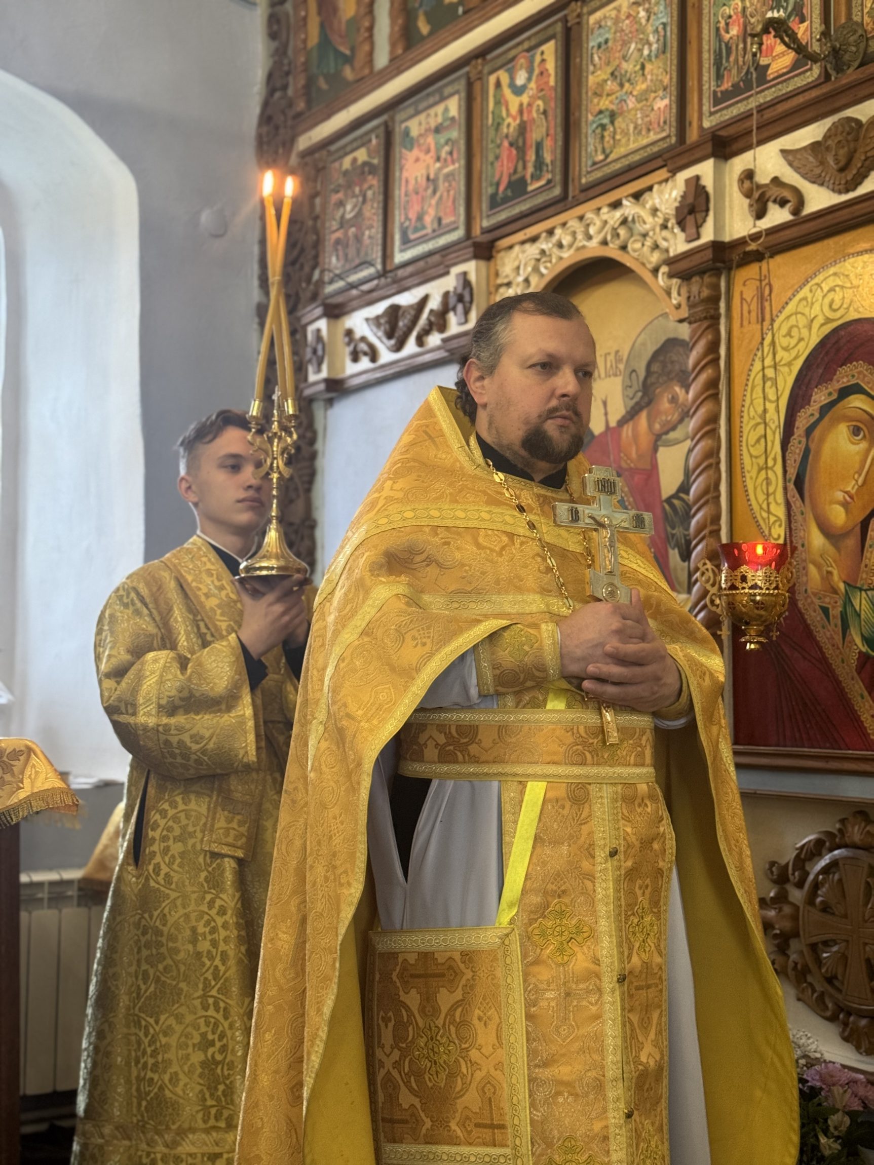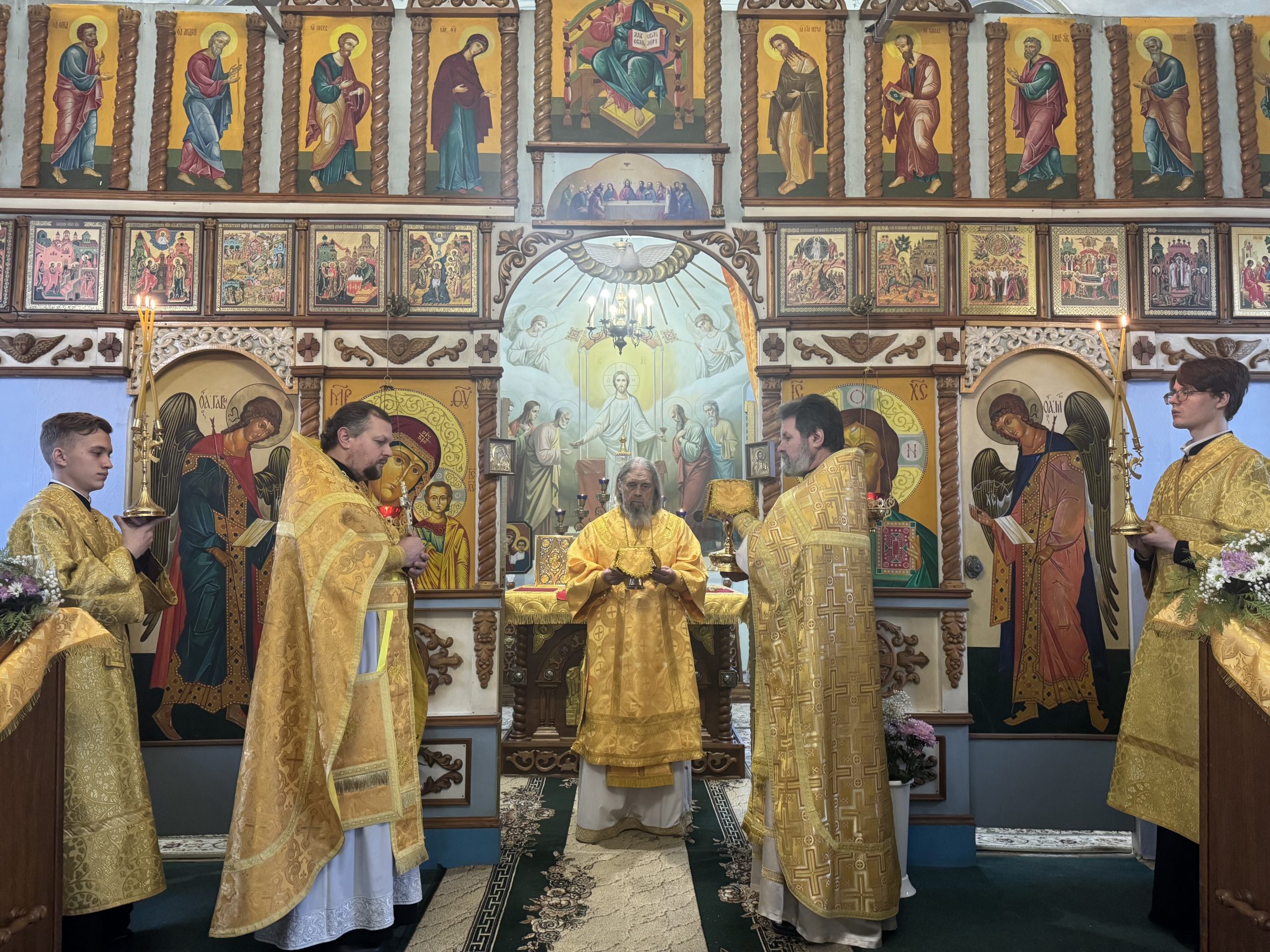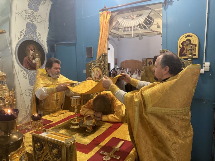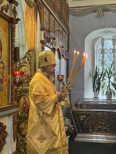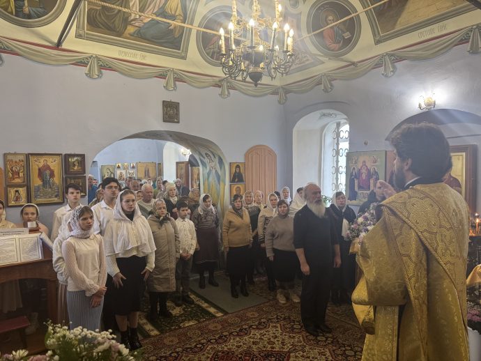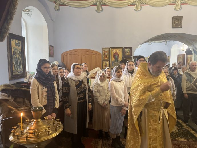 На сугубой ектении вознесены молитвы о благопоспешении христолюбивому Российскому воинству в установлении мира в сию лихую годину, на Святую Русь нашедшую, о мире на Украине, а также о сохранении единства святого Православия.