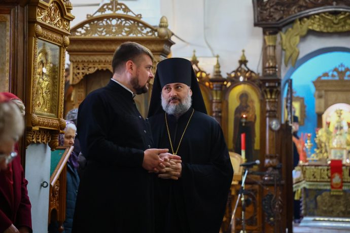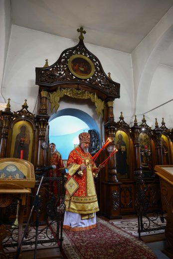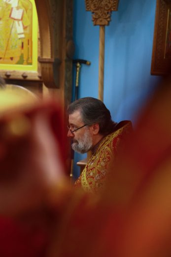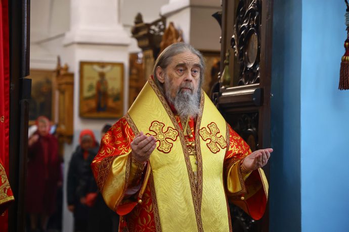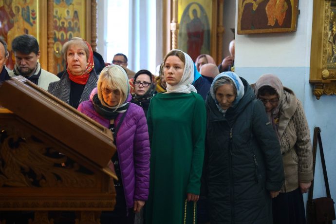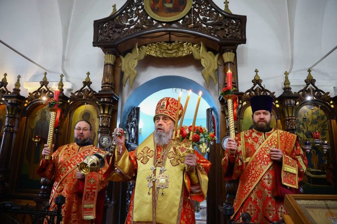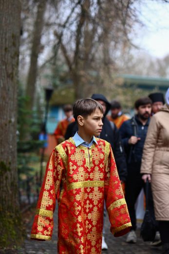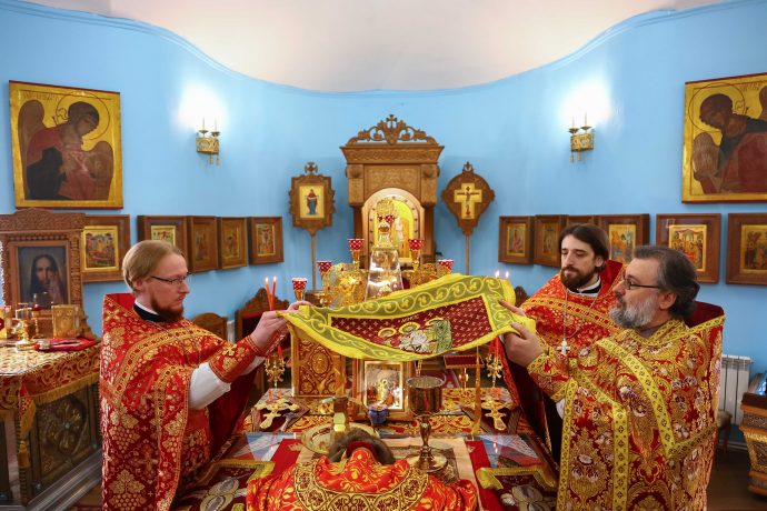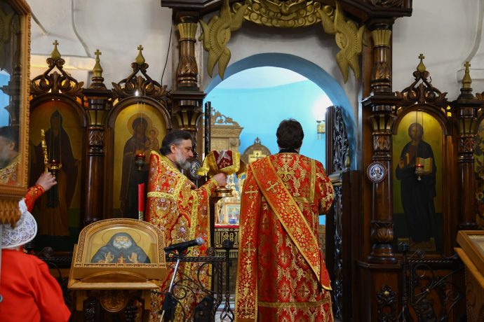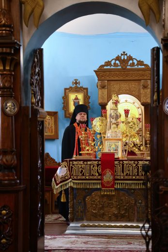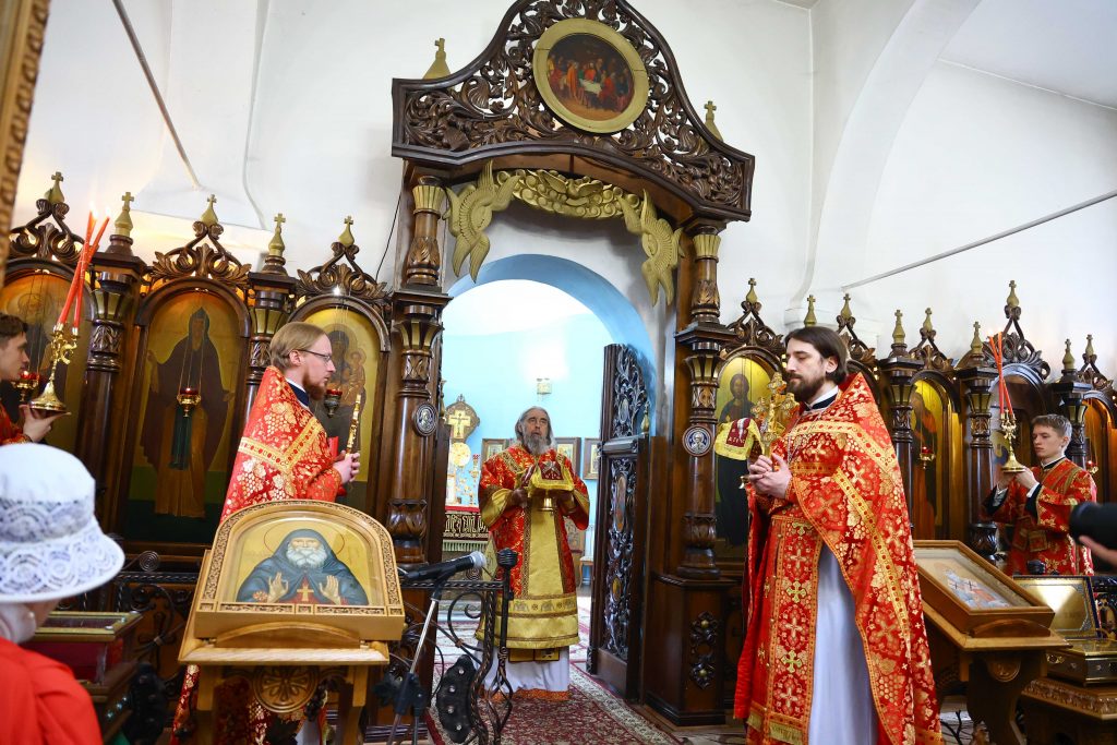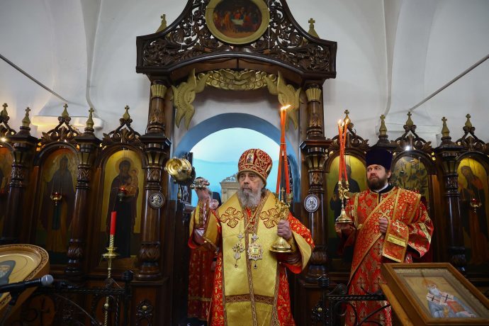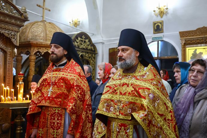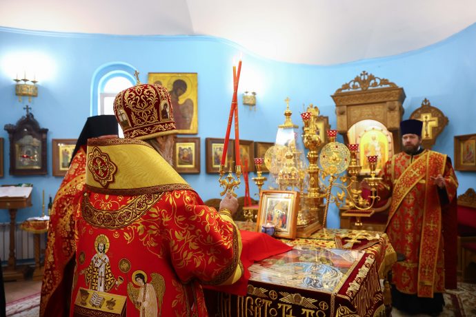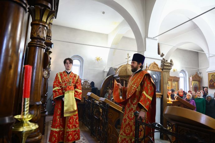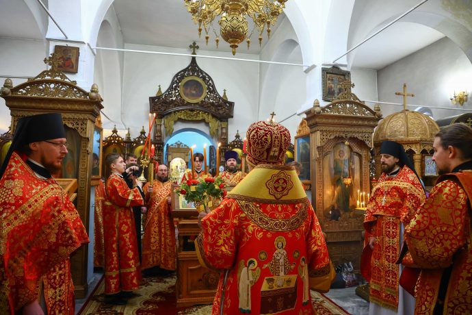 На сугубой ектении вознесены молитвы о благопоспешении христолюбивому Российскому воинству в установлении мира в сию лихую годину, на Святую Русь нашедшую, о мире на Украине, а также о сохранении единства святого Православия.