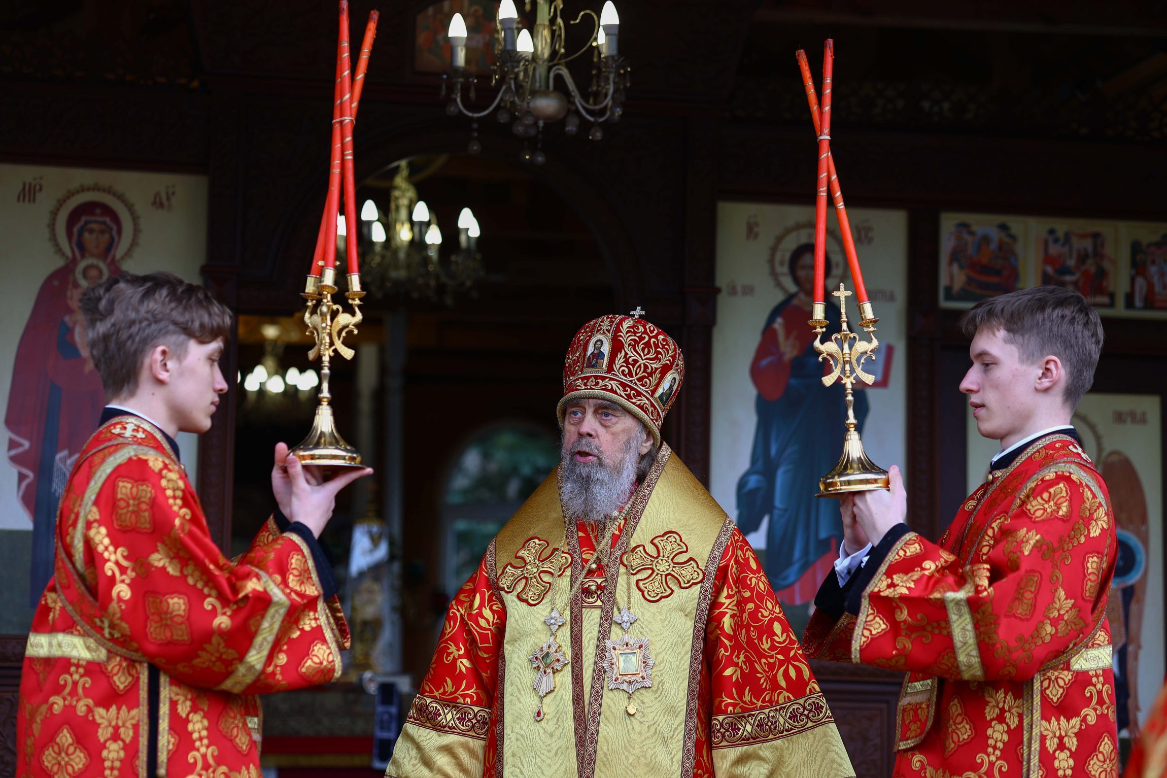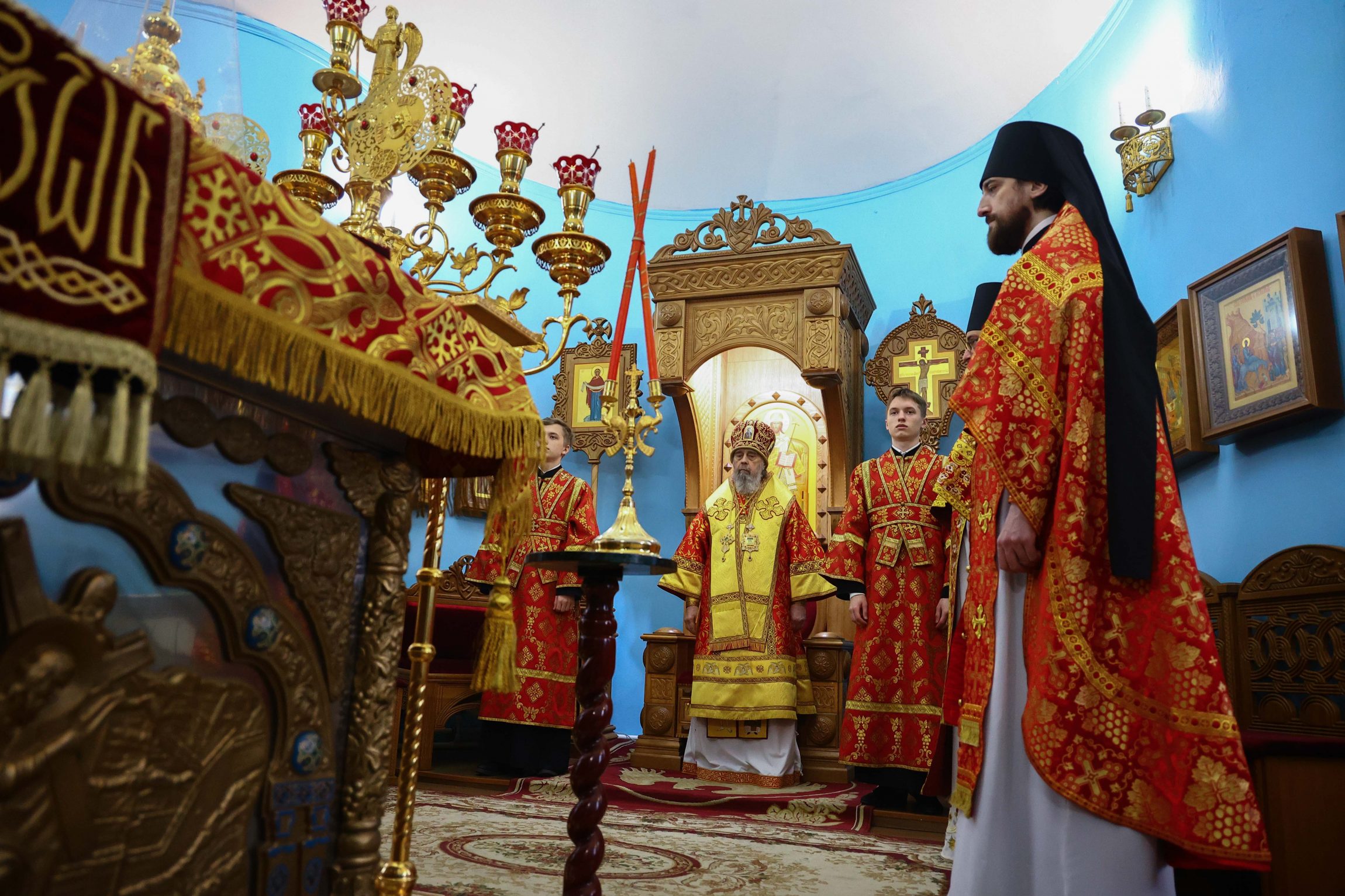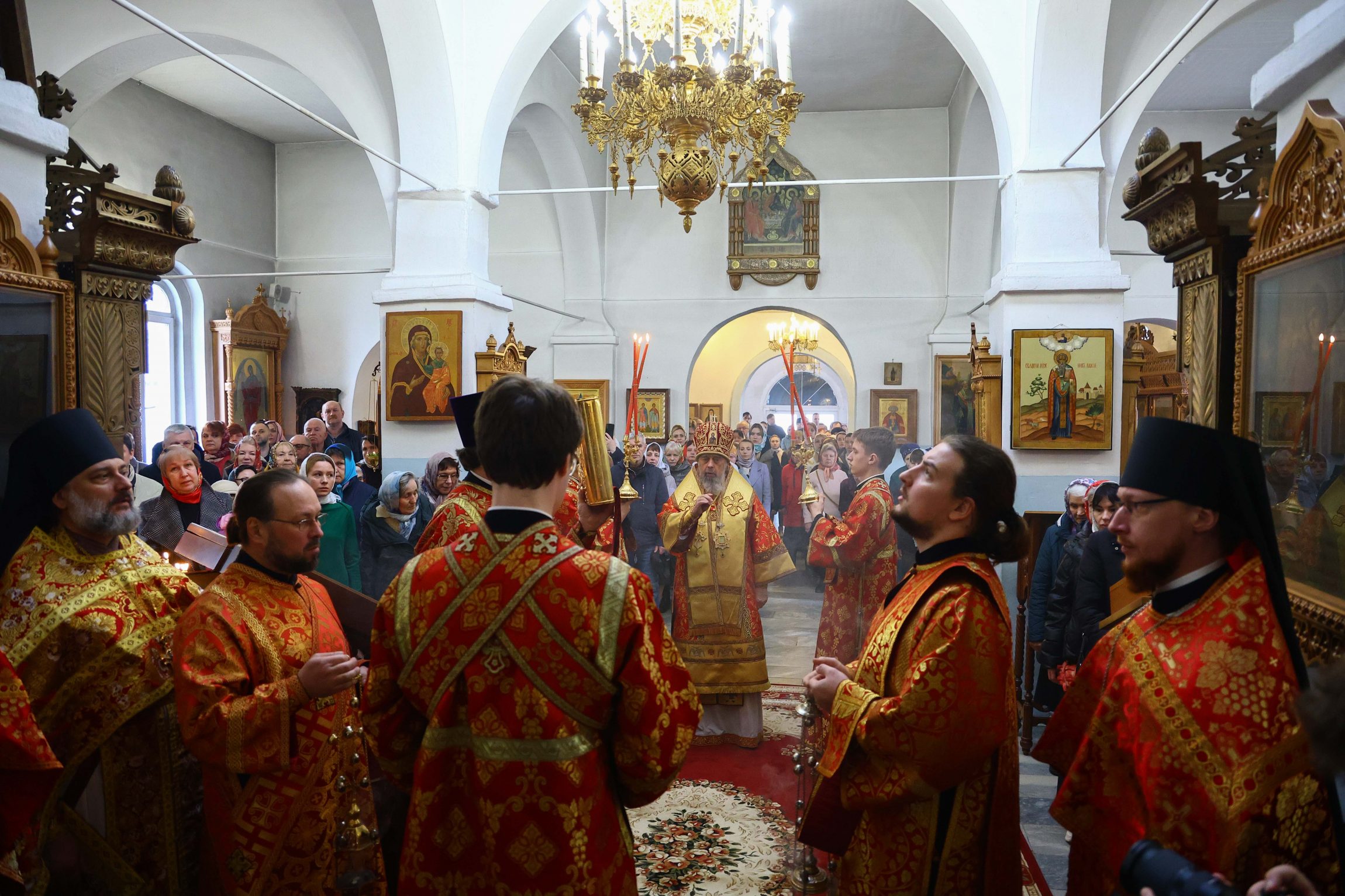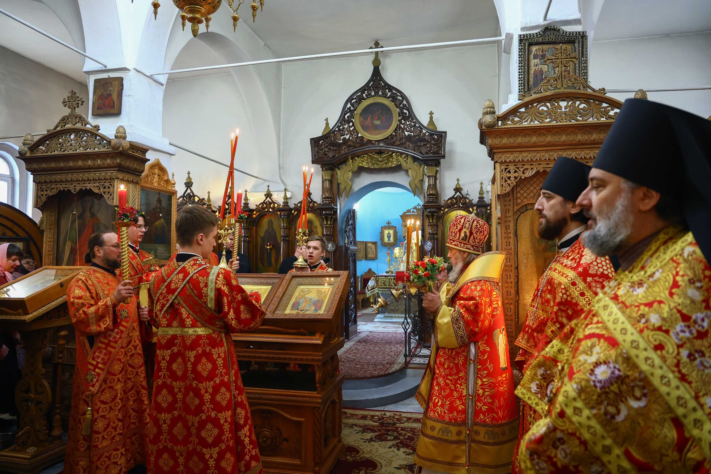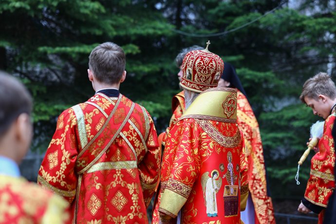 На сугубой ектении вознесены молитвы о благопоспешении христолюбивому Российскому воинству в установлении мира в сию лихую годину, на Святую Русь нашедшую, о мире на Украине, а также о сохранении единства святого Православия.