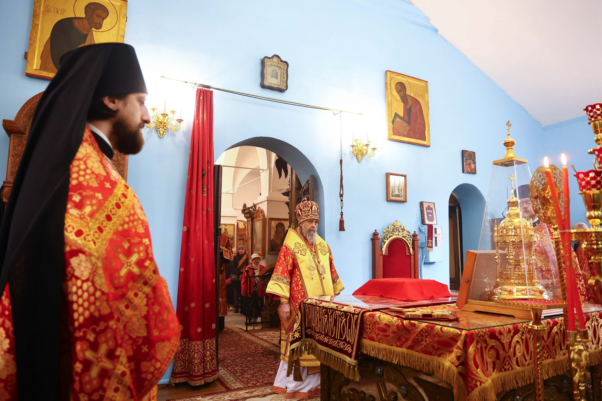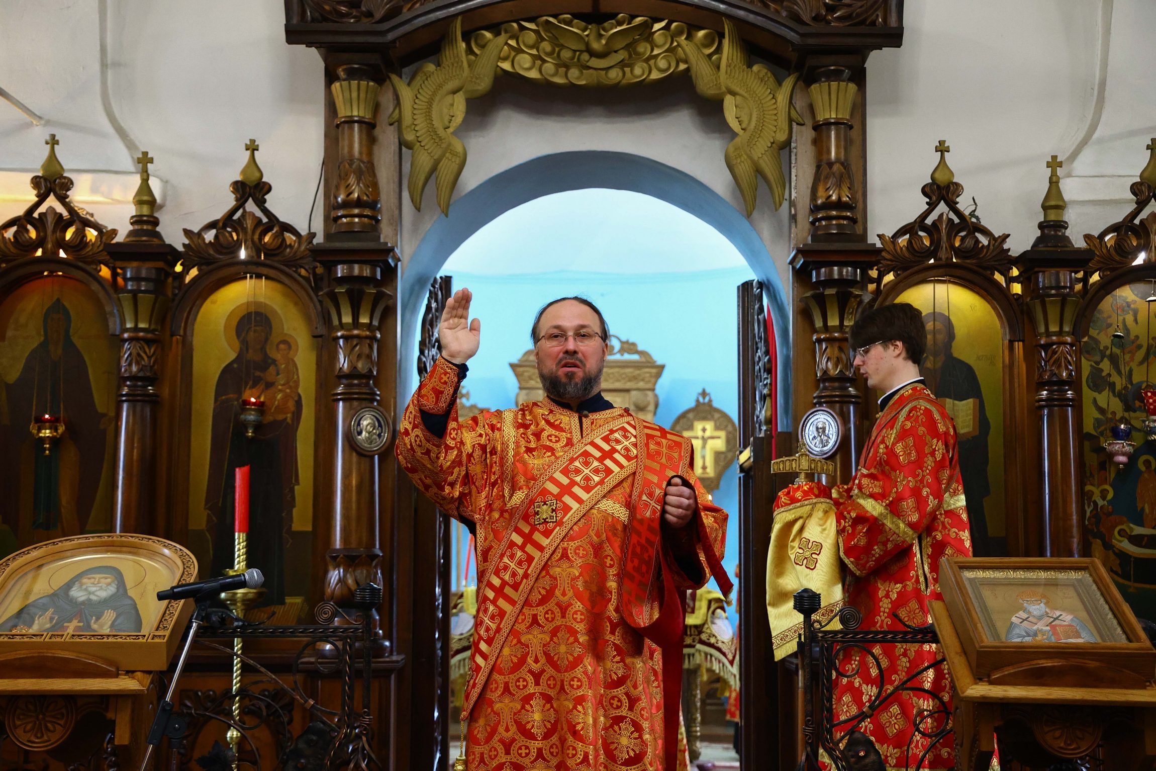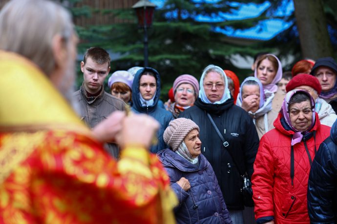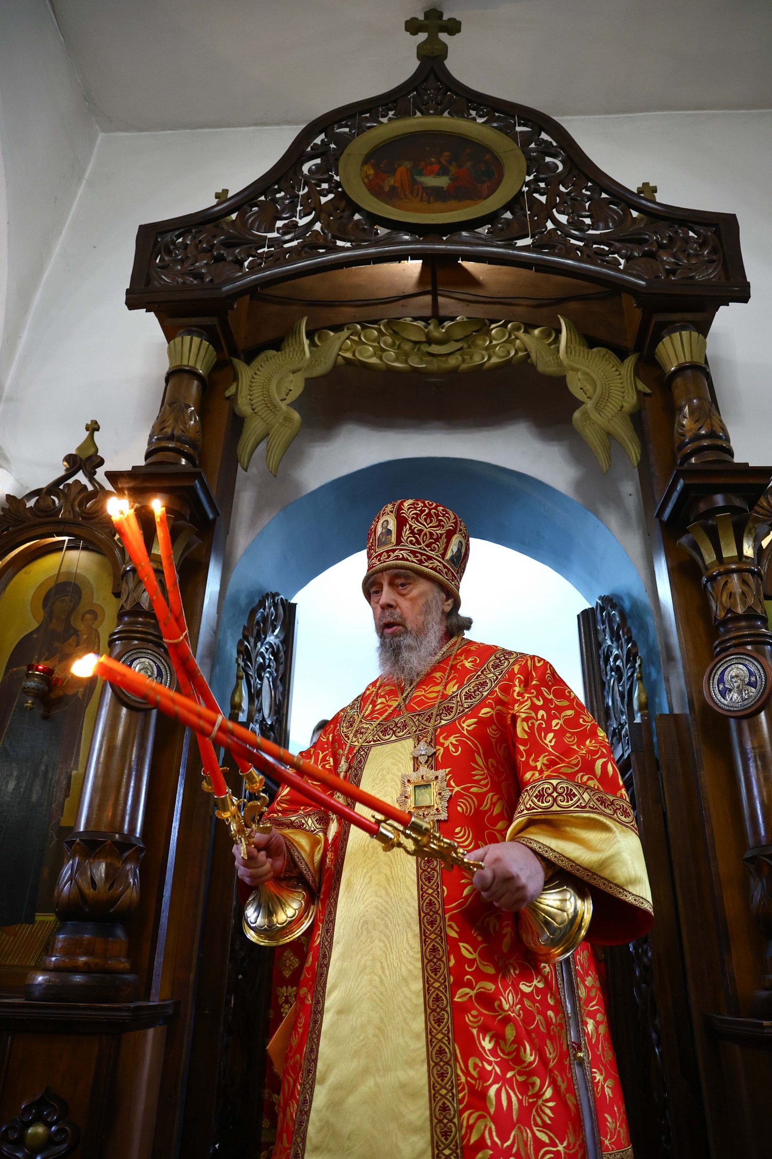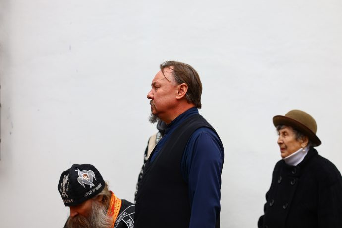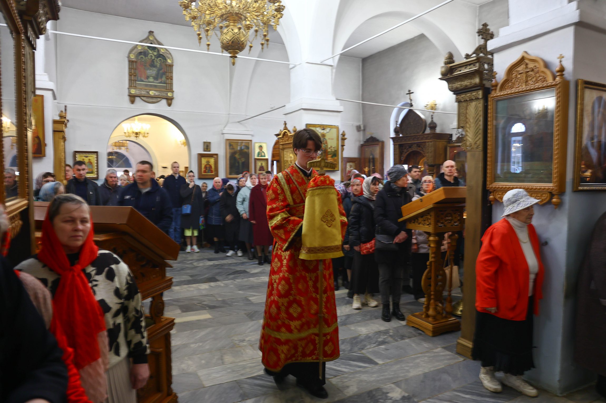 На сугубой ектении вознесены молитвы о благопоспешении христолюбивому Российскому воинству в установлении мира в сию лихую годину, на Святую Русь нашедшую, о мире на Украине, а также о сохранении единства святого Православия.
